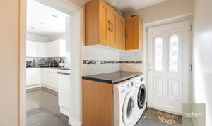 The contemporary kitchen is thoughtfully designed with ample storage and sleek finishes, making meal preparation a delight, and the adjacent utility room adds further practicality for busy households.