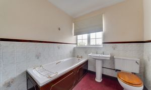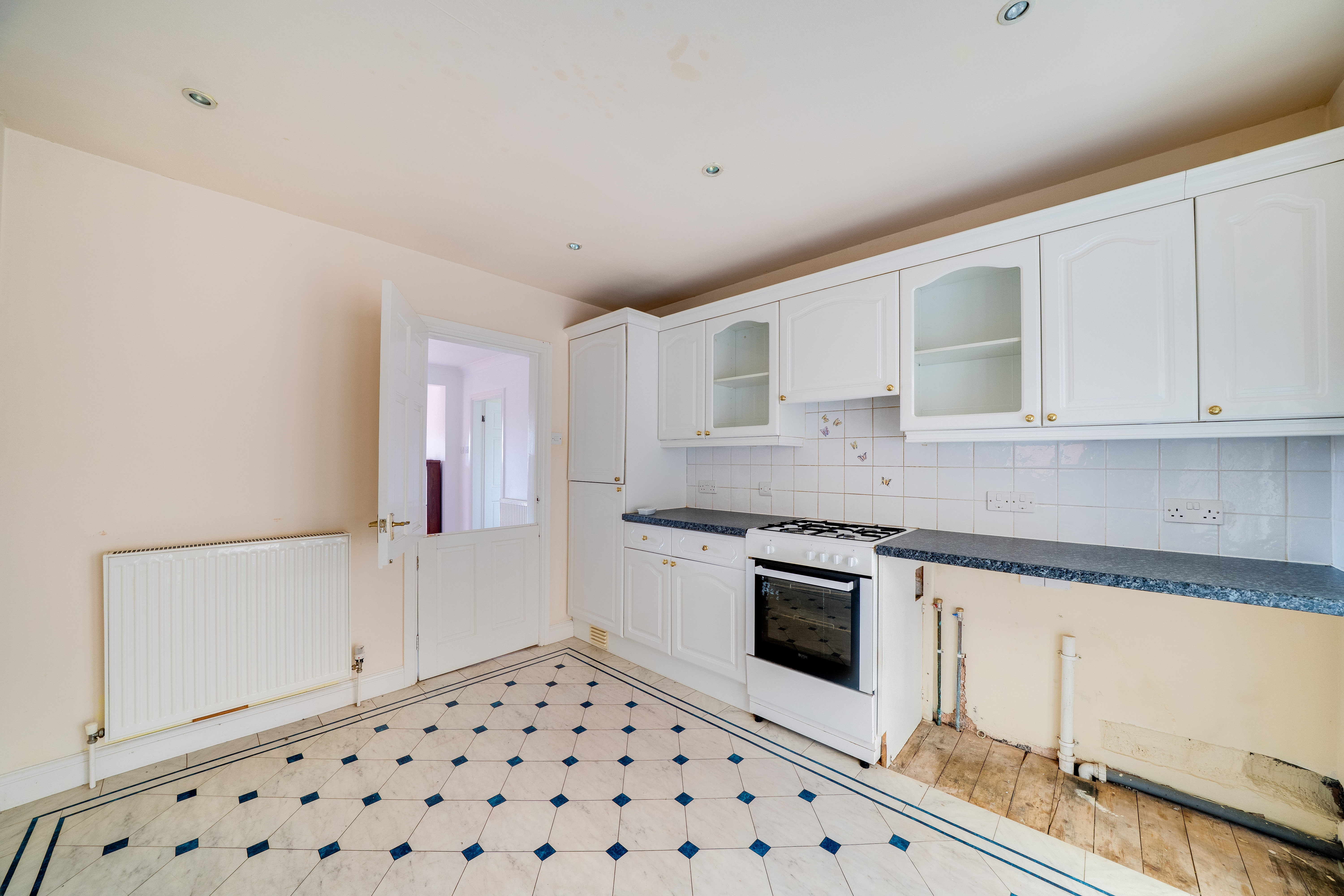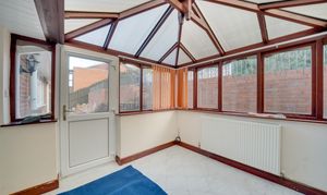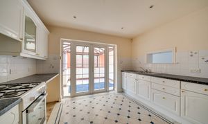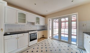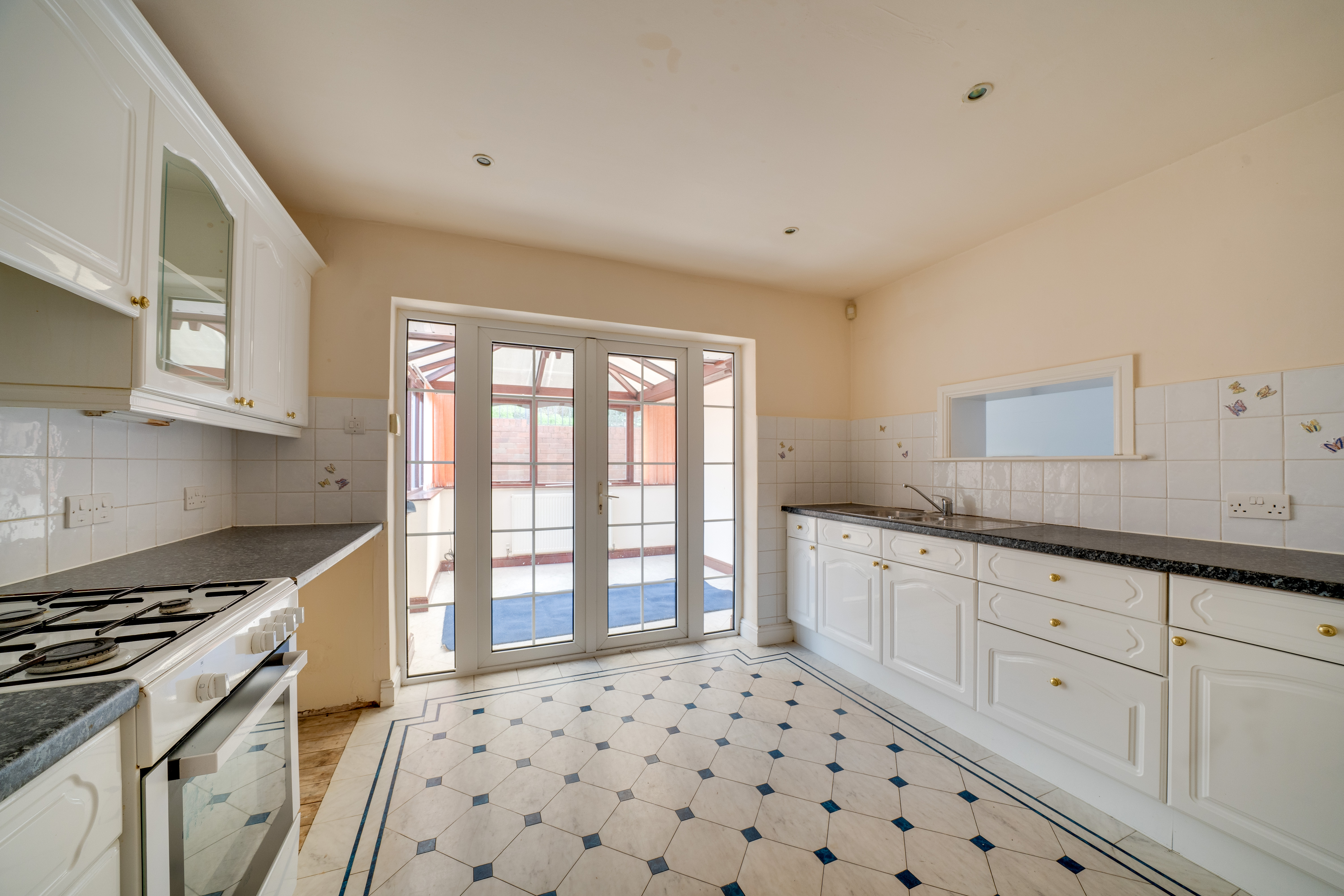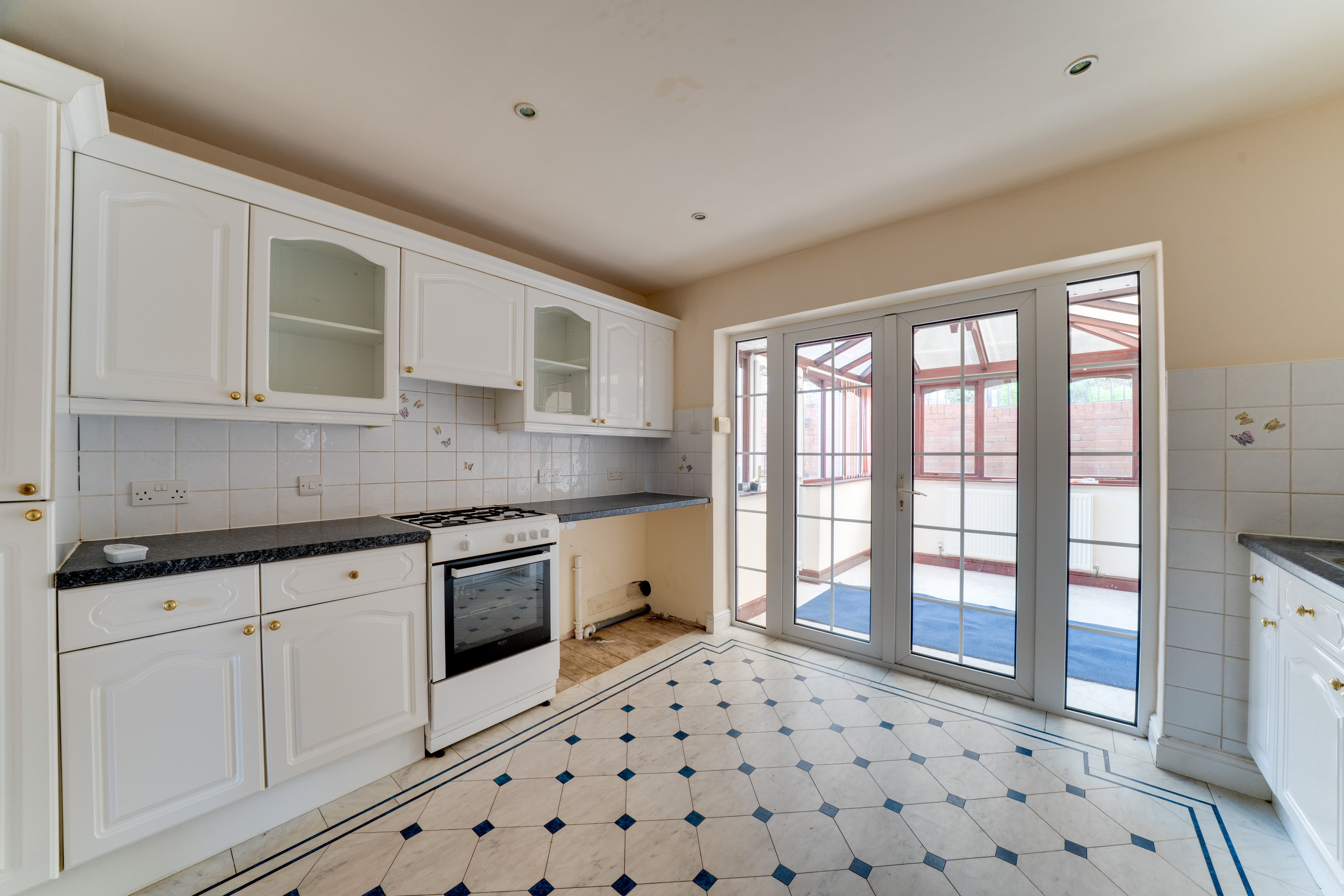 The kitchen is located to the rear of the property and offers extensive storage through a range of white wall and base units fitted to either side of the room, along with integrated appliances including an oven, hob, extractor and fridge/freezer. Double glazed doors lead through to a sunroom, which would make an ideal breakfast or informal dining space.