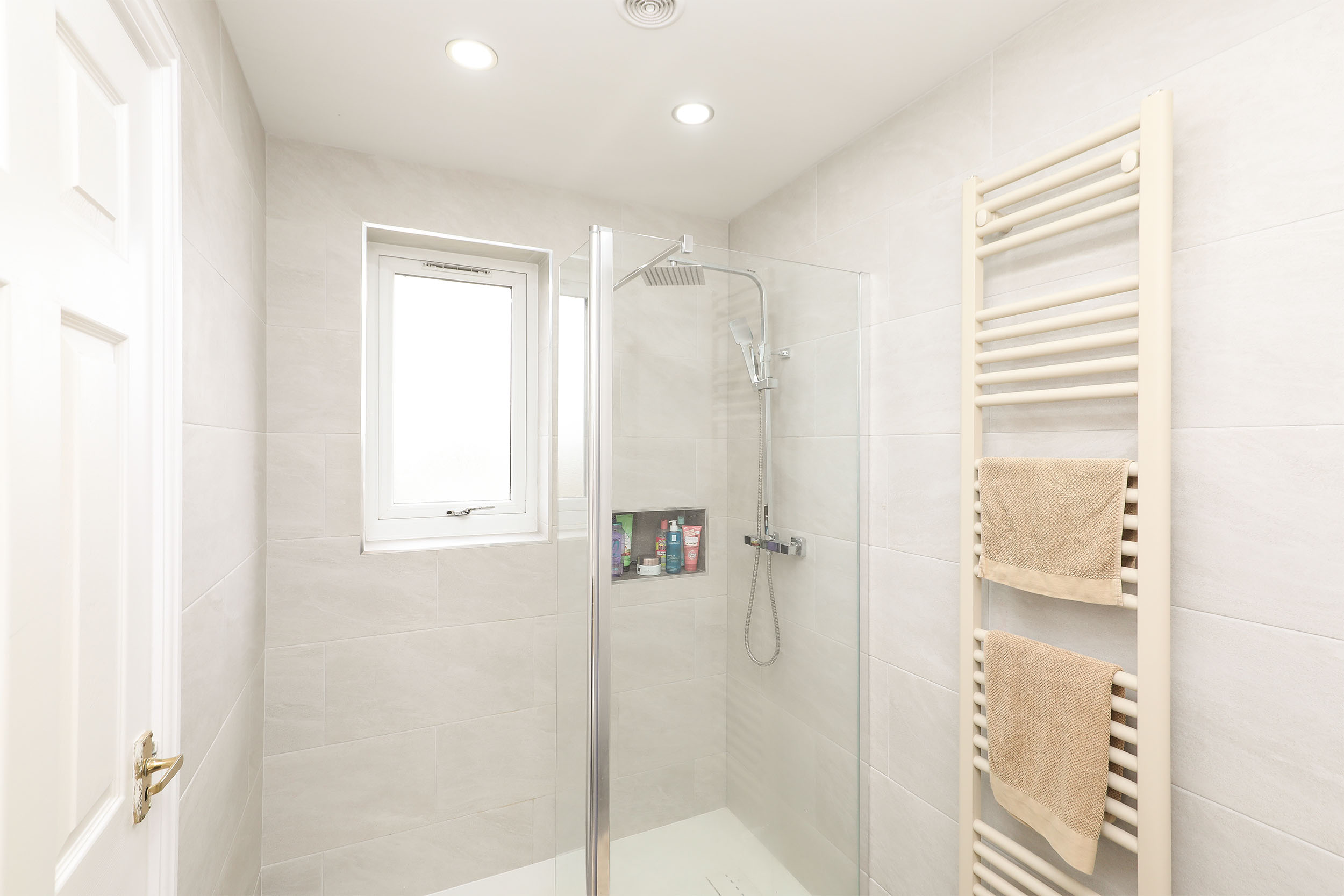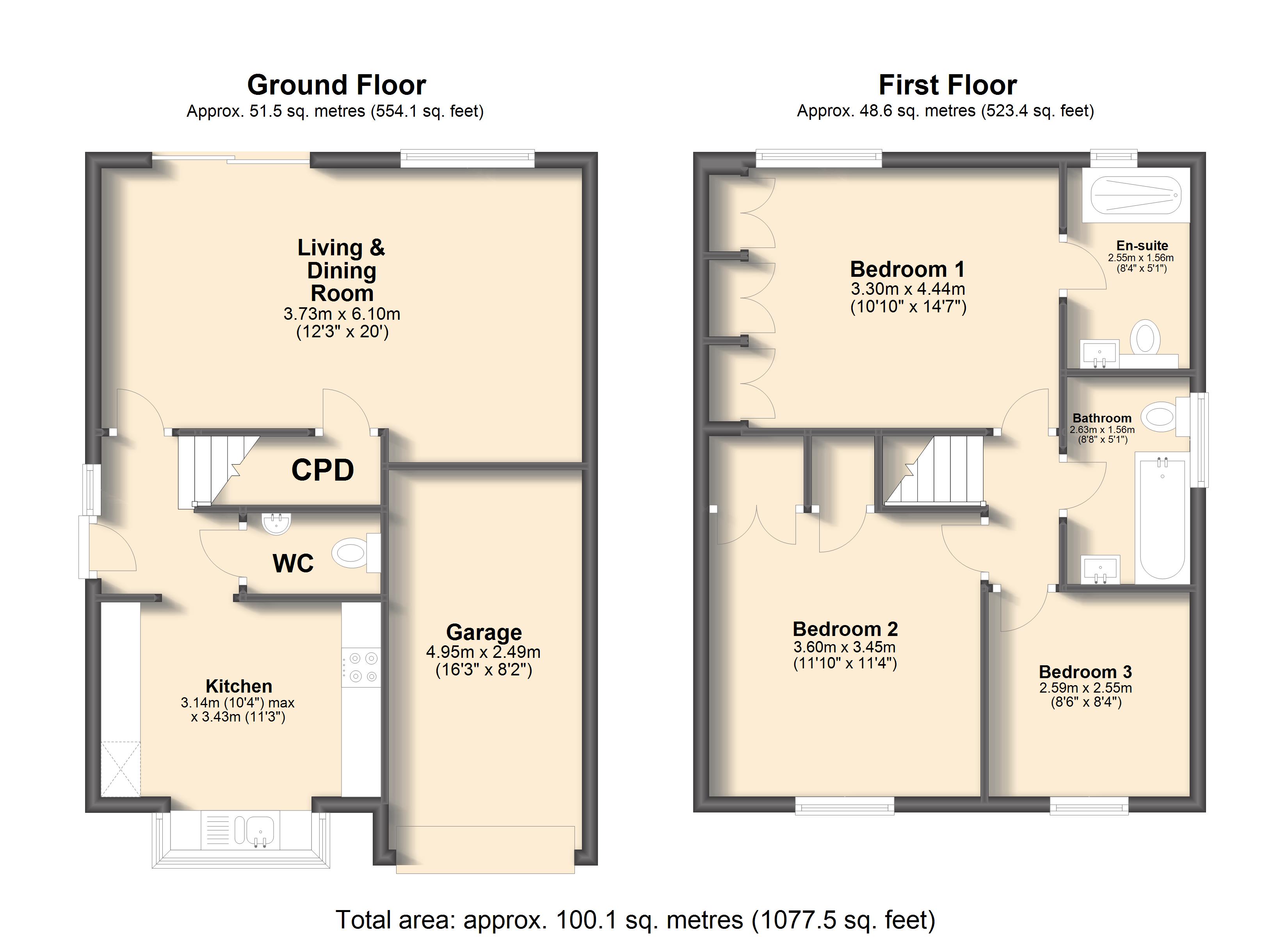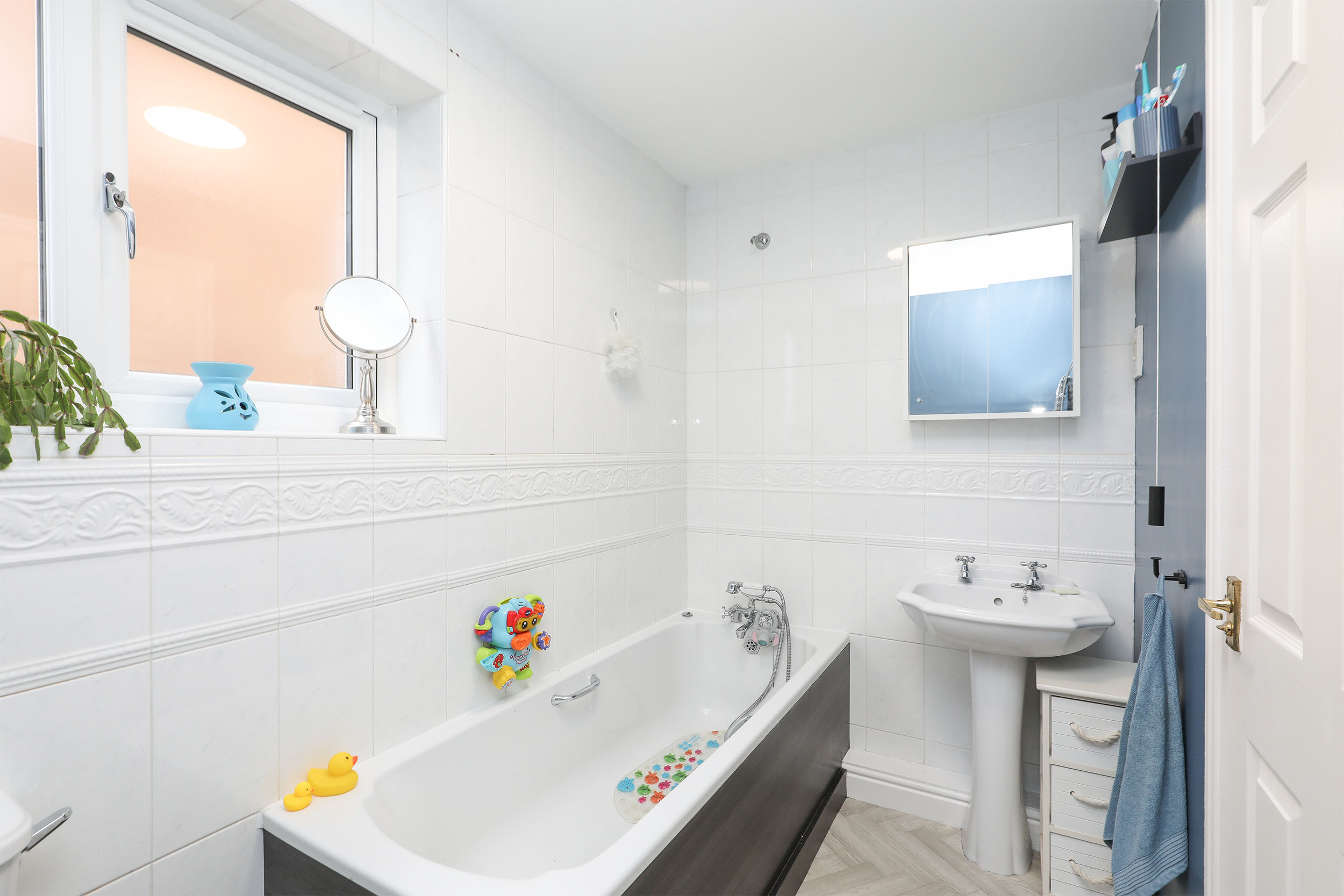 Upstairs, the first floor hosts three well-proportioned bedrooms. The principal bedroom benefits from fitted wardrobes and a private en-suite shower room, while the remaining two bedrooms are generous doubles, offering flexibility for family living, guest accommodation, or home working. A family bathroom completes the first floor, fitted with an elegant three-piece suite.