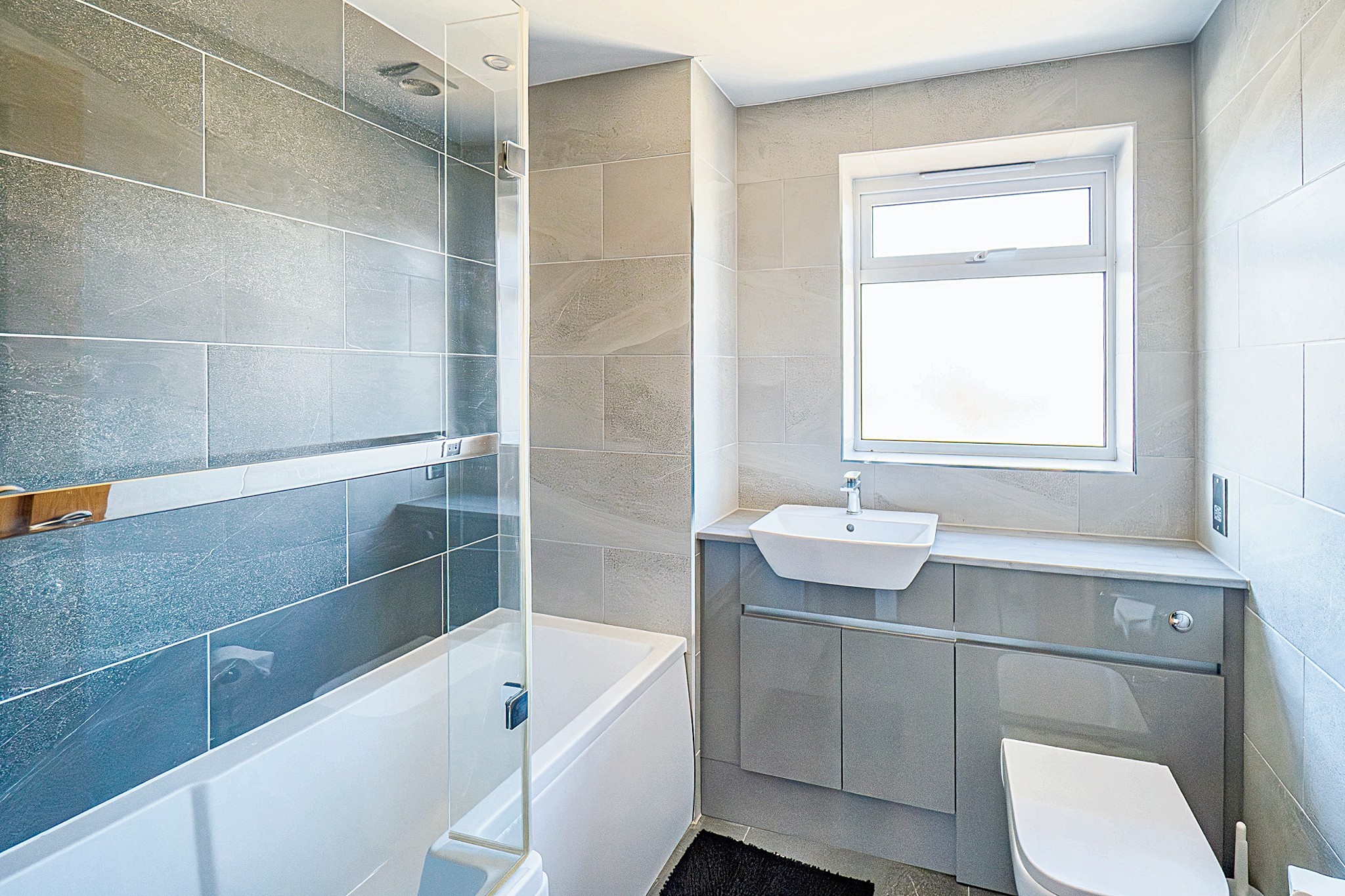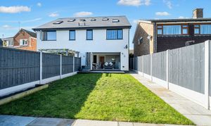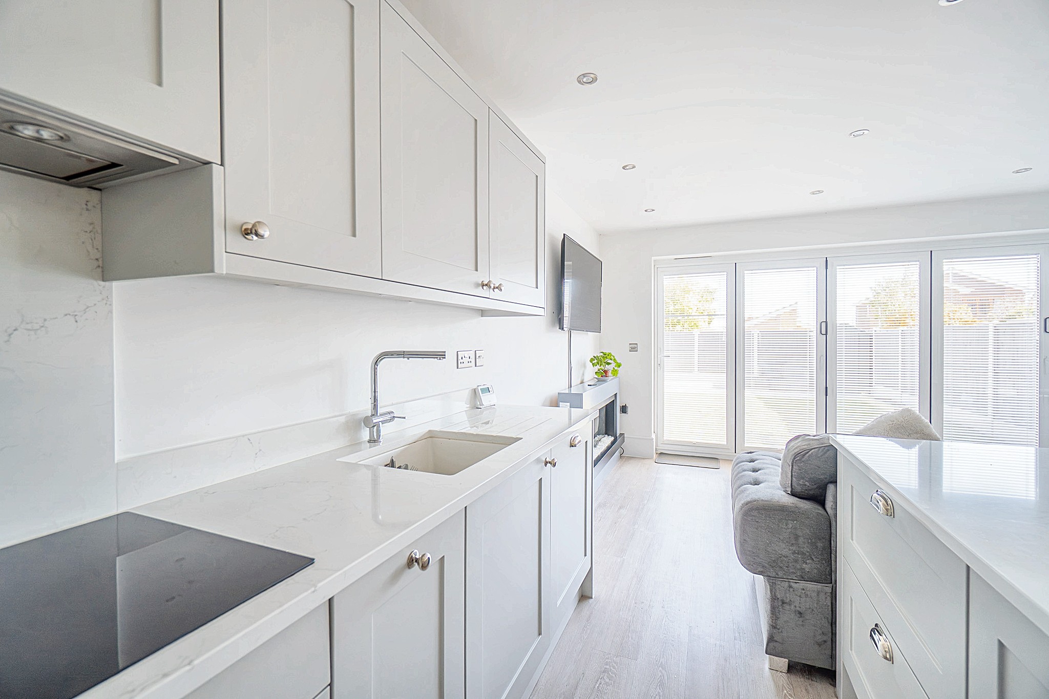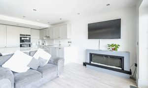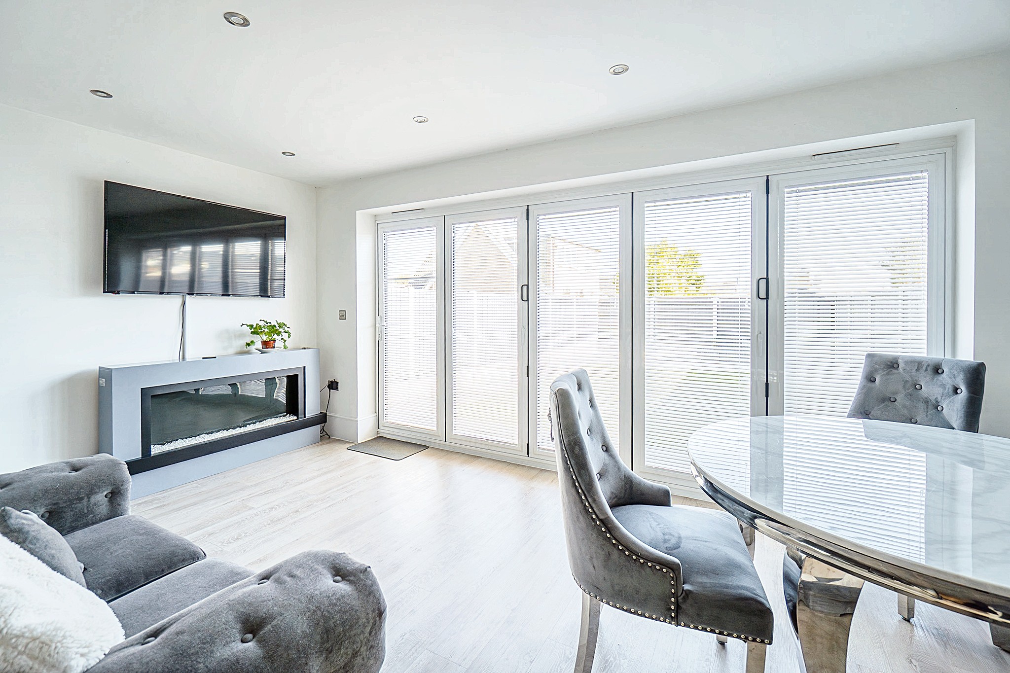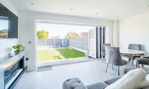 Step inside and be greeted by the contemporary open-plan family room and kitchen, complete with bi-folding doors that lead to the rear garden, perfect for entertaining friends and family. The luxurious modern kitchen features quartz worktops, an island unit, and is a chef's dream come true.