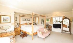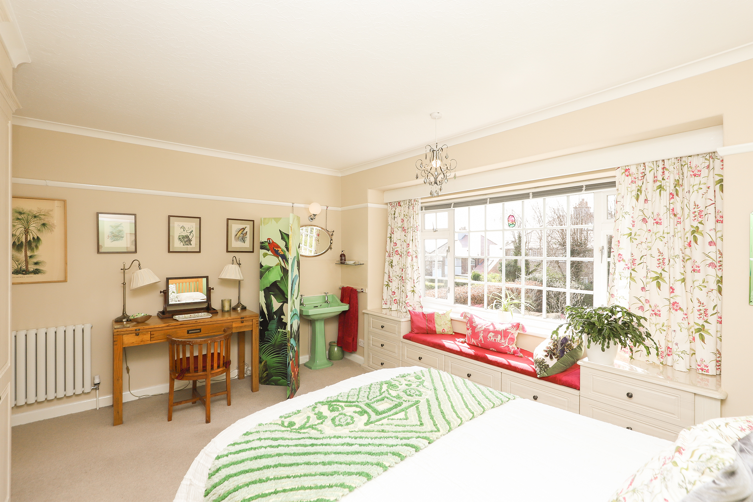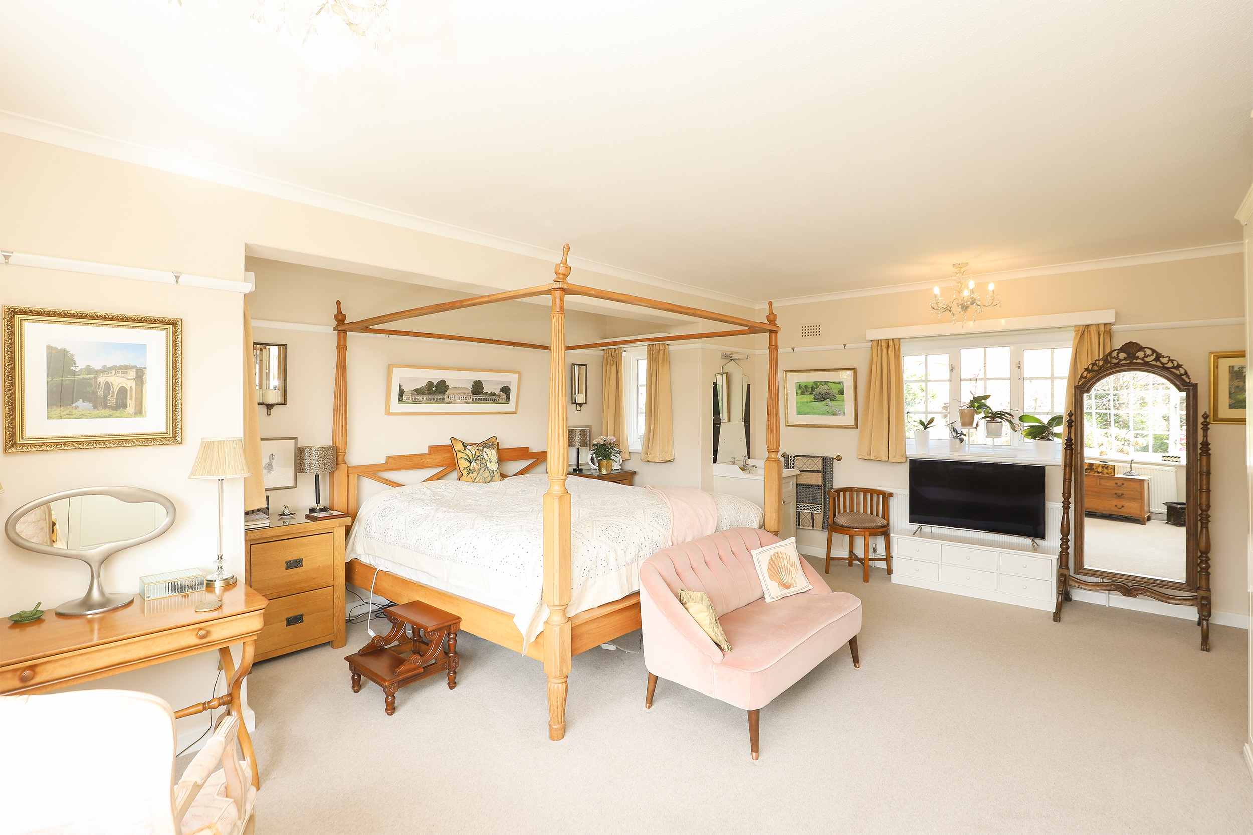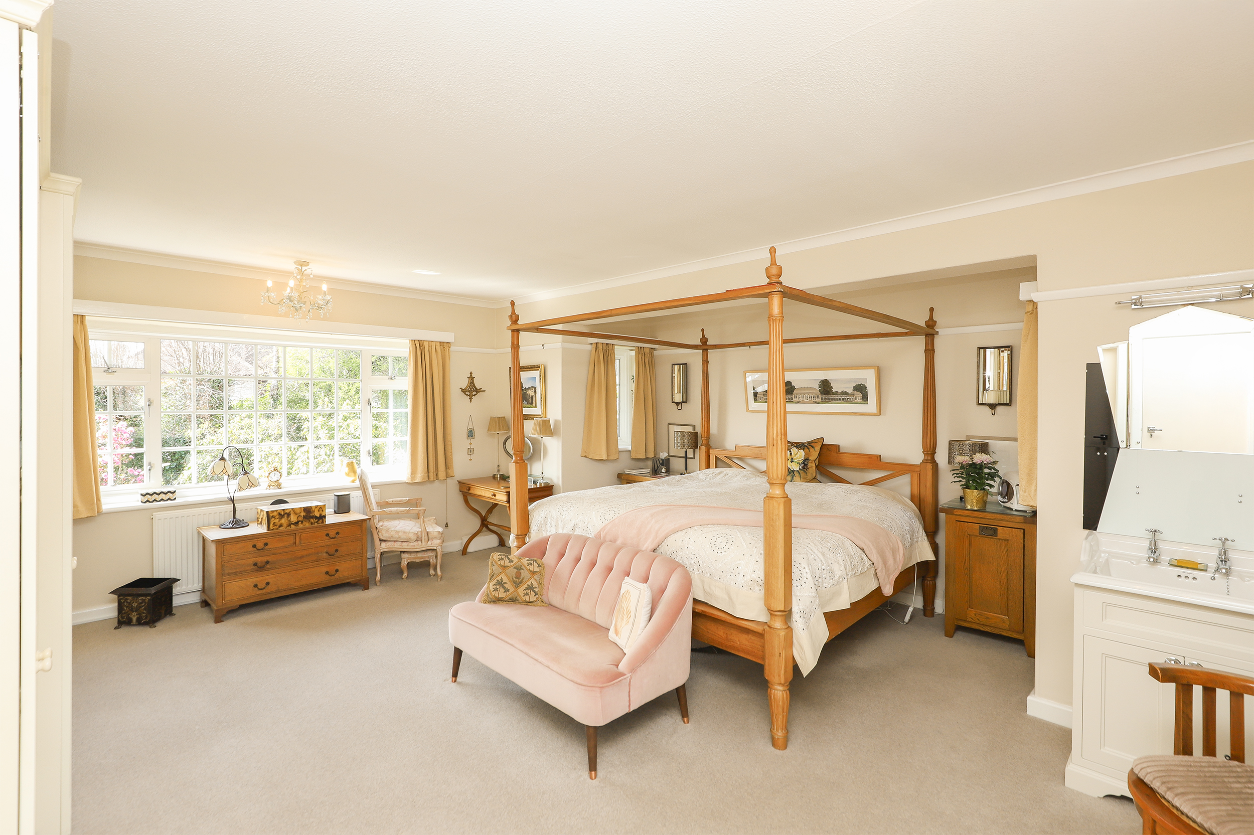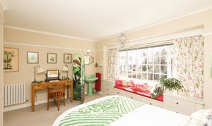 A staircase rises to a half-landing where an original leaded light window, now triple-glazed, forms a striking feature. The principal bedroom includes fitted wardrobes and an en-suite bathroom with underfloor heating. Three further double bedrooms are provided, each equipped with a washbasin. Three of the bedrooms have fitted wardrobes, and the second bedroom also benefits from a window seat with built-in drawer storage. A separate shower room serves the remaining bedrooms. All bathrooms, fittings, and bedroom washbasins are supplied by Burlington.
