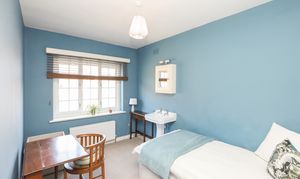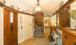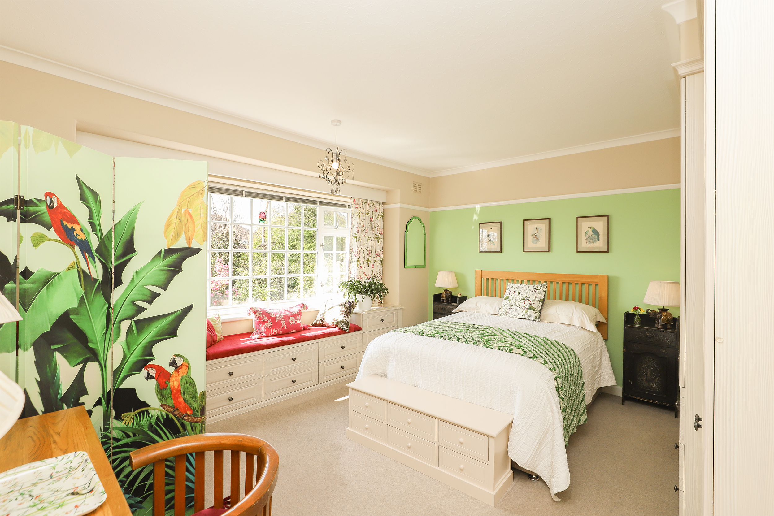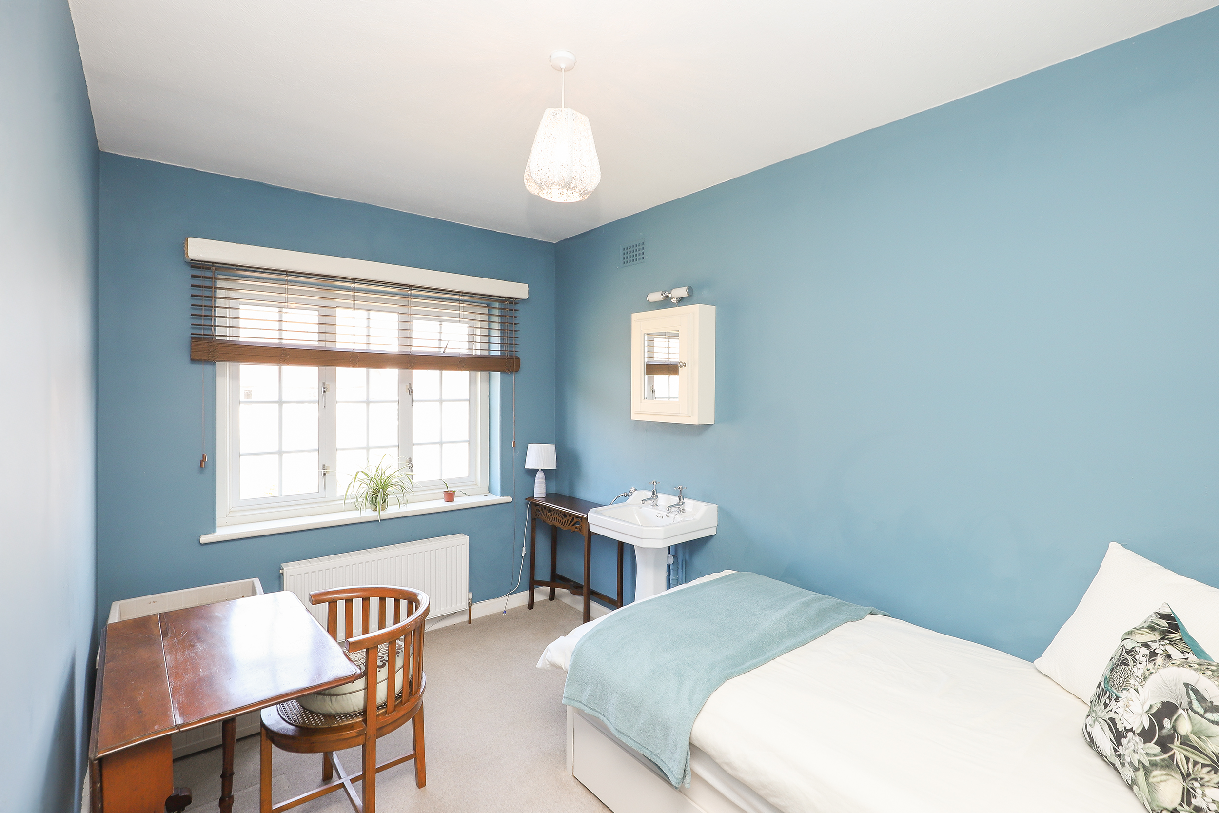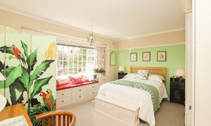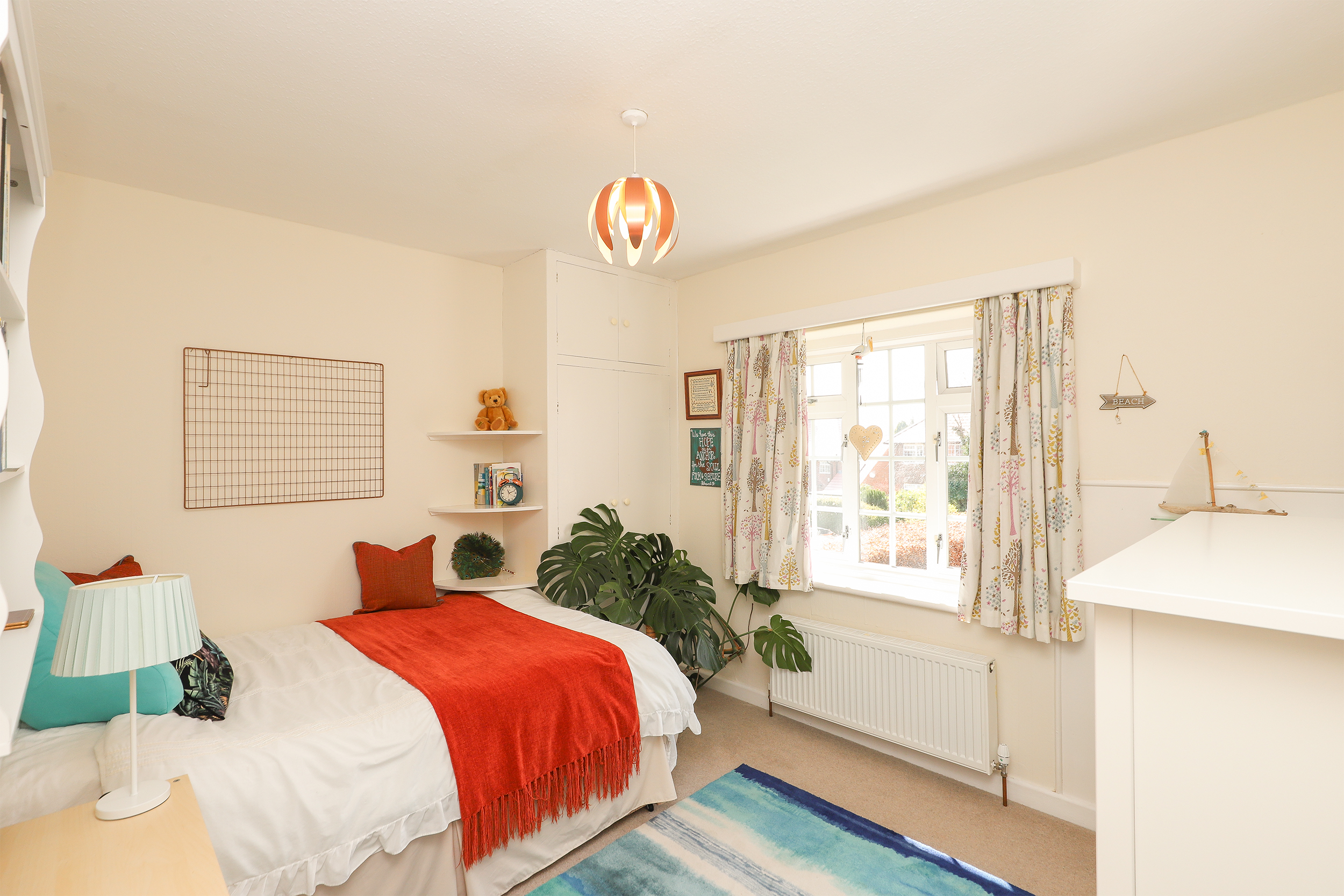 A staircase rises to a half-landing where an original leaded light window, now triple-glazed, forms a striking feature. The principal bedroom includes fitted wardrobes and an en-suite bathroom with underfloor heating. Three further double bedrooms are provided, each equipped with a washbasin. Three of the bedrooms have fitted wardrobes, and the second bedroom also benefits from a window seat with built-in drawer storage. A separate shower room serves the remaining bedrooms. All bathrooms, fittings, and bedroom washbasins are supplied by Burlington.