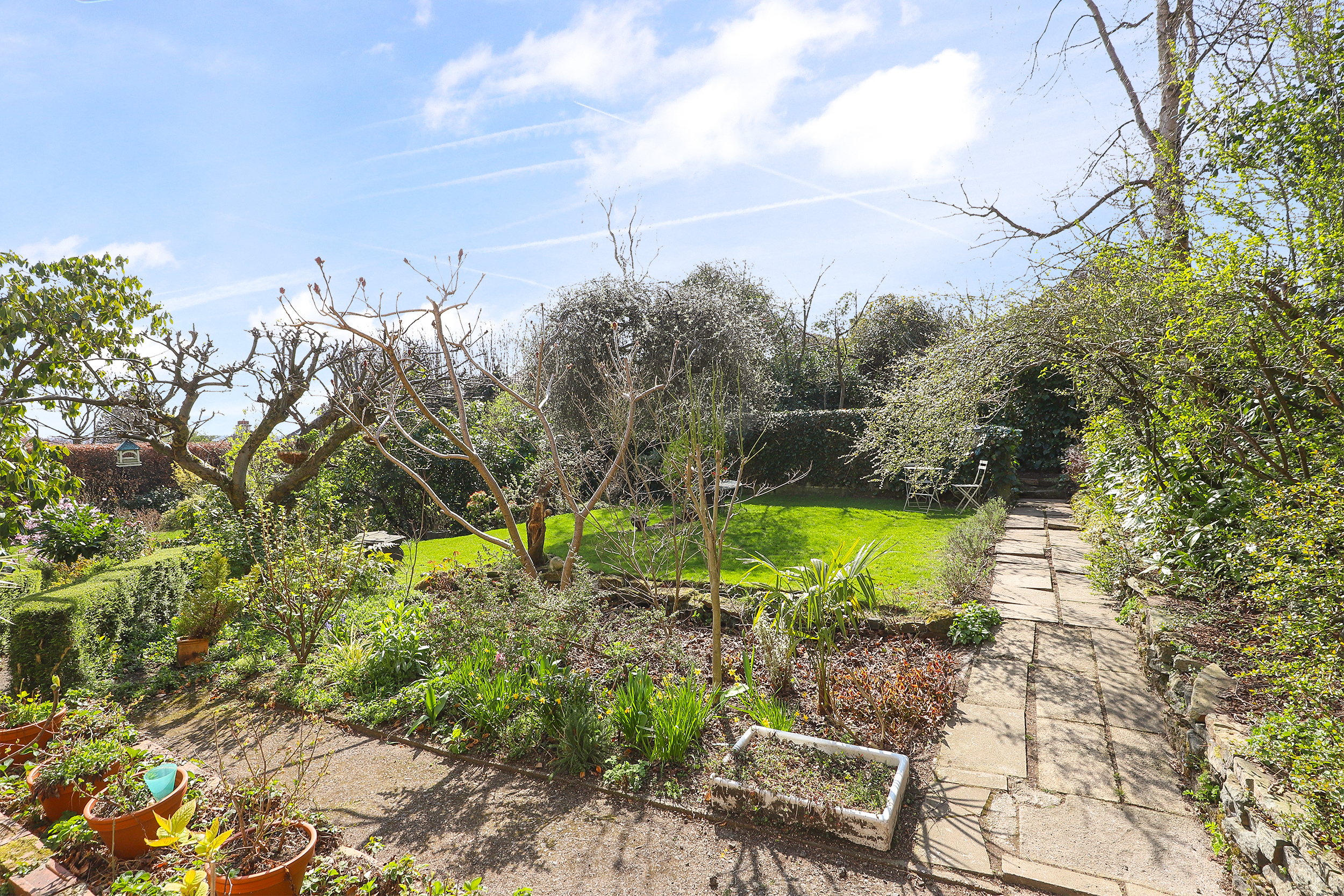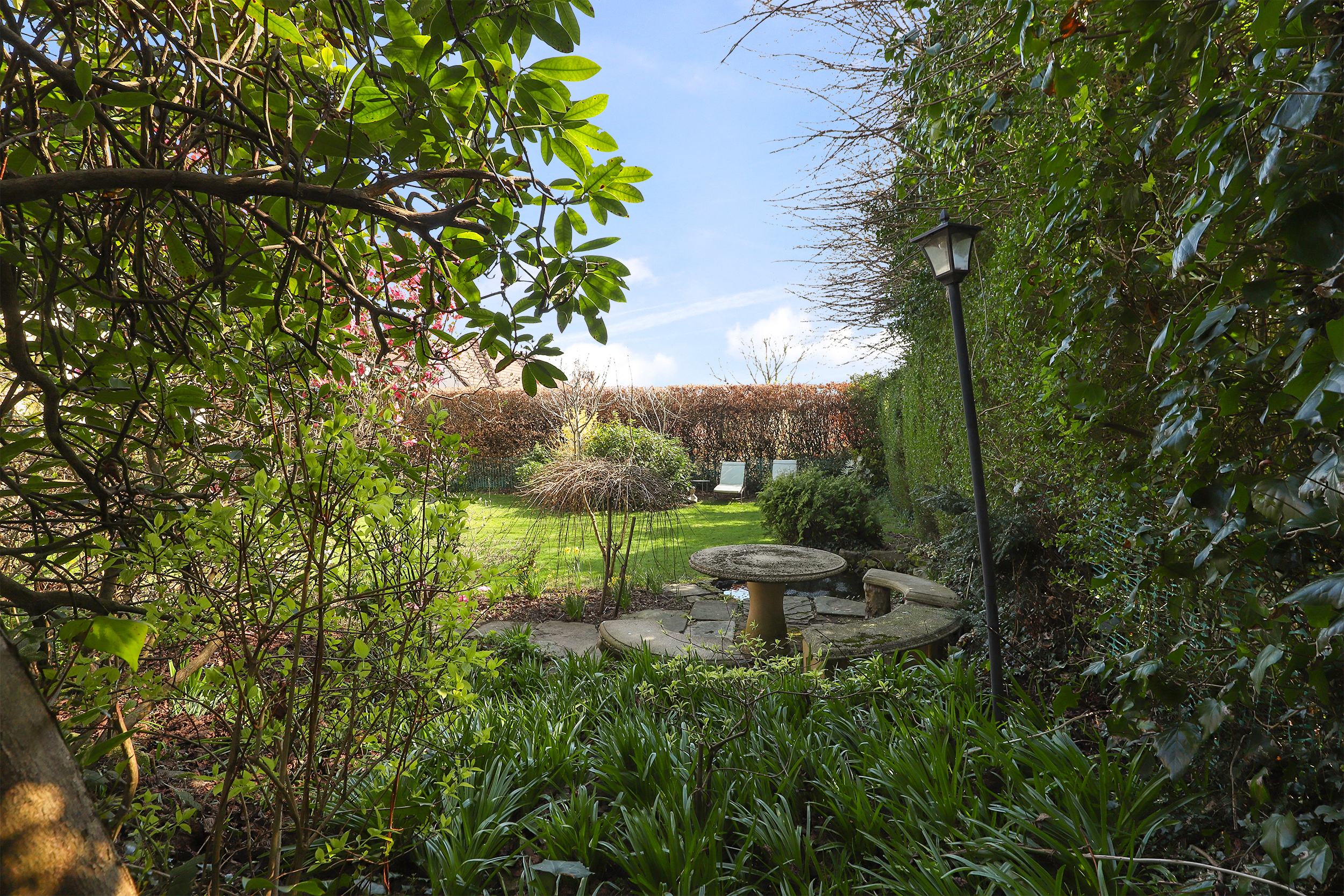 The house sits within a particularly attractive south-facing plot, offering landscaped gardens with several seating areas, a pond, and a shed with an electricity supply. The setting provides both privacy and outdoor space for relaxation and entertaining.