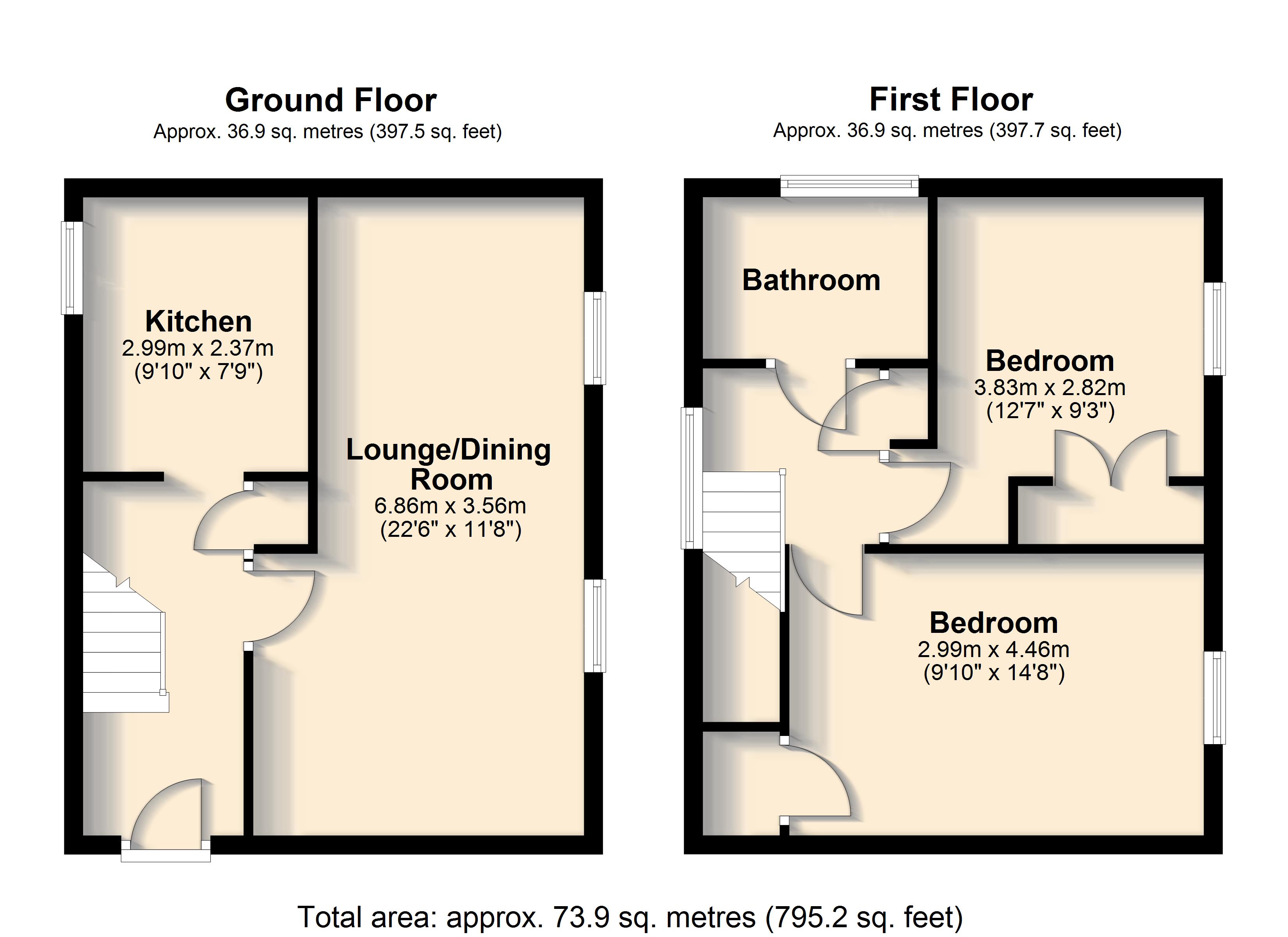 This well-proportioned two-bedroom home offers light and versatile accommodation arranged over two floors. The ground floor features a kitchen to the rear and a spacious lounge/dining room stretching the full width of the property, ideal for both everyday living and entertaining. Upstairs, there are two generous bedrooms and a family bathroom, providing practical yet comfortable space for a range of buyers.