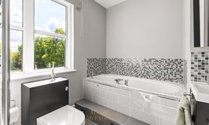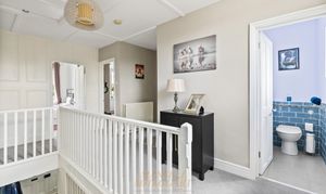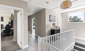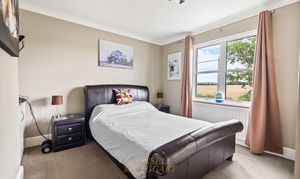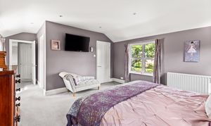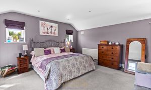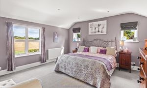 Moving upstairs, the landing features a large window with a delightful view to the rear of the house, offering a glimpse of both the courtyard and the garden. The master bedroom is accessed via a short corridor and offers far-reaching views across the fields at the front of the house. It is a triple aspect, generously proportioned, and currently features a super king-size bed with plenty of space for additional bedroom furniture or seating. There is a walk-in wardrobe with hanging rails and shelving providing excellent storage and a touch of luxury. There is a spacious en-suite with attractive white gloss, bumpy, full-height tiling featuring an inset mosaic tiled boarder. There is a large shower cubicle, a WC, and a wash-hand basin with a vanity unit below. There are four further double bedrooms, of which three are of a similar size and one is slightly smaller. The bedroom located at the rear of the house features a double built-in wardrobe and a shelving unit. Two of the bedrooms at the front feature triple built-in wardrobes, ensuring ample storage space. All four bedrooms to the front have far-reaching views across the fields. The family bathroom is exceptionally well-appointed with attractive mid-grey décor. There is a separate shower cubicle and a bath with inset lighting along a step up to the tub, which has side-mounted waterfall taps. There is a concealed cistern WC, a wash-hand basin with a floating black vanity unit below, and a chrome ladder-style radiator. In addition, there is another cloakroom washroom, which also features attractive Blue décor with half-height tiling and a feature border tile, as well as a WC and a wash hand basin.