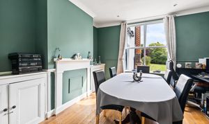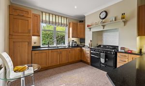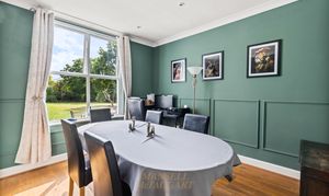 To the front of the grey and white painted property there is a large enclosed porch with a slate pitched roof the porch has plenty of glazing which lets in lots of light, this leads to a secondary front main door opening into the entrance hall, which features original oak parquet flooring that flows through into the sitting room on the left, with the lounge beyond. To the right is the TV/family room, and ahead are the stairs and a corridor leading to the dining room, kitchen, utility room, and cloakroom washroom. A gently curving archway leads into the sitting room, featuring a large window to the front that ensures plenty of light. The room also boasts a Chimney breast with a white surround, mantelpiece, and storage cupboards on each side. Beyond this is the impressive lounge, featuring a large bay window with Cushioned seating which faces the front of the house, opposite windows, and a door leading to the raised patio outside. There is an open fire with a marble surround and a sandstone hearth. It is an exceptionally spacious room, currently featuring two large sofas and arm chair with ample space for additional furniture. Across the hallway is the TV/family room, again featuring a Chimney and a large window overlooking the front of the property. The corridor leads to the dining room on the left, which features solid oak flooring, a chimney with cupboards on each side, and half-height timber panelling that creates a superb feature. There is a window to the side overlooking the garden. It is a good-sized room with space for a dining table and at least 6-8 chairs. Beyond and to the right is the kitchen, featuring a double Frankie sink with a swan-neck mixer tap beneath a window to the side of the house. There is a Rangemaster cooker with six gas burners and two fan electric ovens, set within a chimney breast with an attractive tiled cream splash back. There is a good range of oak-fronted units with solid granite work surfaces, including stylish up stands to match. Integrated items include a dishwasher and full height fridge with space for a microwave concealed within a cupboard. The utility room is located further along to the left and features white full-height sliding cupboards along one wall, providing superb storage, with a window at the far end. With worktop space and white hung wall units on the opposite wall, there is space and plumbing for a washing machine, a tumble dryer, a freezer, and an American-style fridge/freezer, as well as a butler sink to one corner, there are original floor quarry tiles, which are, again, a key feature and all in keeping with a period property. Ahead is the cloakroom washroom, featuring a white WC, a rectangular large wash hand basin with a tiled surround and a vanity unit below, along with a chrome ladder-style radiator and windows to the side. The cellar can be accessed from off the corridor and down some brick steps, the rear back porch door is a studded door with a feature bull’s-eye glass, which opens onto an Indian sandstone terrace. There is a BBQ area adjacent to this, as well as the double garage and outbuildings, with the potential to create an annexe (STPP) just across the courtyard.