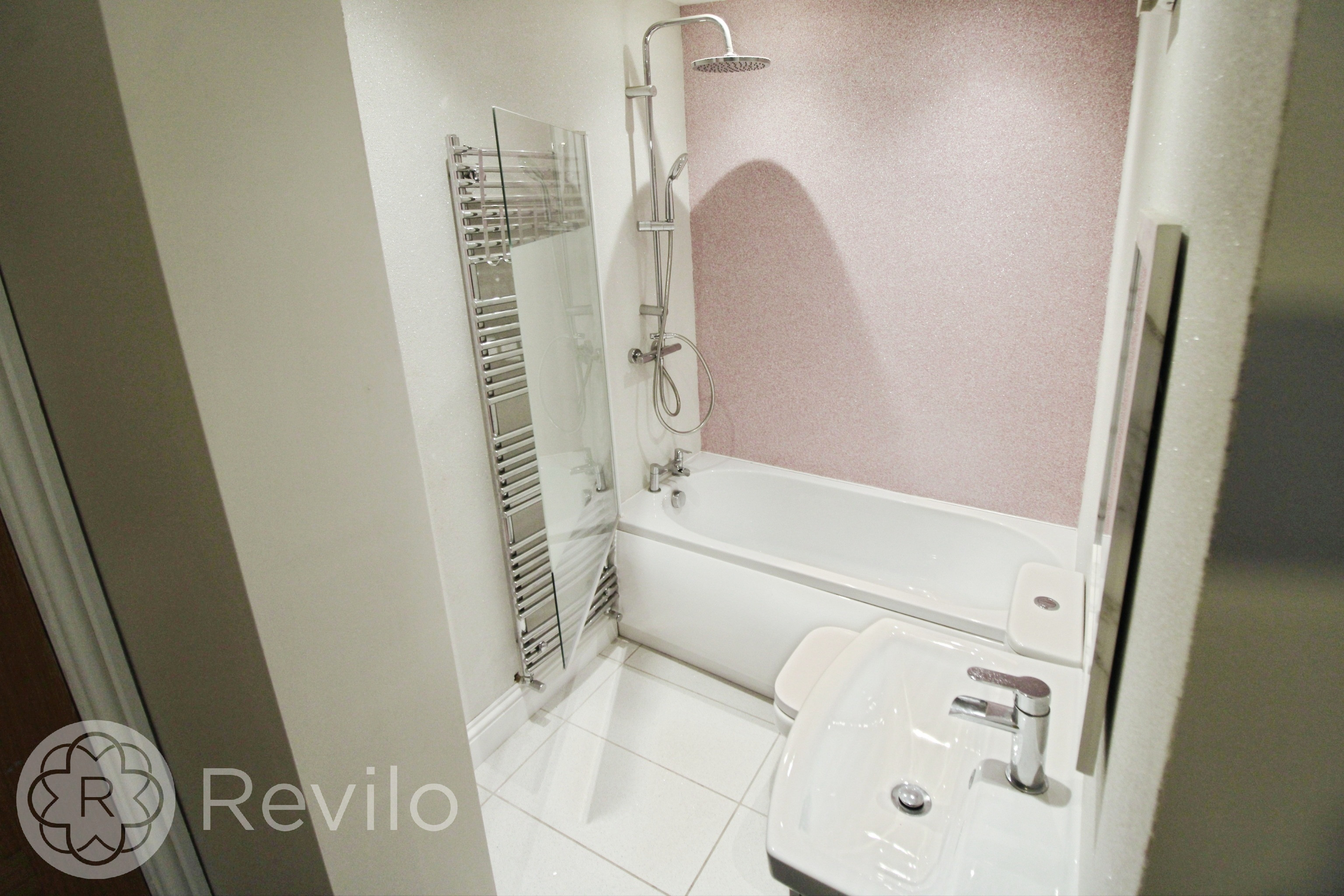 Heated Towel Rail, 3pc Suite, Toilet, Bath with Overhead Shower, Pedestal Sink, Splashback tiling.