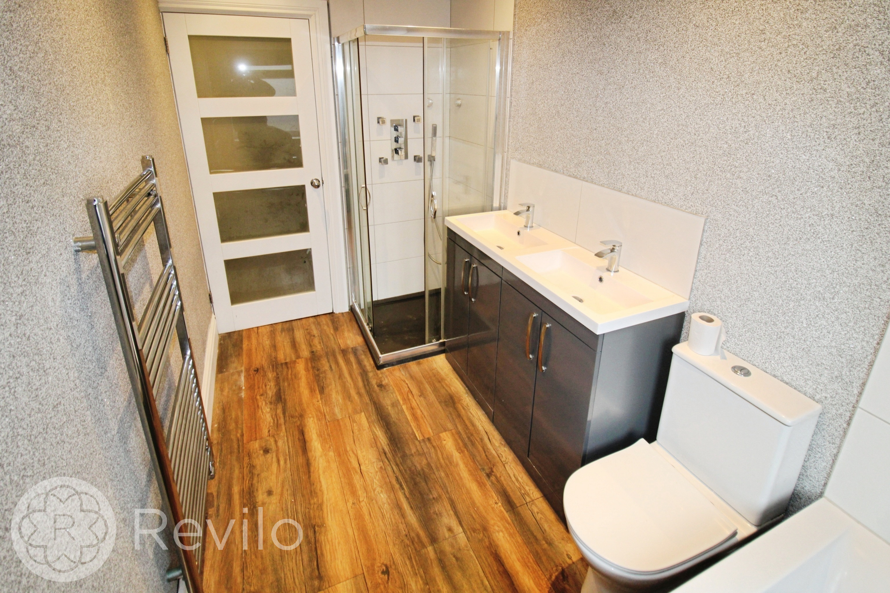 Heated Towel Rail, Side Facing Frosted Double Glazed Window, 3pc Suite, Toilet, Pedestal Sink, Walk-In Shower. Allowing access to Bedrooms Three and Four