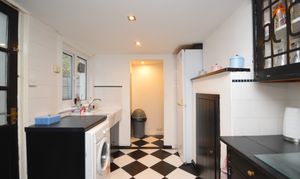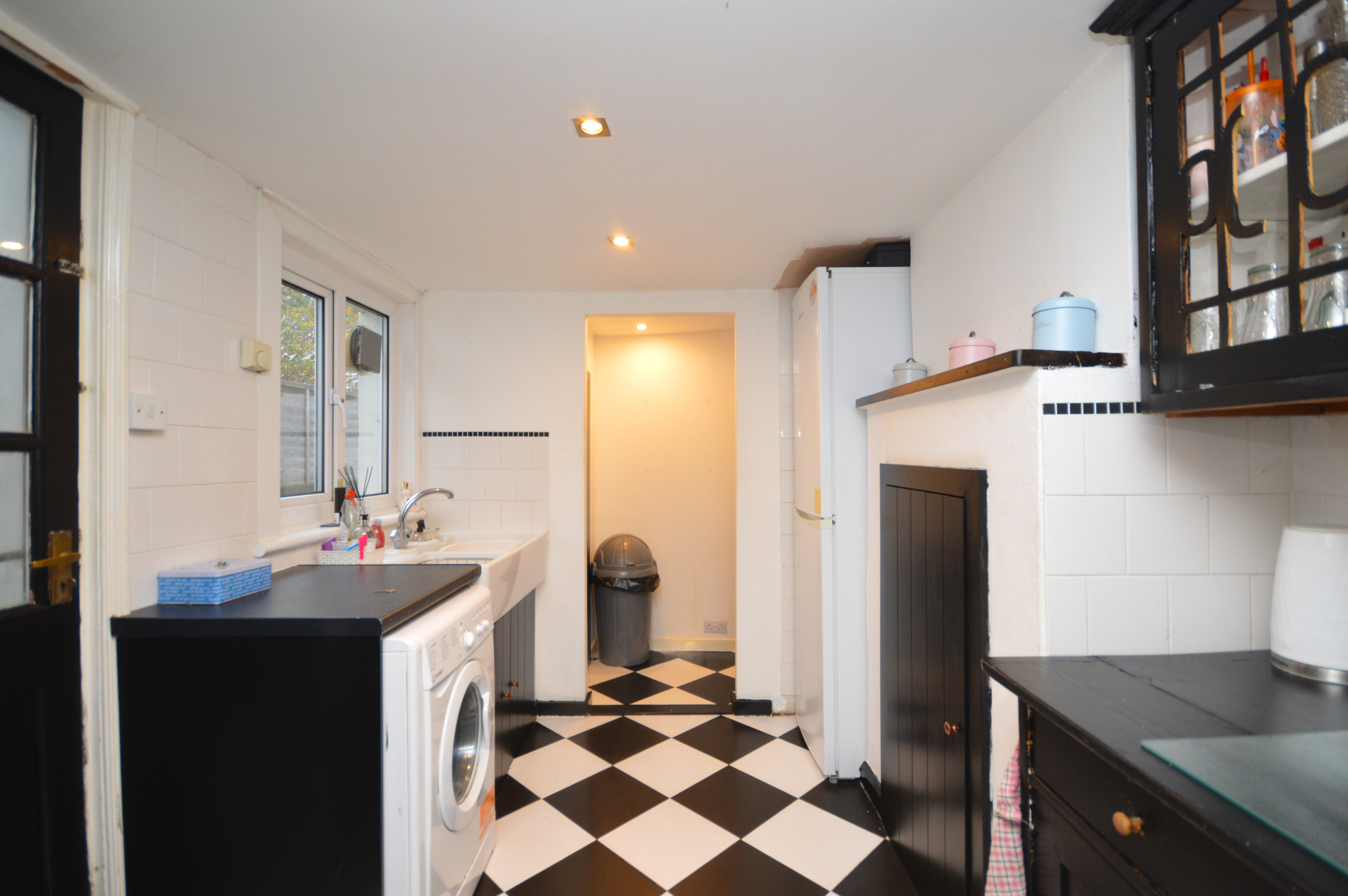 UPVC double glazed window to the rear and out to the garden, dual aspect with wooden glazed door out to the garden also. Tiled flooring, space for freestanding fridge freezer, larder cupboard, Belfast style Korean sink. Space for washing machine, storage cupboard housing combi boiler. Part tiled walls.