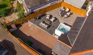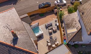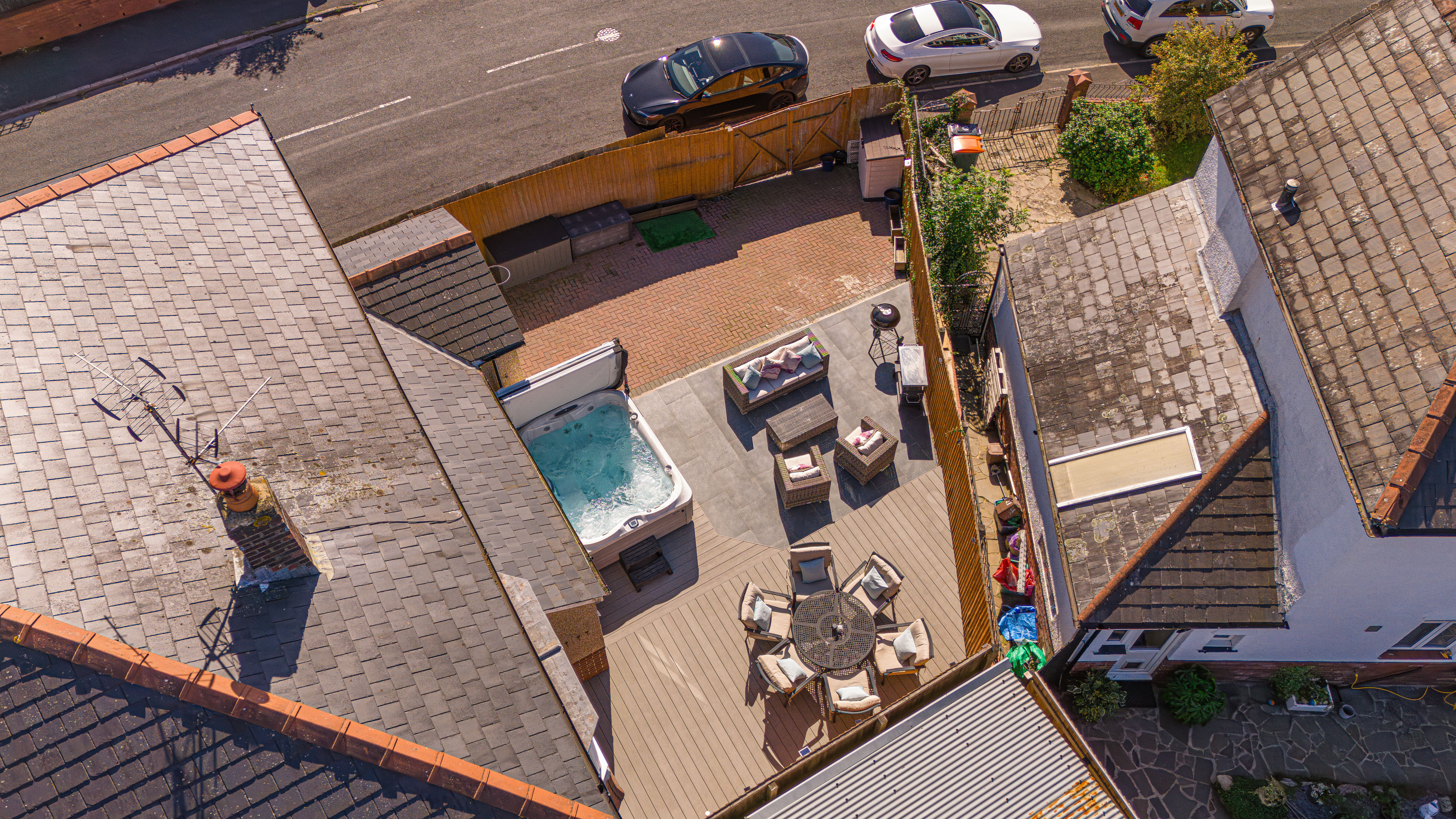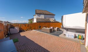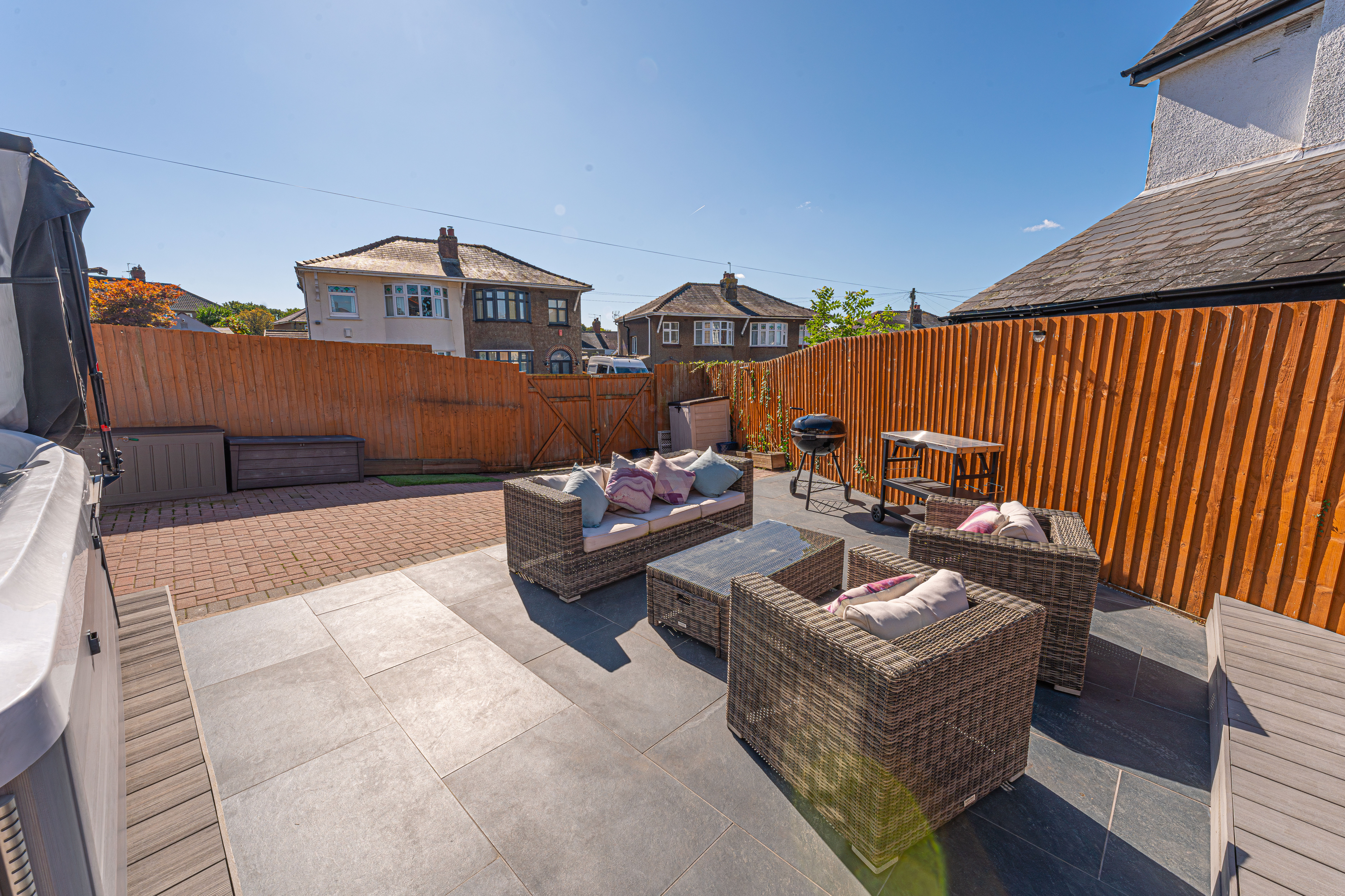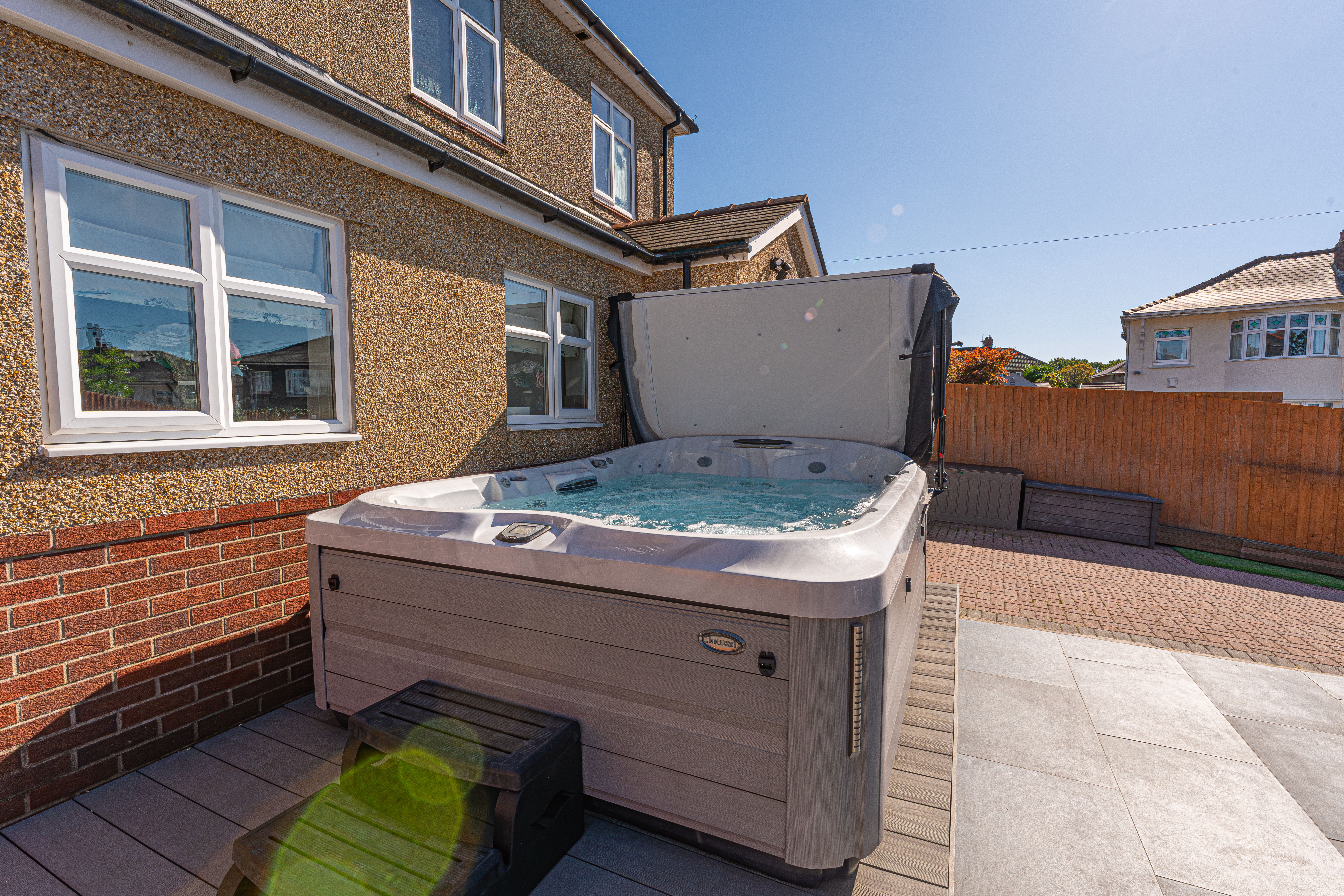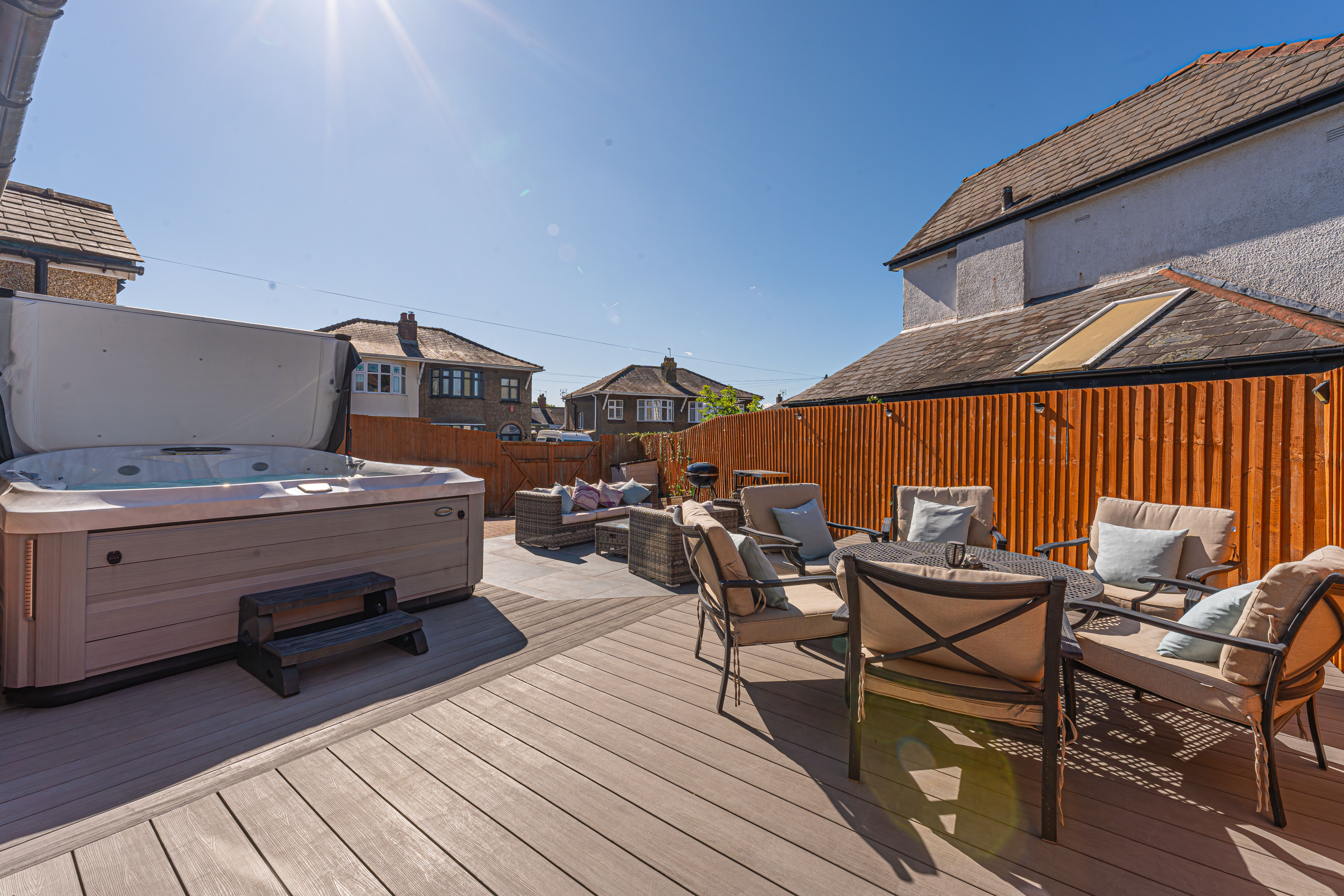 Stepping out we have the rear patio garden, fully enclosed and impressive in size, with large decking from the house perfect for entertaining guests or al-fresco dining and also featuring a large hot tub. Beyond the decking there is there is a tandem driveway leading up to the garage, with space for two vehicles to enter through the gate at the side of the house. To the front of the house there is a large pebble stone garden enclosed by a mid-height wall and gates.