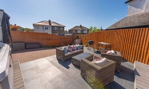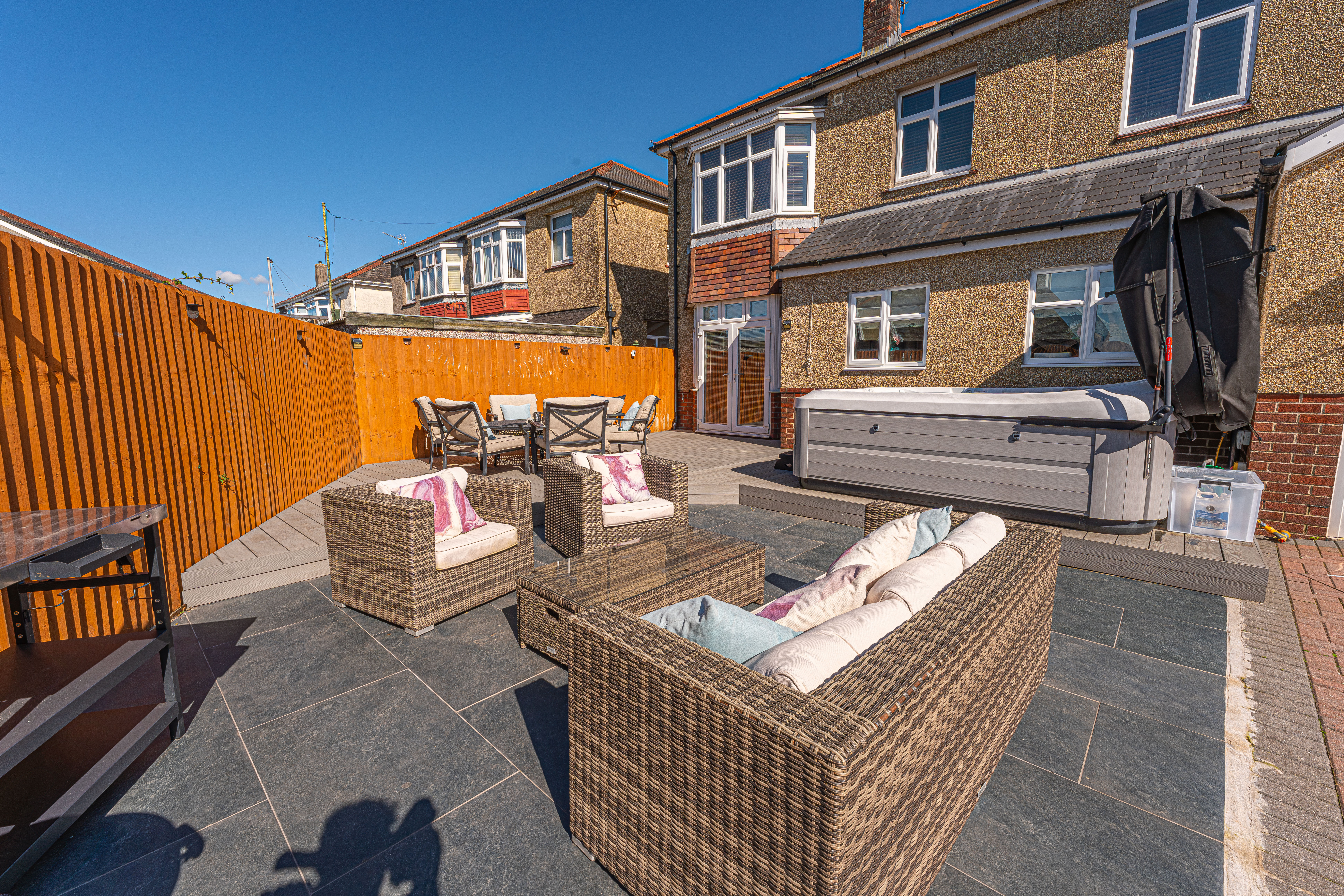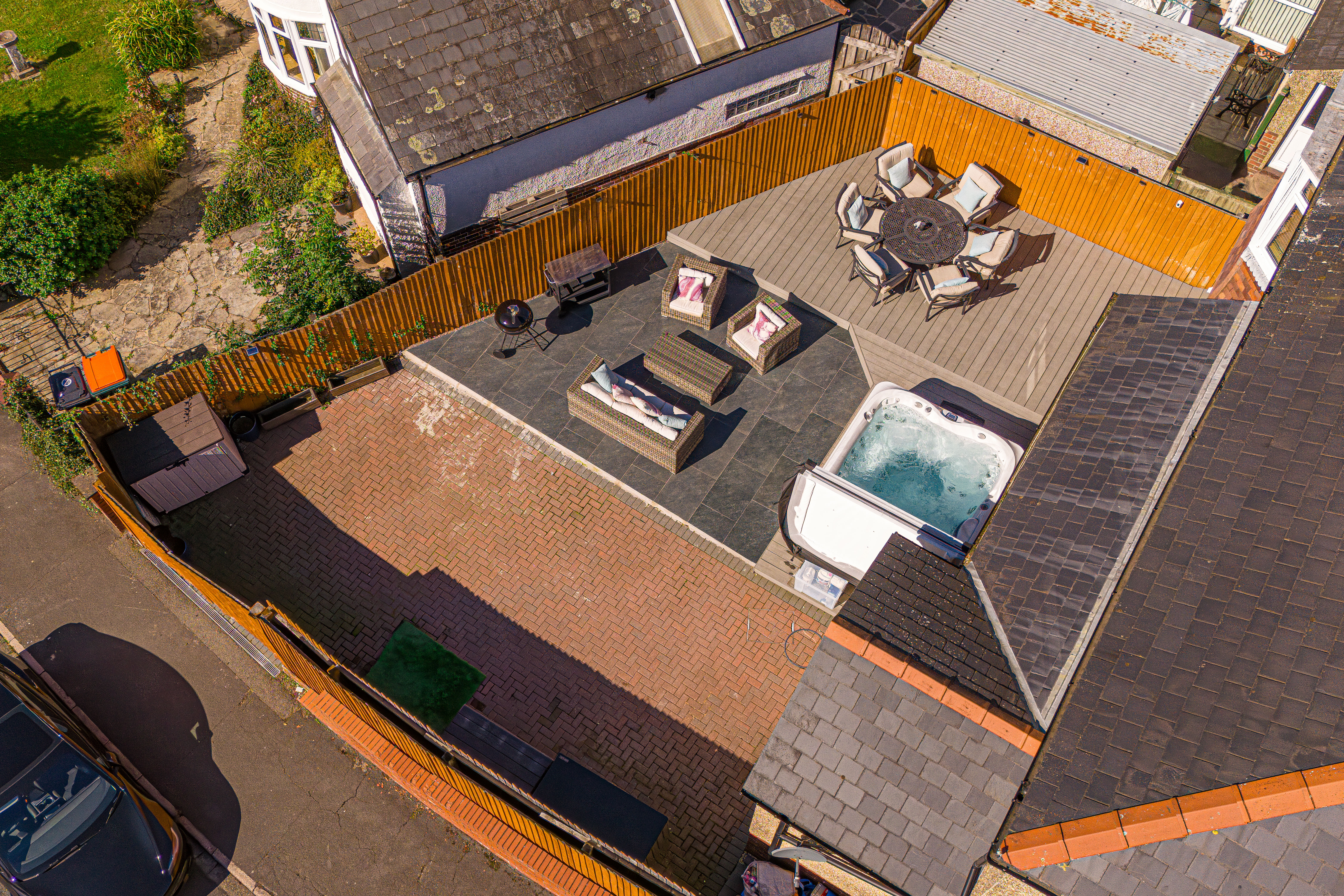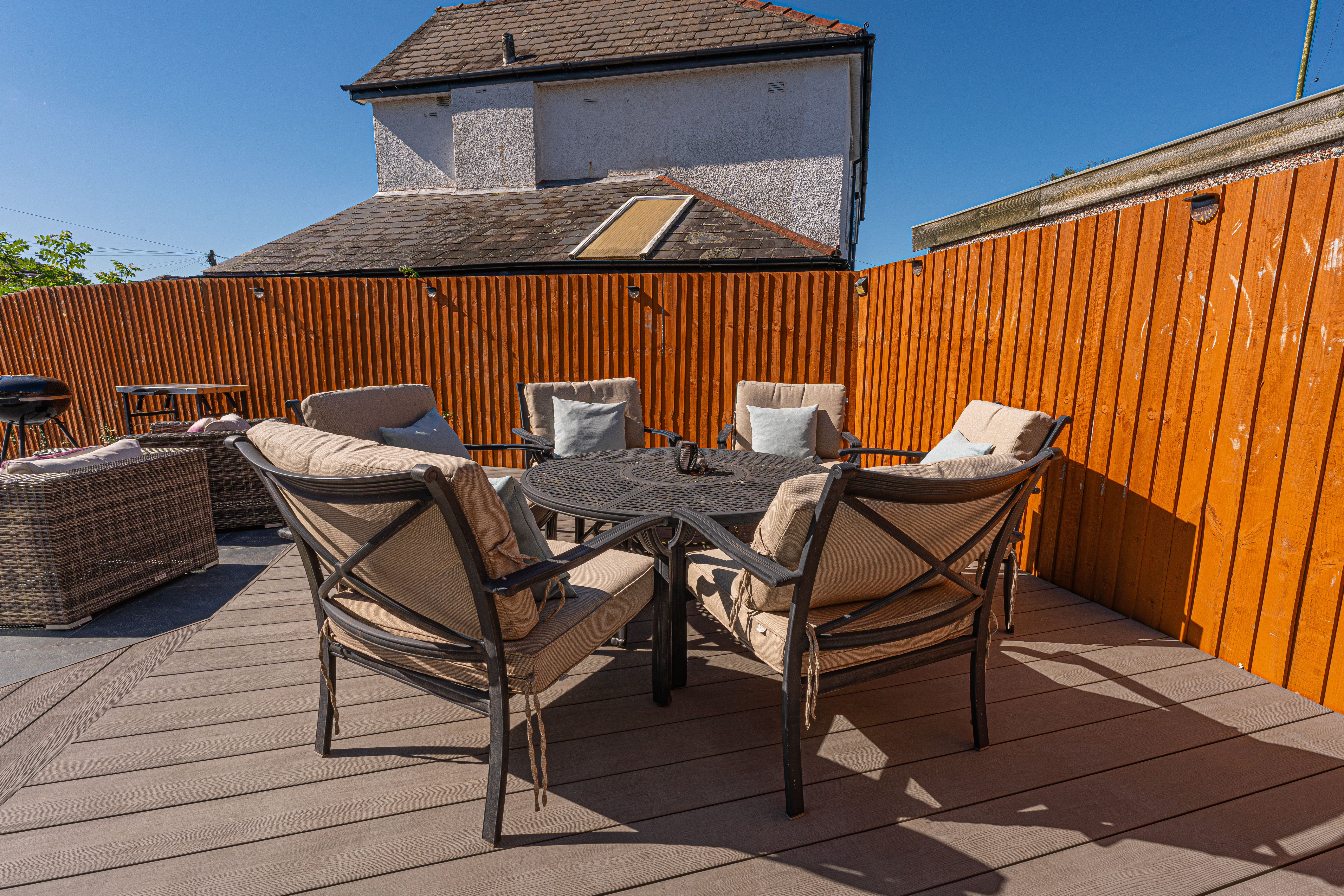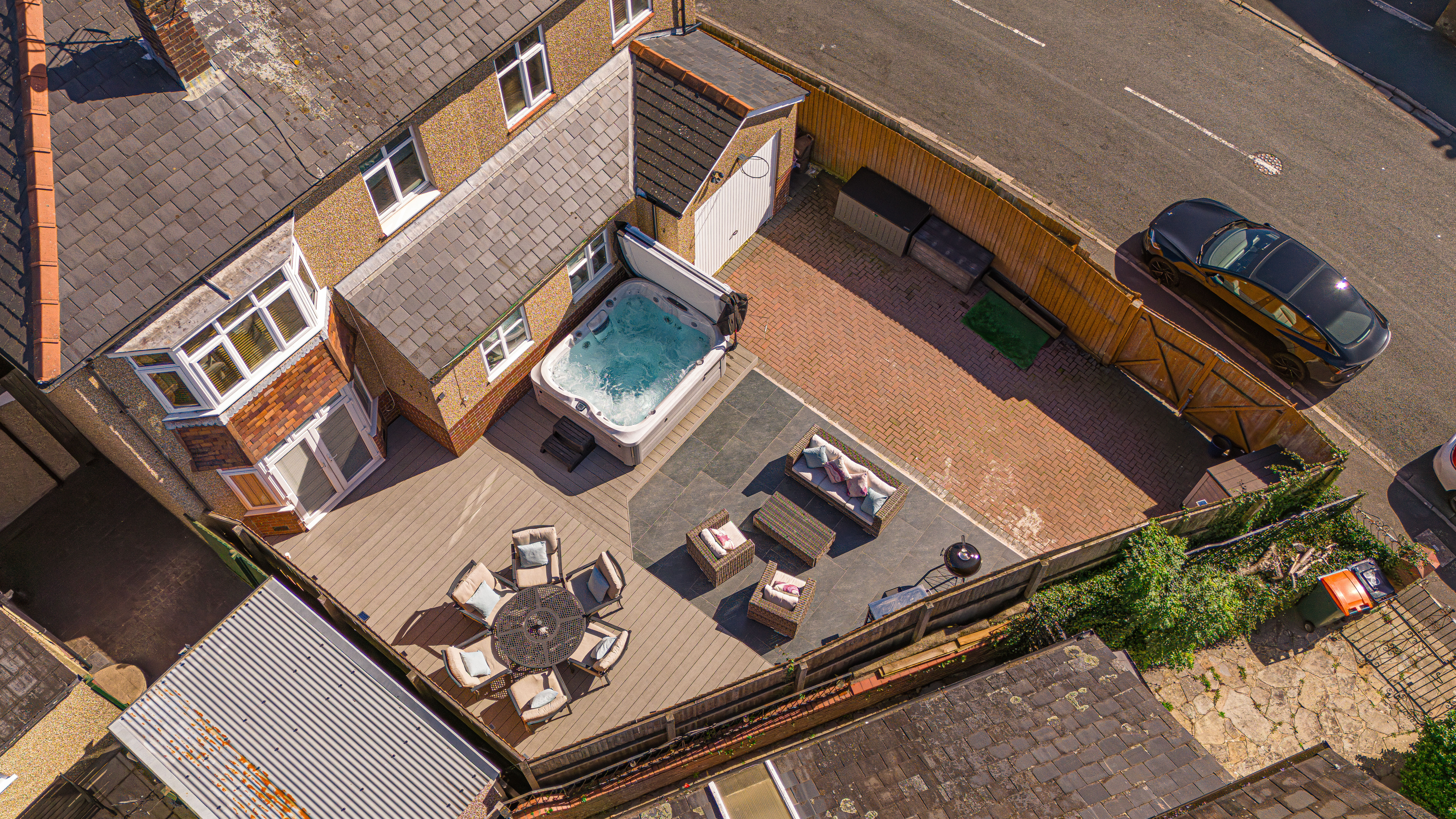 Stepping out we have the rear patio garden, fully enclosed and impressive in size, with large decking from the house perfect for entertaining guests or al-fresco dining and also featuring a large hot tub. Beyond the decking there is there is a tandem driveway leading up to the garage, with space for two vehicles to enter through the gate at the side of the house. To the front of the house there is a large pebble stone garden enclosed by a mid-height wall and gates.