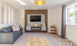 Inside, the property opens into a welcoming hallway where all of the principal rooms are set. At the heart of the home, the open plan kitchen dining living room is a light filled space designed for modern living. A feature media wall with an inset electric fire forms a natural focal point, while the dining and kitchen areas are laid in smart tiling with stylish grey shaker cabinets, a peninsula breakfast bar, and integrated appliances including a five ring gas hob and twin ovens. A side door provides direct access to the garden.