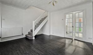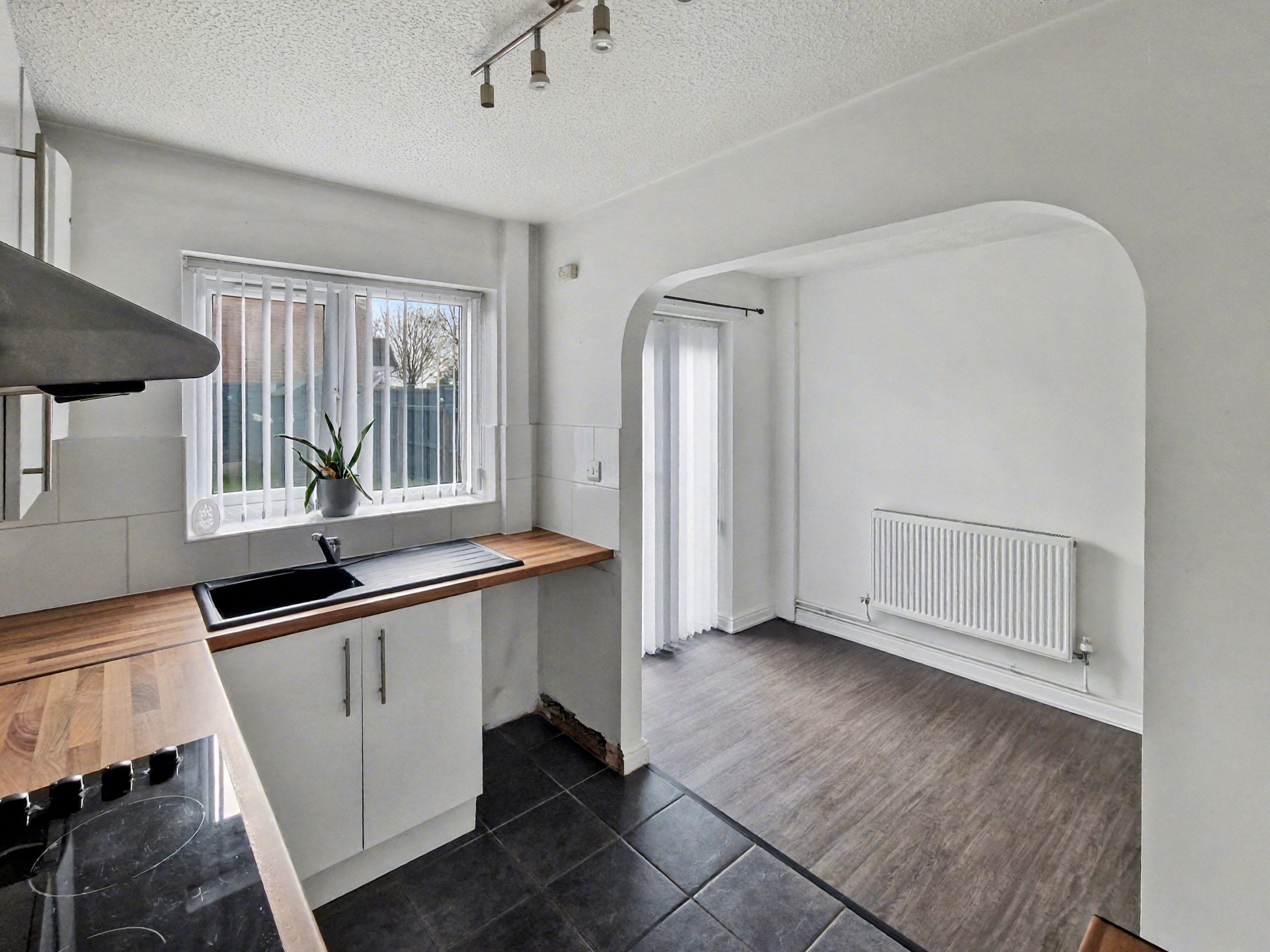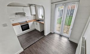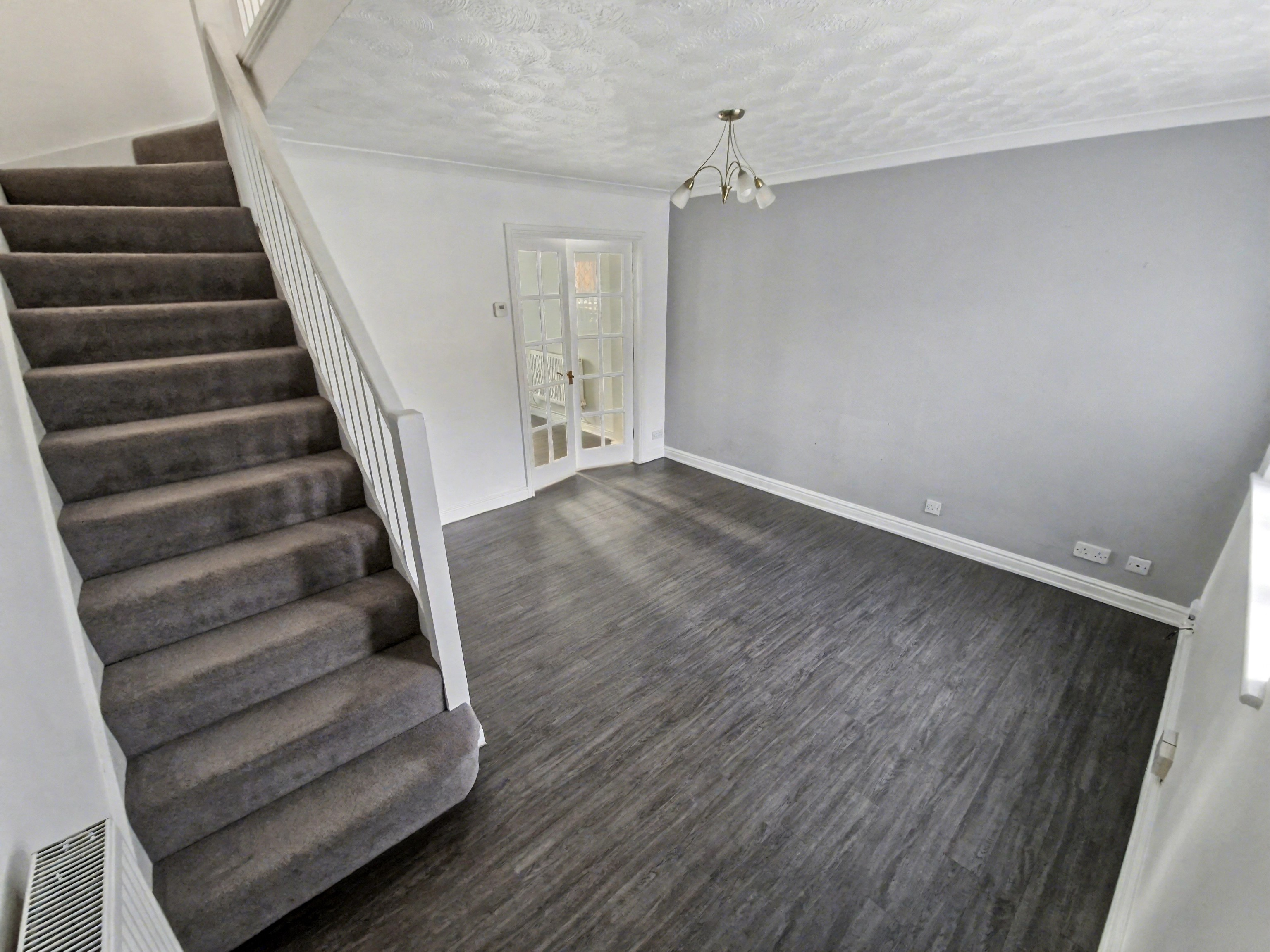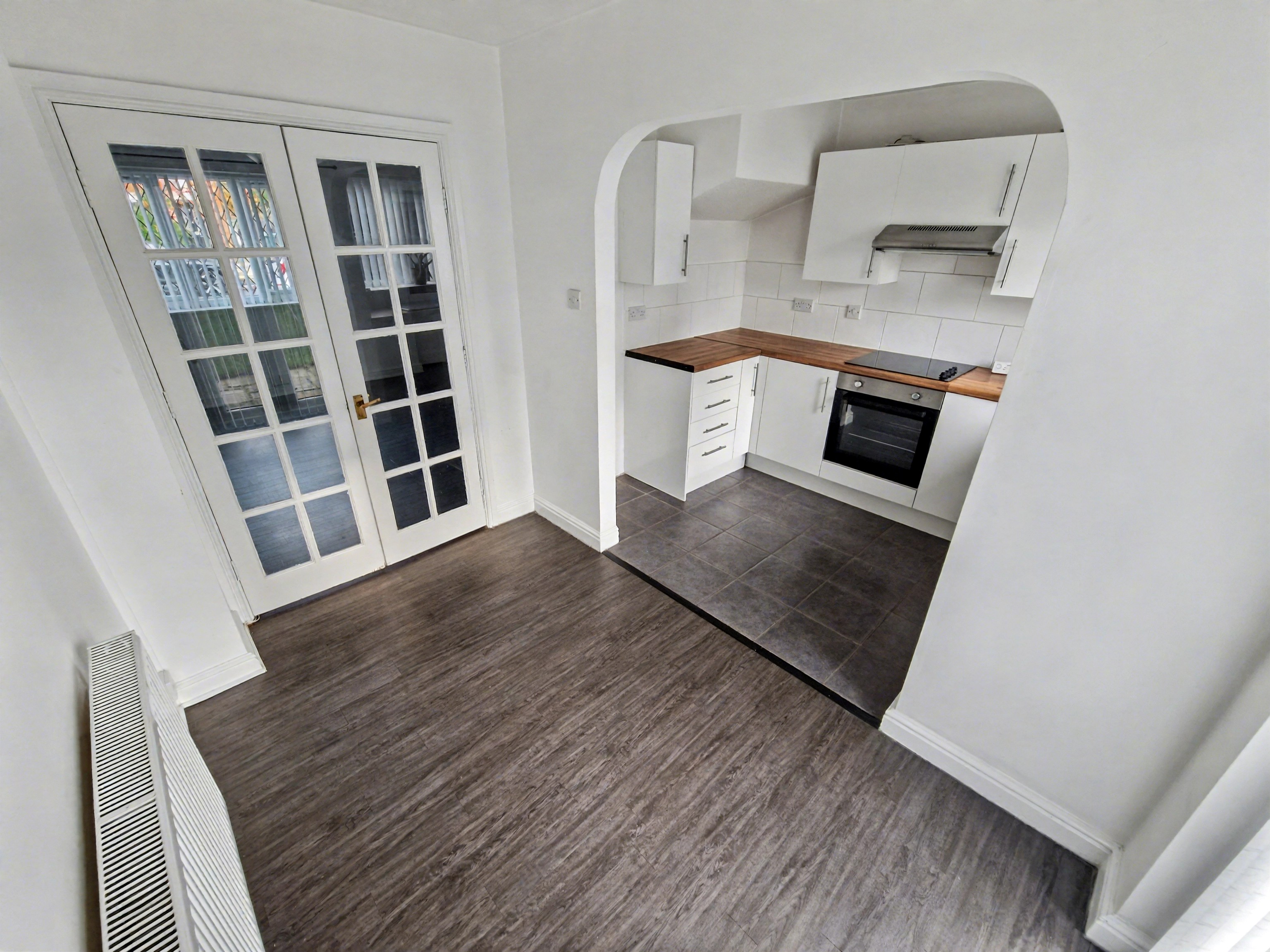 The accommodation comprises an entrance porch leading into a spacious lounge, with stairs rising to the first floor. The ground floor also features a large, open-plan kitchen and dining area, ideal for modern living and entertaining. To the first floor, there are two generously sized bedrooms and a contemporary family bathroom with an over-bath shower.