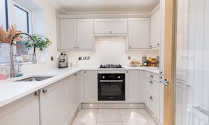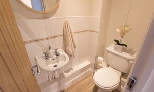 The beautifully appointed kitchen has been thoughtfully crafted with both aesthetics and practicality in mind. It features sleek work surfaces, high-gloss cabinetry, and premium integrated appliances, providing the perfect environment for those who enjoy cooking or entertaining. The attention to detail continues with tasteful lighting, high-quality flooring, and subtle modern finishes that create a truly contemporary feel. A convenient downstairs cloakroom completes the ground floor, adding everyday practicality.