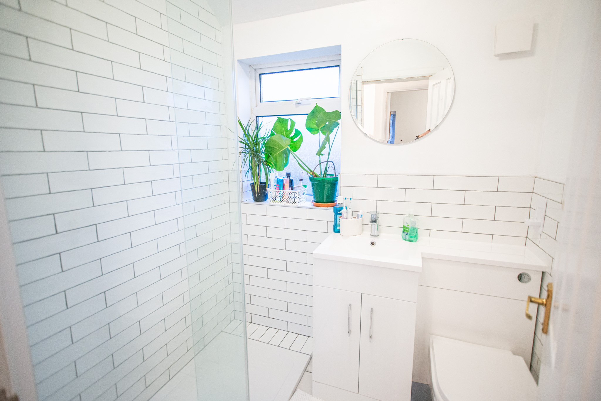 With tiled floor and walls, walk in shower, toilet, wash basin on vanity unit, radiator and window.