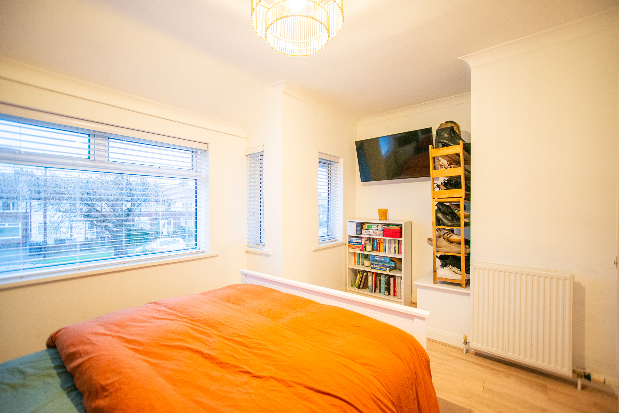 With laminate flooring, feature fireplace, storage, radiator, and window.