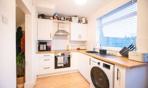 With laminate flooring, slab style kitchen units, laminate worktop, integrated oven and electric hob, extractor fan, 1.5 bowl sink with tap, plumbing for washing machine, door to rear garden, radiator, and window.