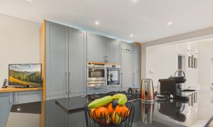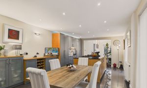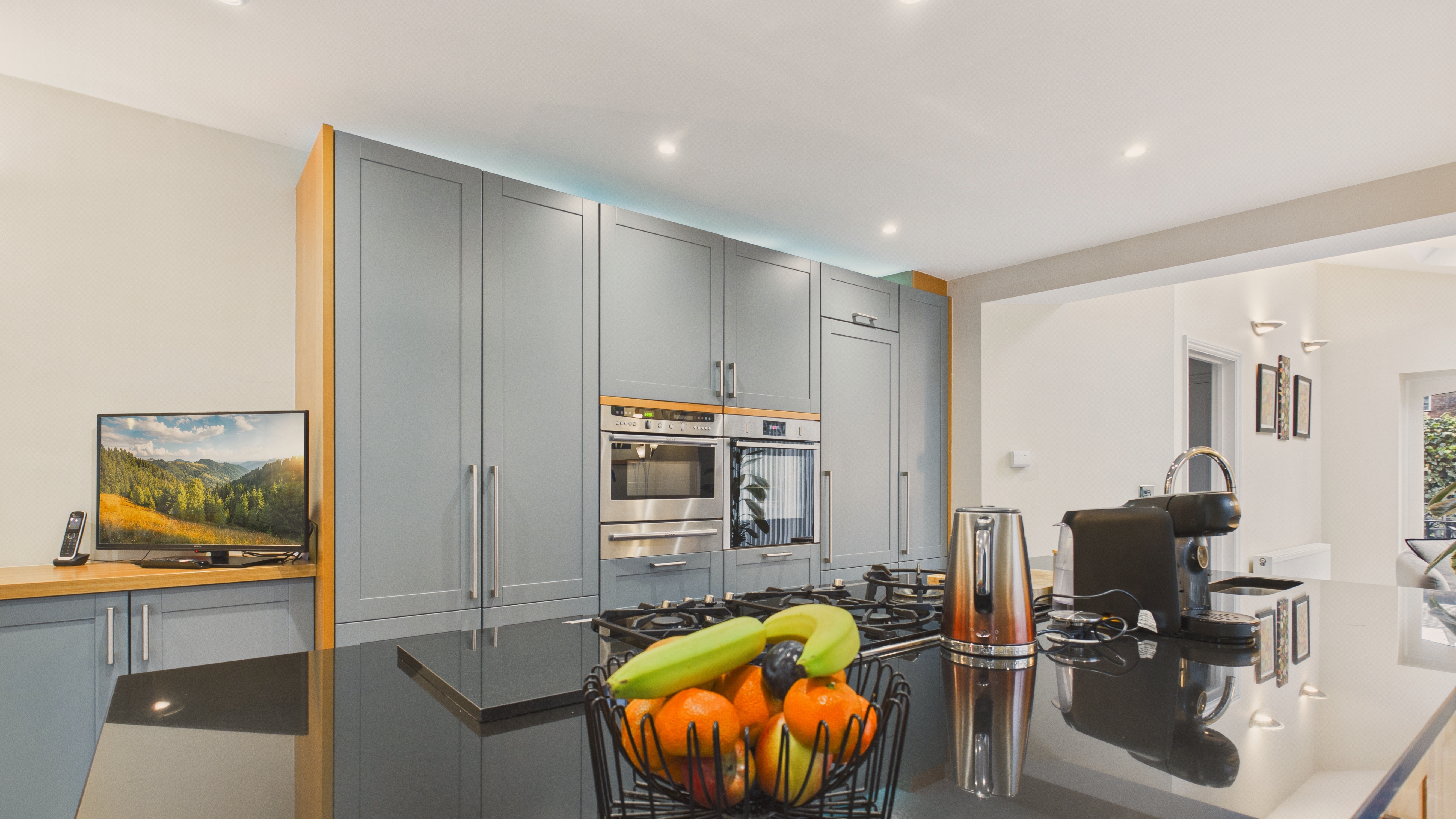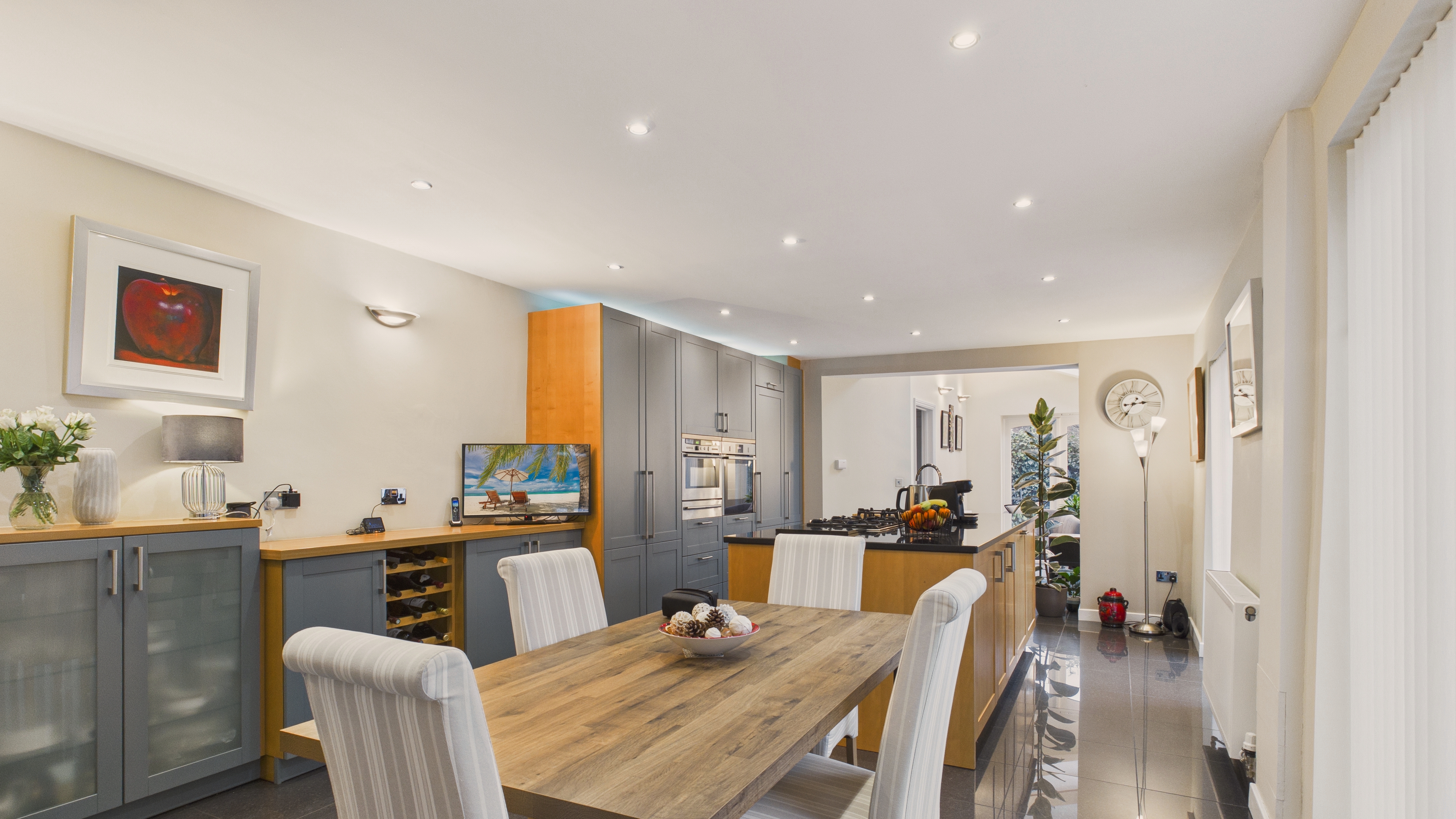 - Modern kitchen/breakfast room: Integrated appliances and space for dining