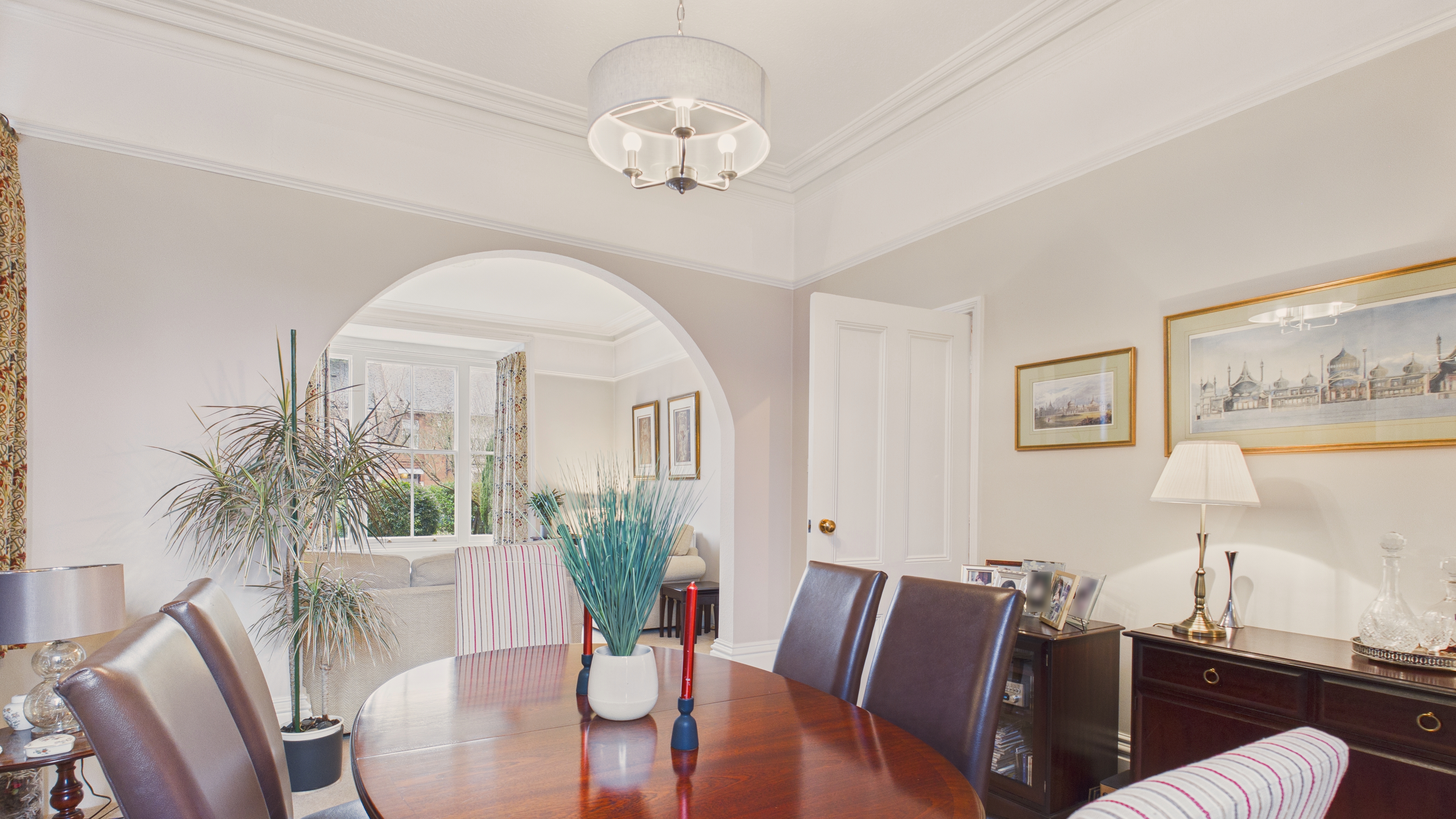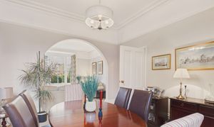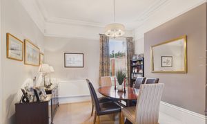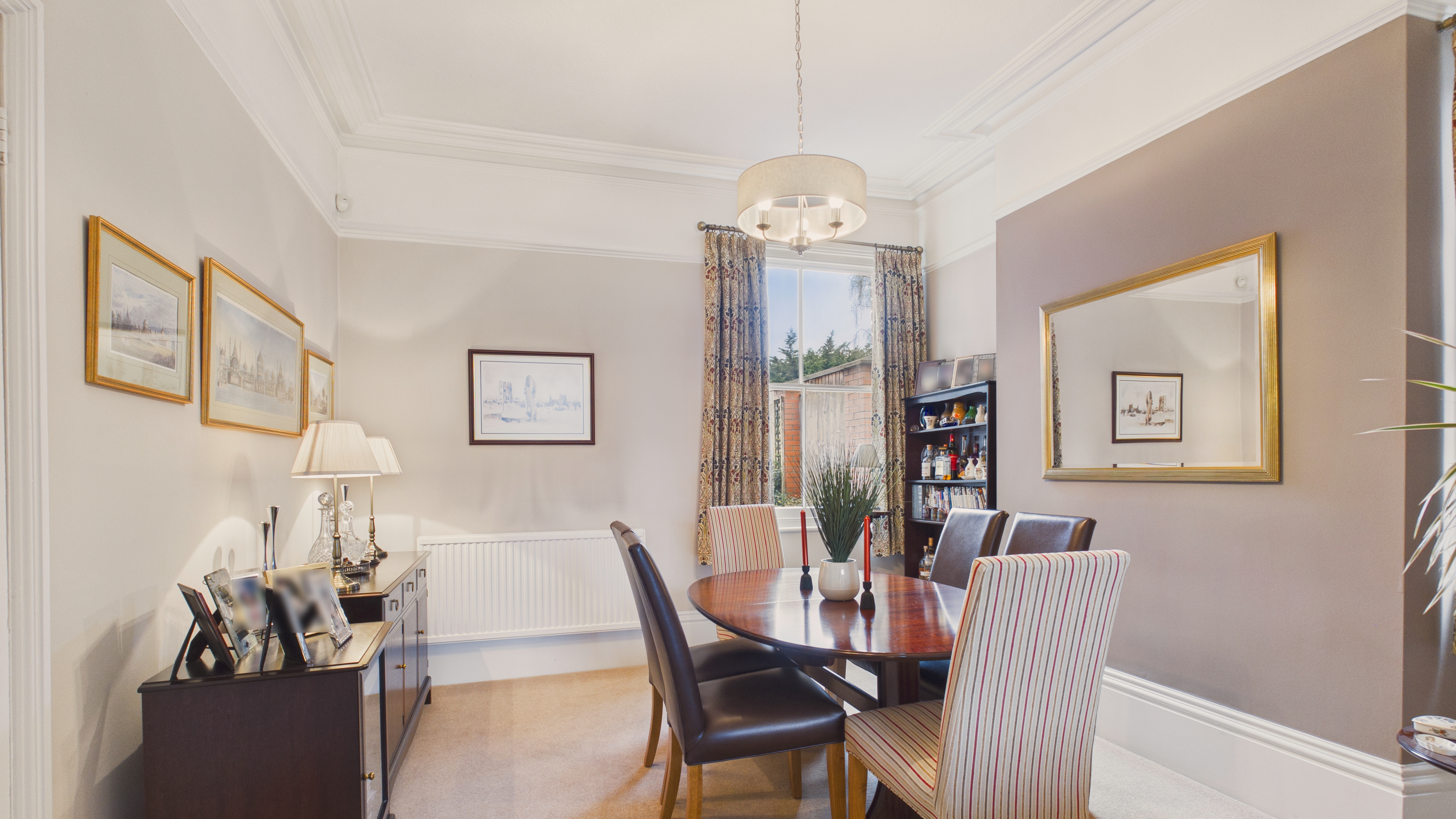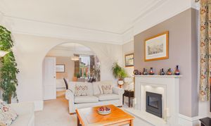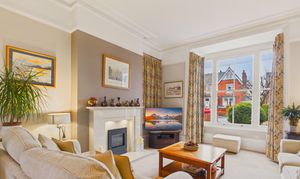 The property benefits from a private driveway, providing off-road parking in a highly convenient location. Step inside via a light entrance hall, which provides access to the main ground floor rooms and the staircase to the first floor. The bay-fronted lounge is a standout space, featuring impressive ceiling height and a beautiful fireplace with a marble surround—creating a classic focal point. Adjoining the lounge is the formal dining room, again with generous proportions and high ceilings, ideal for entertaining or family meals.