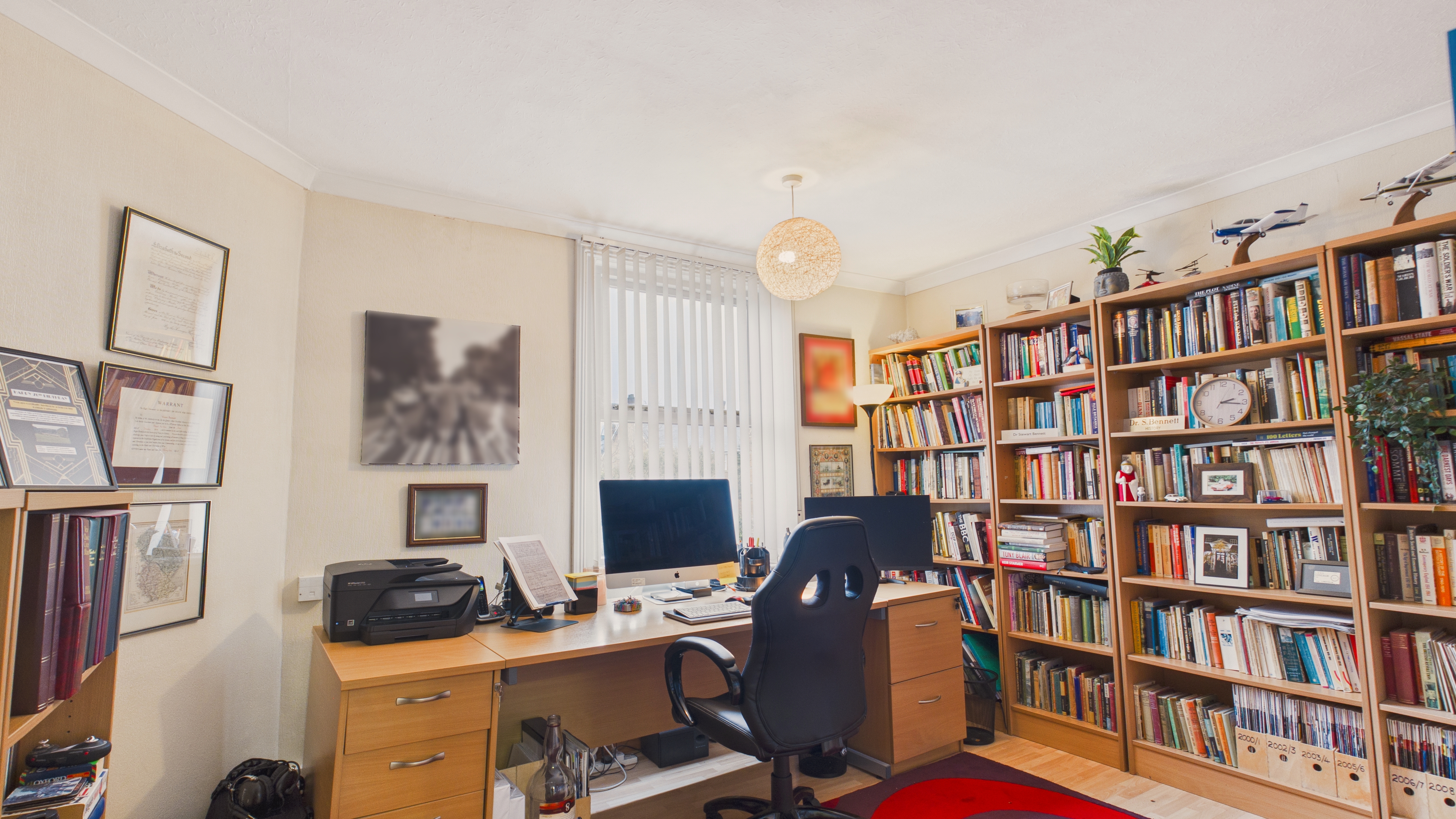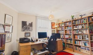 The first floor provides three of the four double bedrooms, including a particularly spacious principal bedroom with a bay window and fitted wardrobes. Bedroom two is another generous double, while bedroom three is currently used as a home office. The family bathroom on this floor is finished with a four-piece suite, comprising a separate bath, shower, toilet, and basin.