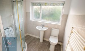 Fitted with a modern white suite comprising WC, wash hand basin and shower cubicle. Heated towel rail. Airing cupboard with radiator. Double glazed window to rear.