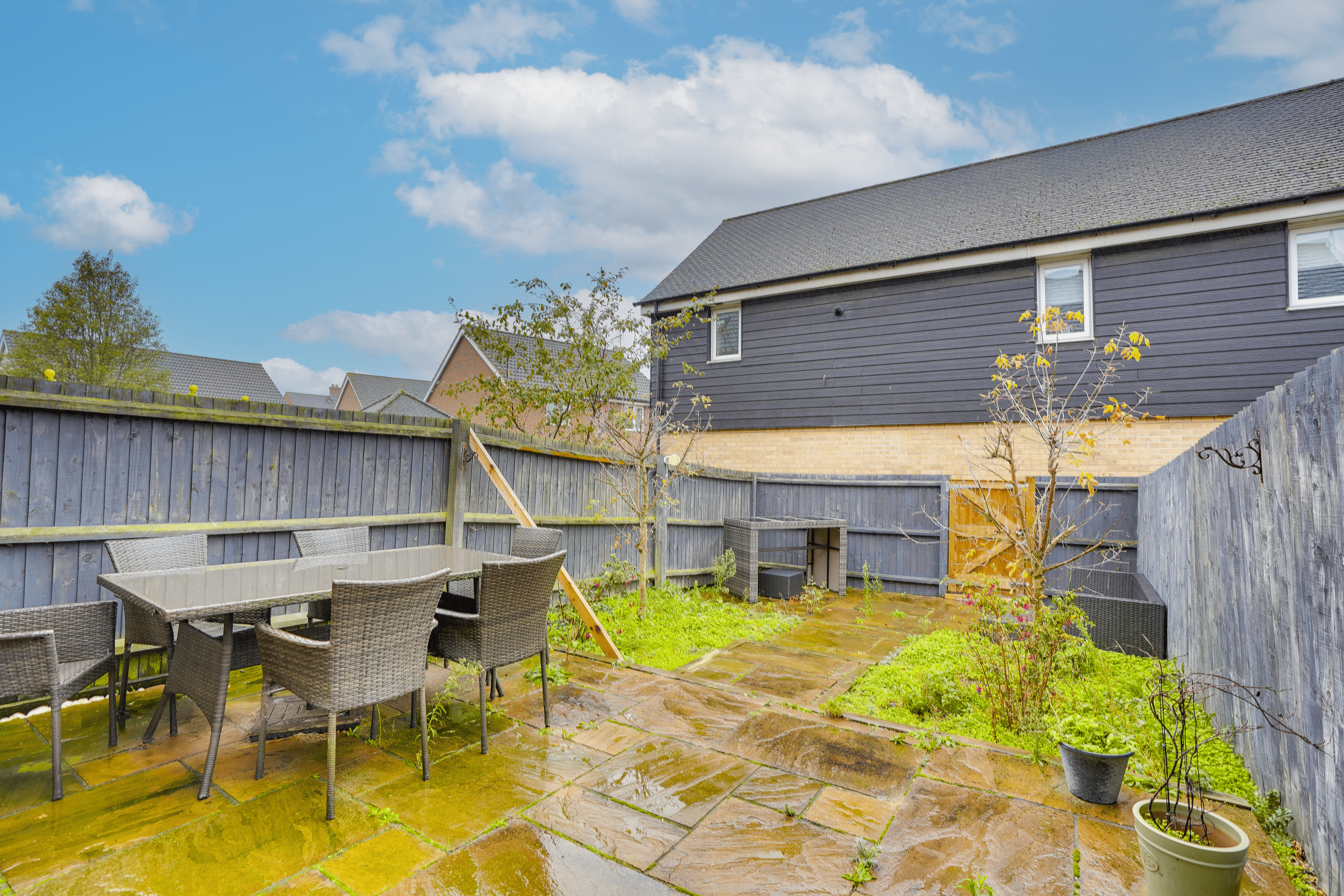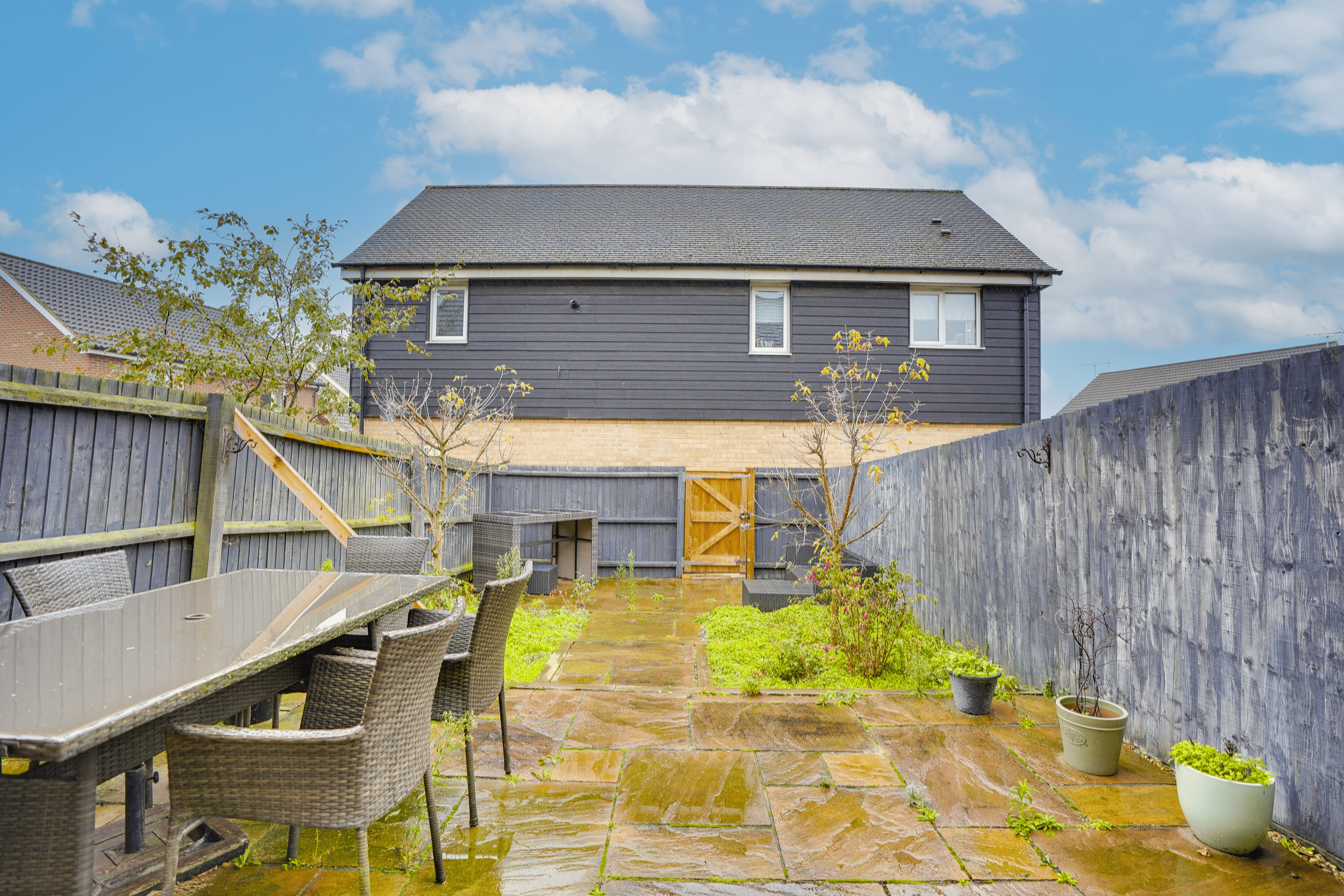 The property boasts a private garden with multiple seating areas, ideal for relaxing or hosting friends and family.