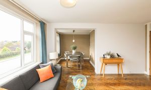 You’re welcomed into an inviting entrance hall that leads into the stunning living area, a beautifully styled space featuring a large picture window, parquet flooring, and underfloor heating. Bathed in natural light, this area flows seamlessly into the open-plan dining space, creating a fabulous setting for both everyday living and entertaining guests.