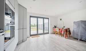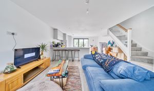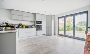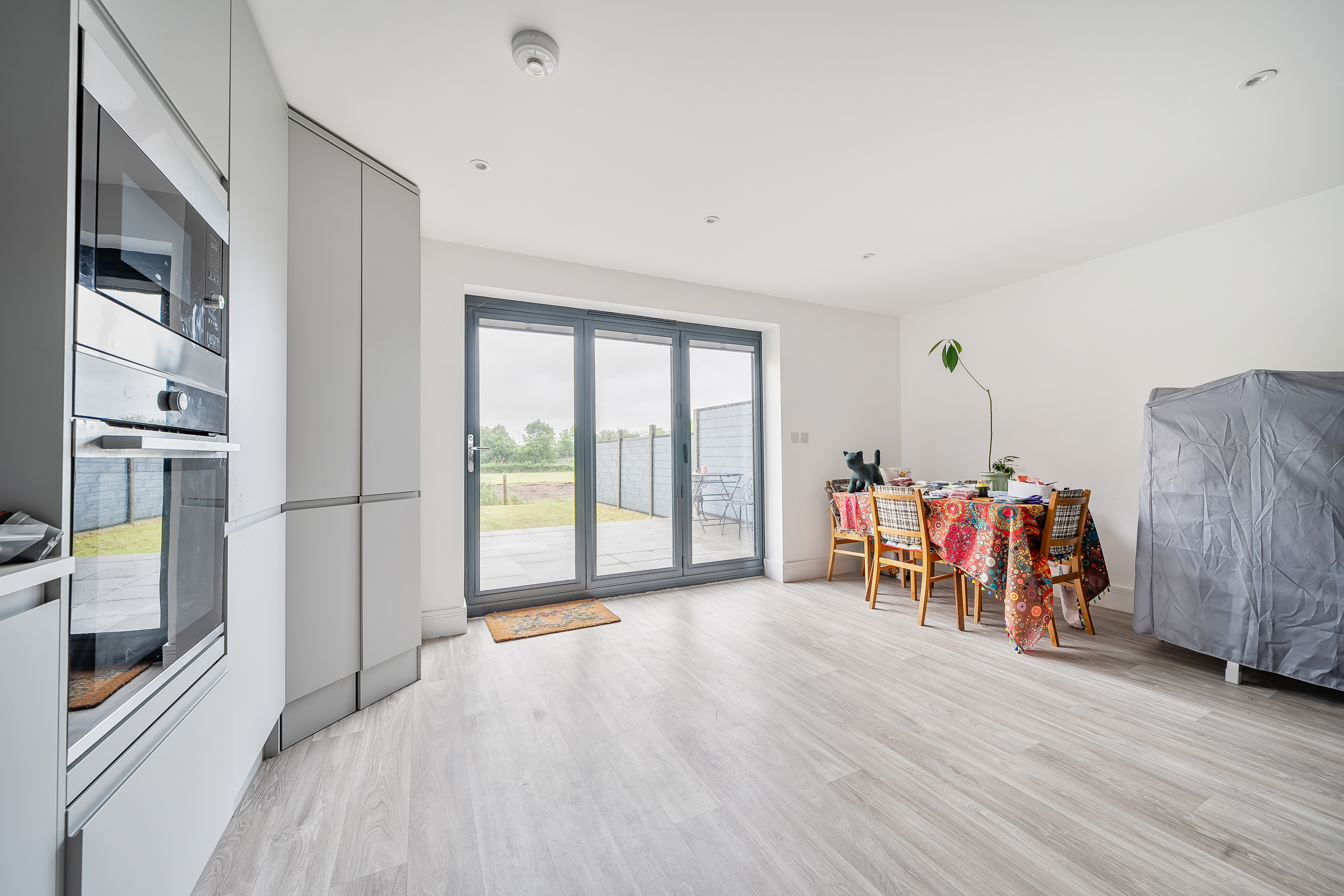 The ground floor opens into a bright open-plan kitchen and dining area, finished with a sleek grey kitchen, integrated appliances, and generous worktop space. Bifold doors at the rear lead directly to the private garden and allow natural light to fill the space. A downstairs WC adds practicality to the layout.