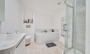 Upstairs, there are two well-proportioned double bedrooms, along with a modern bathroom that includes a separate bath and shower.