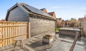 The private, landscaped rear garden is a true highlight, perfectly designed for outdoor dining, family gatherings, and relaxation. Mature planting and thoughtfully arranged borders create a serene atmosphere and a sense of seclusion, while multiple decking areas, including one that wraps around the side of the garage, provide versatile spaces for al fresco meals, entertaining, or simply enjoying the outdoors. The garden is easily accessed via bi-fold doors from the kitchen/living space, inviting the outdoors in and making the most of the property’s seamless flow between inside and out. To the front, the property features a well-maintained lawn and an attractive patioed walkway leading to the entrance, complemented by ample driveway parking in addition to the detached double garage.