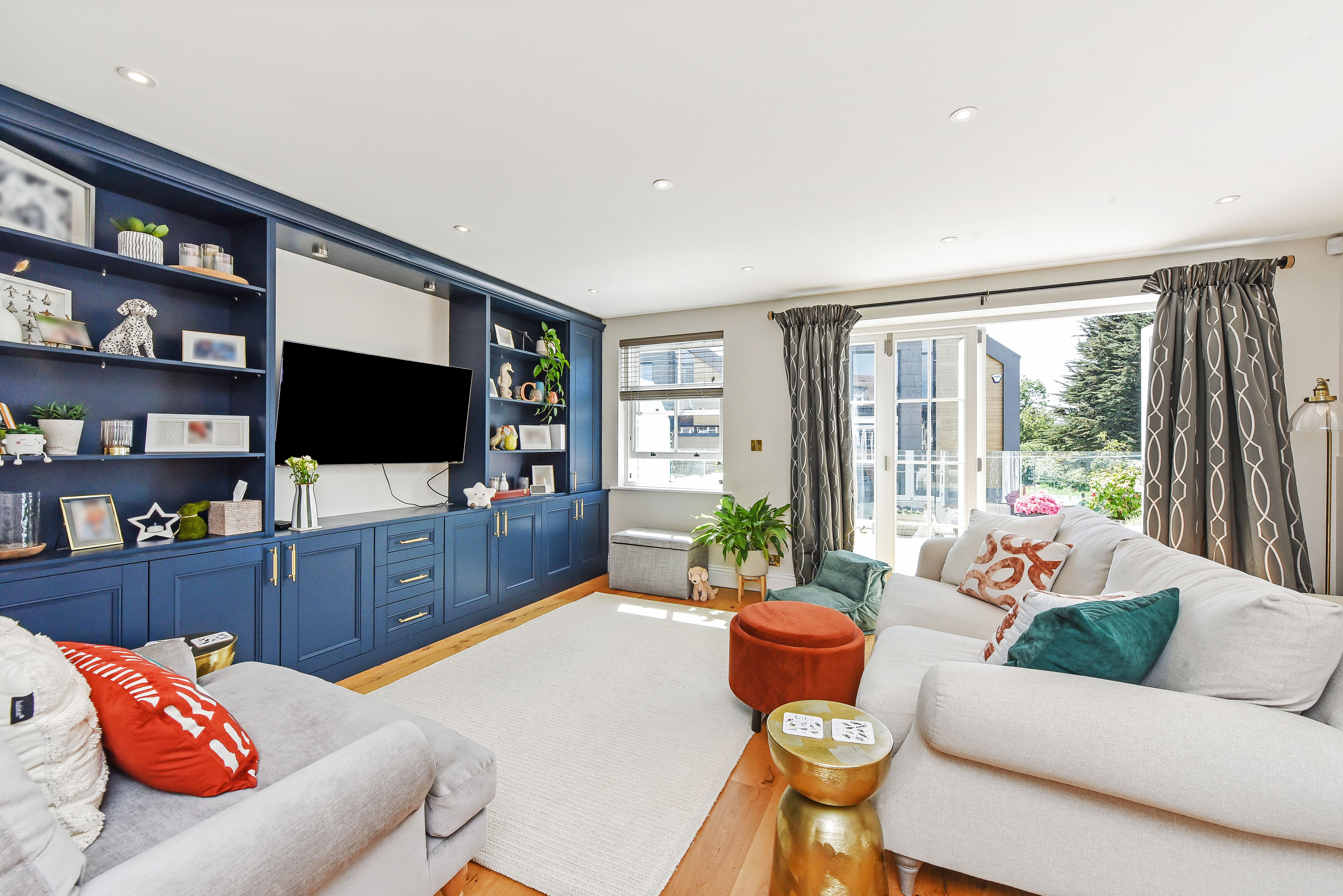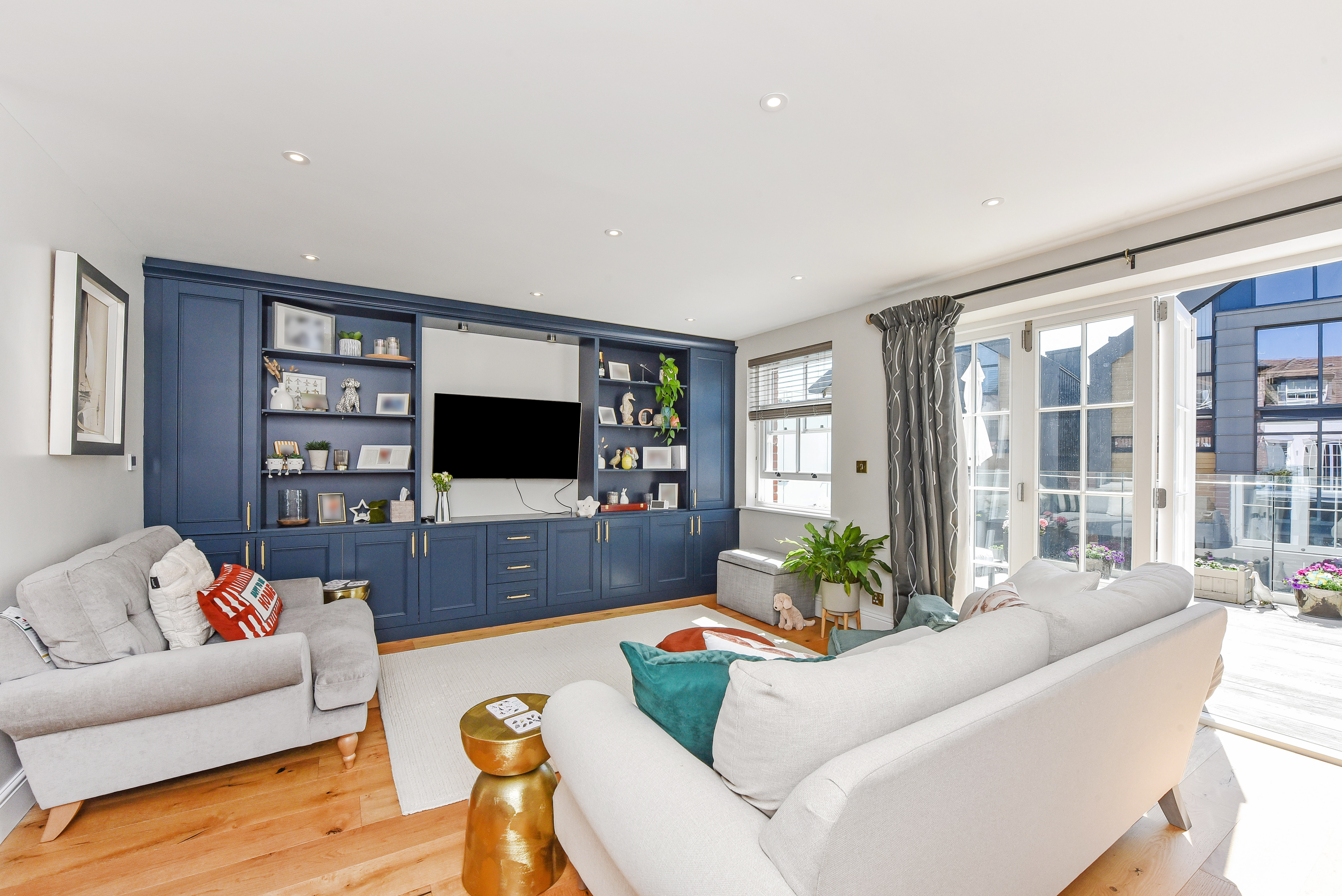 The principal living space is arranged on the first floor to maximise both light and water views. A generous open-plan sitting and dining area, complete with bespoke media cabinetry, flows seamlessly into a fully integrated kitchen fitted with premium appliances. Full-height glazed doors open onto a south-facing terrace with glass balustrades and privacy screening, an ideal extension of the living space for entertaining and summer dining.