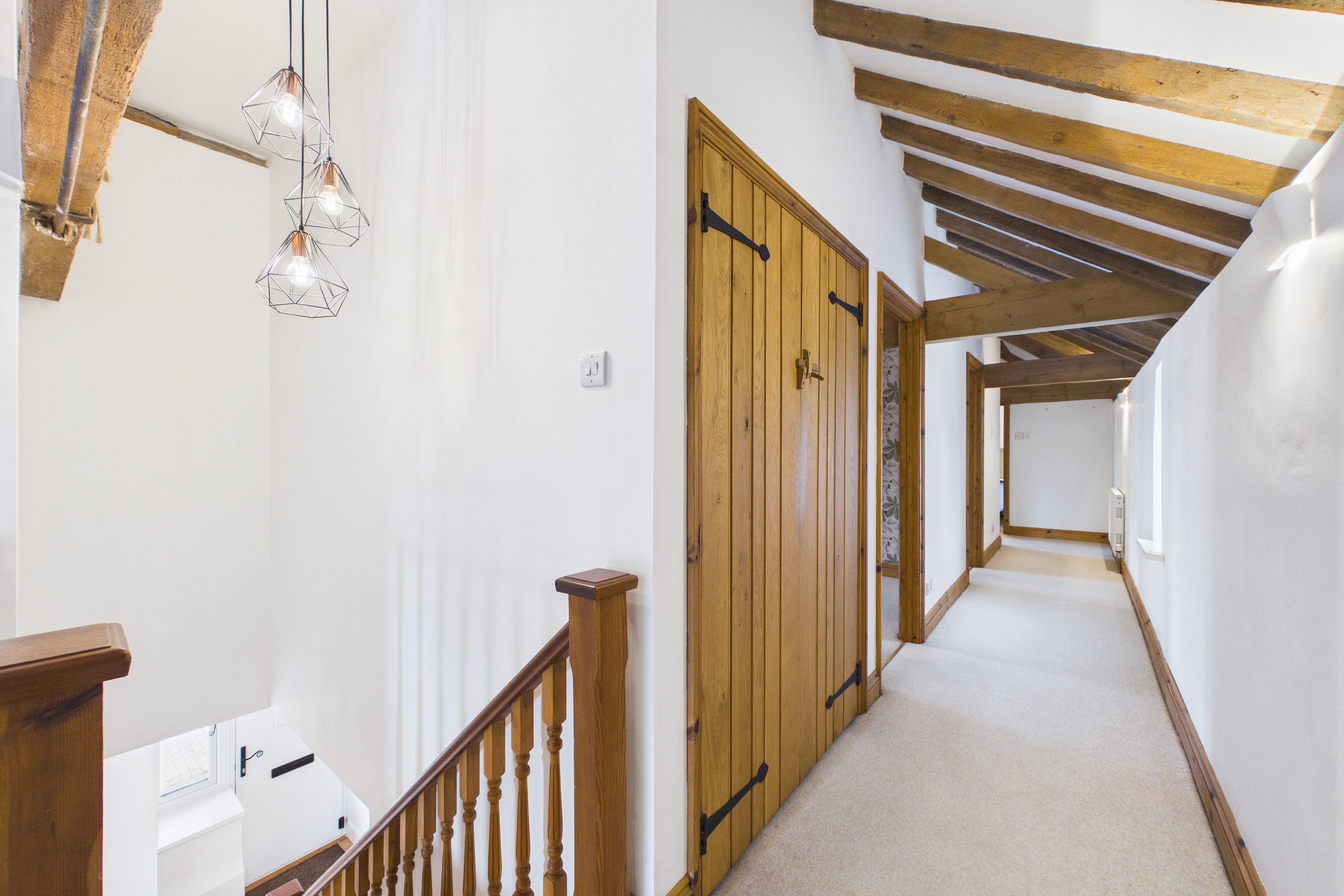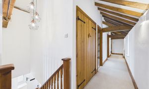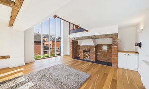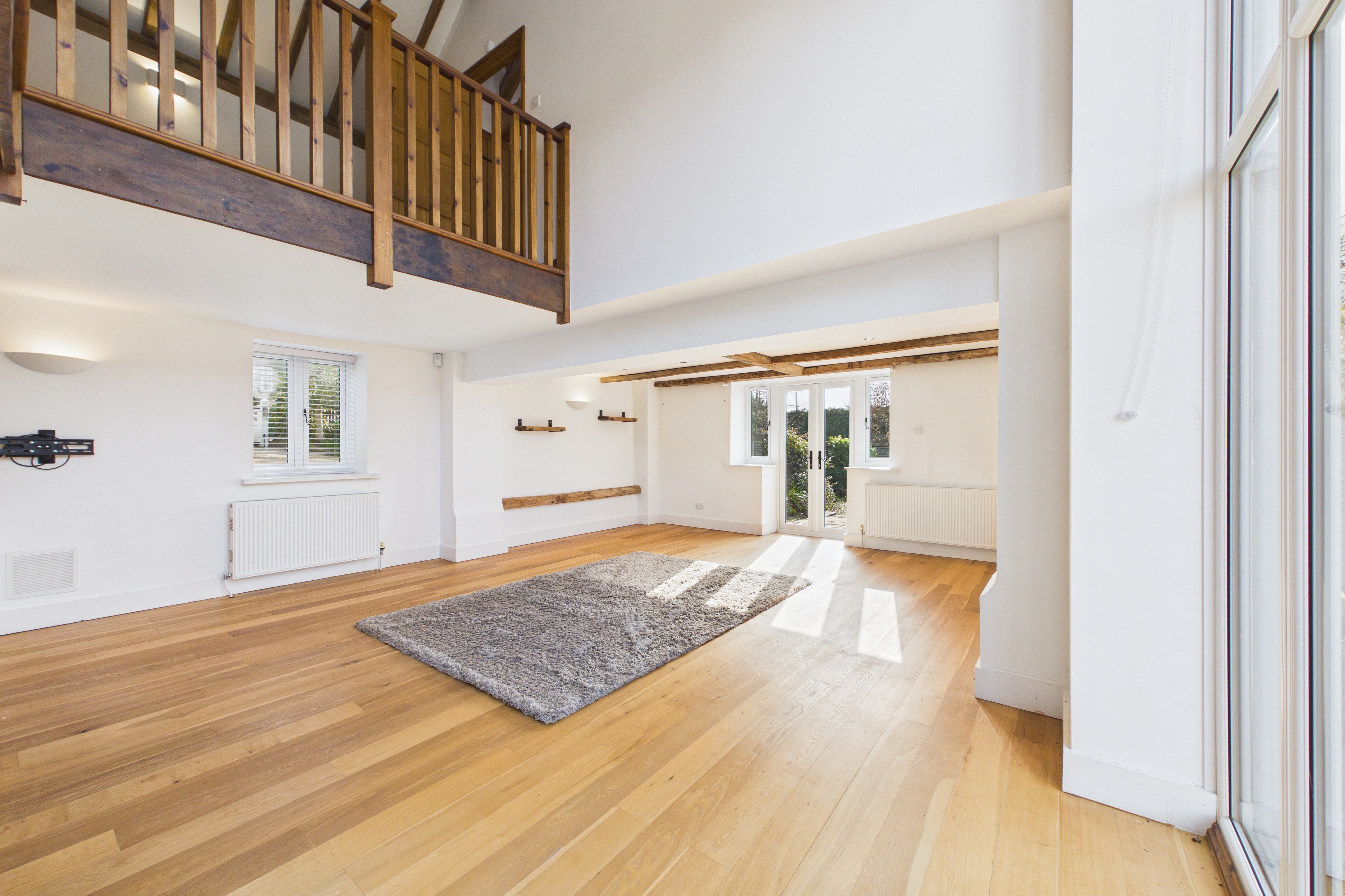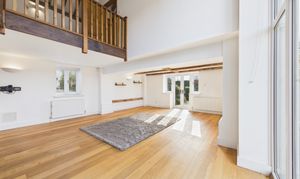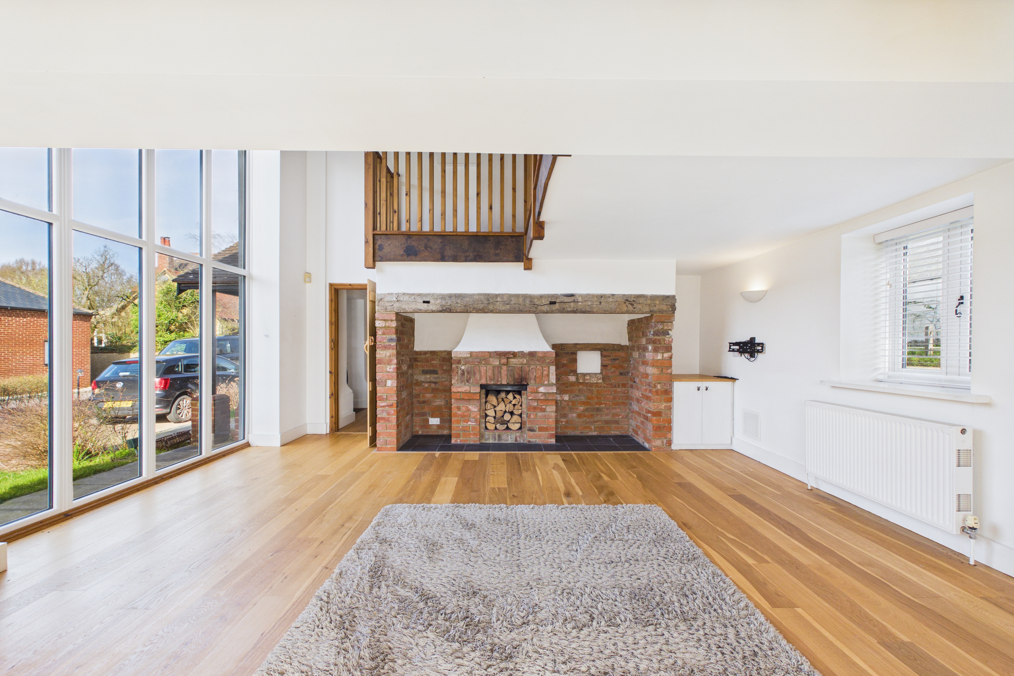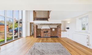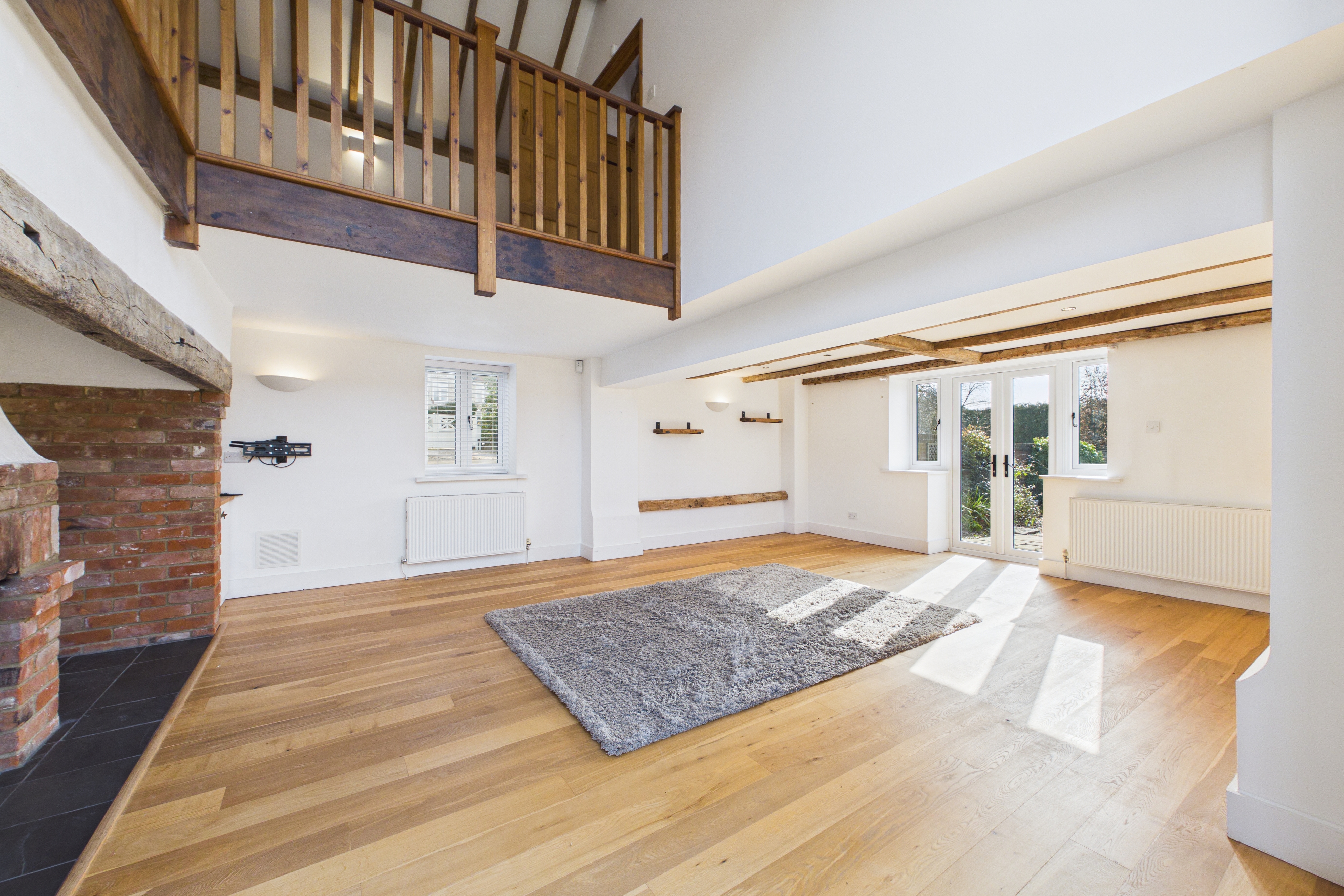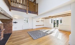 Extending to over 2,000 sq ft, the accommodation is generous, balanced and filled with natural light. The standout feature is undoubtedly the principal living room. With its vaulted ceiling rising to a beautiful gallery above, exposed beams and a striking sense of volume, it is a space that feels both impressive and comfortable. It is easy to imagine winter evenings gathered around the fireplace, or summer days with doors open to the garden and children moving freely between inside and out.