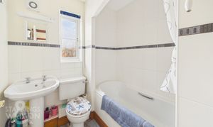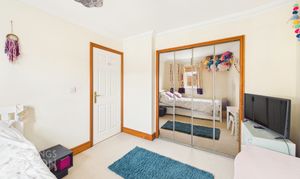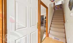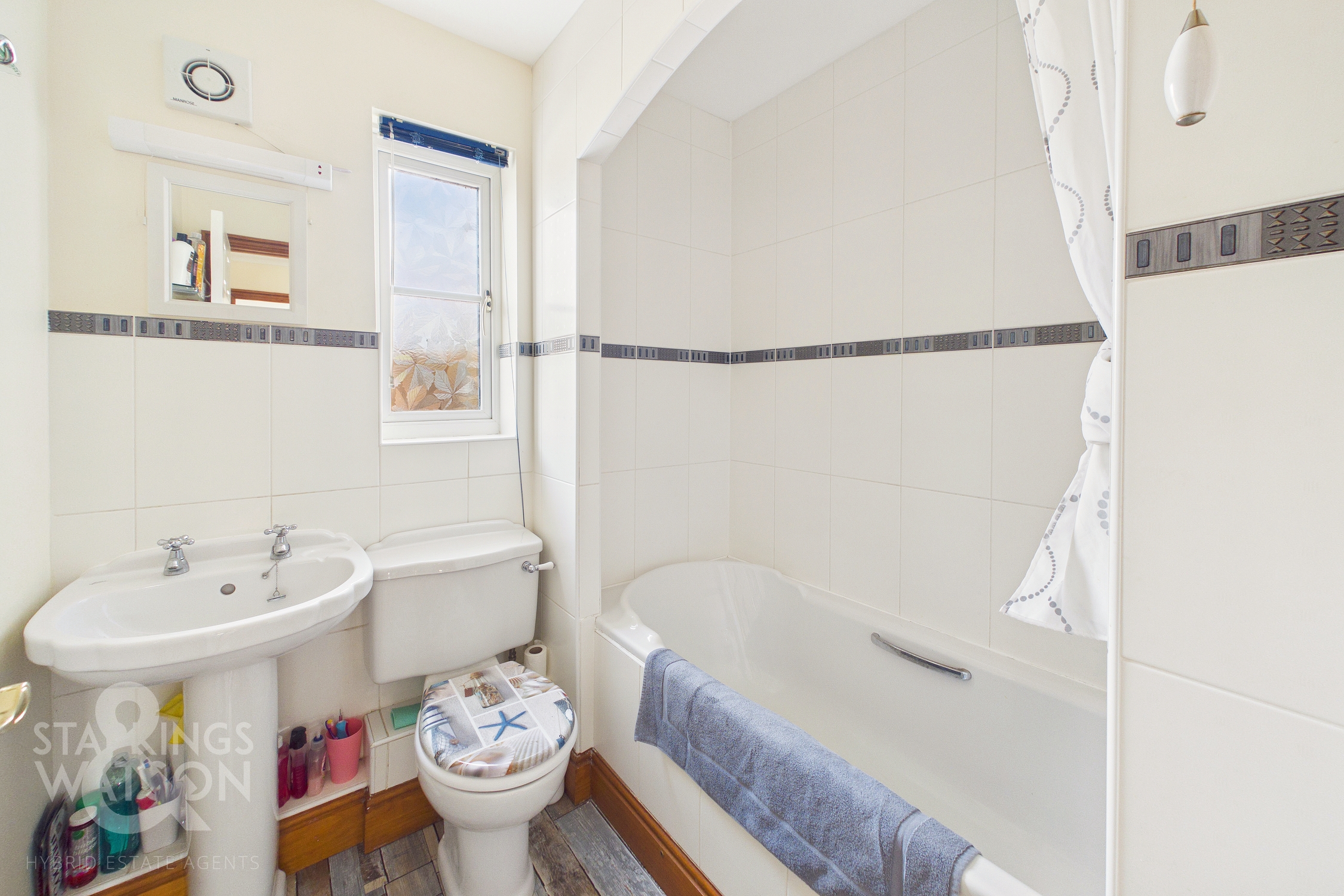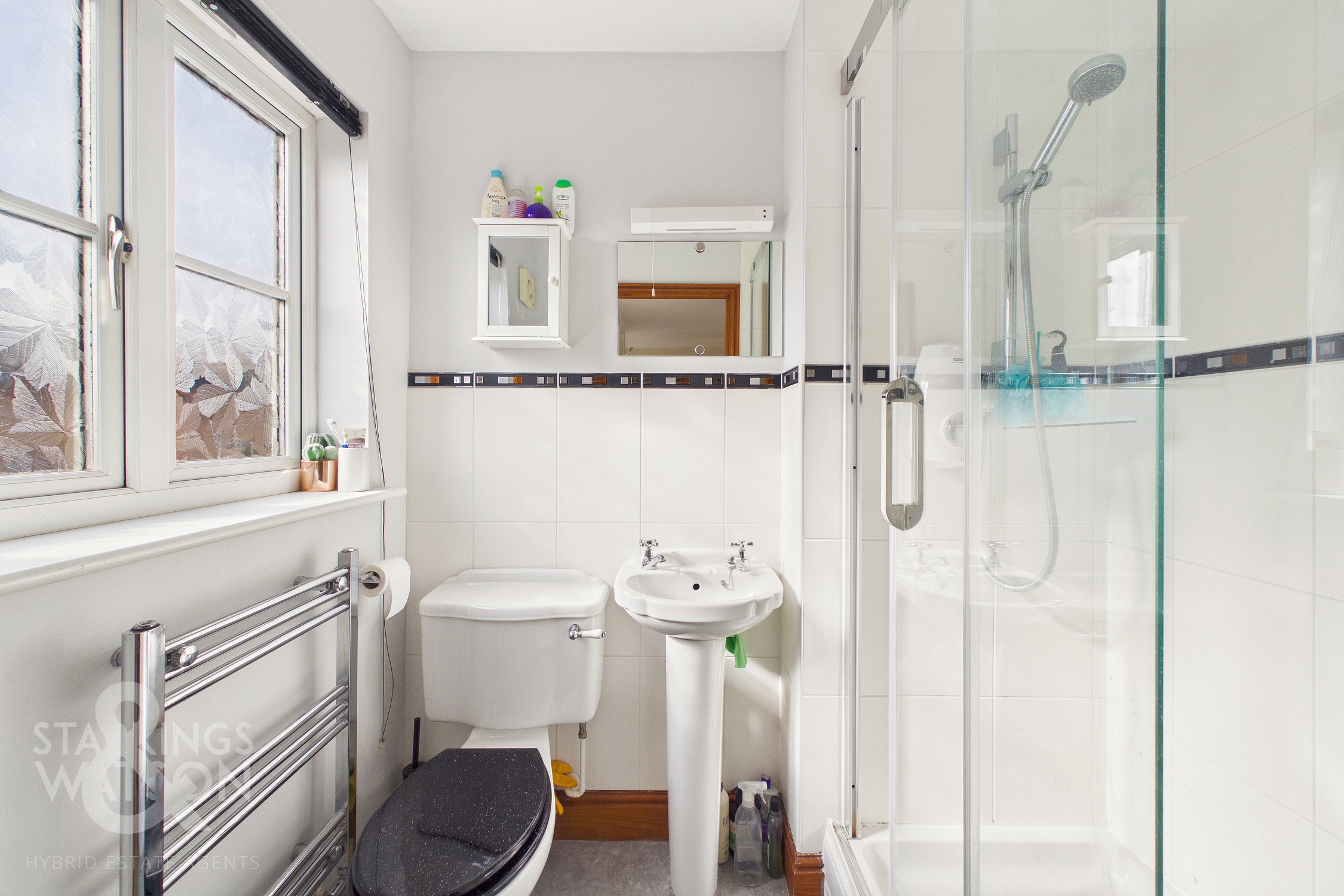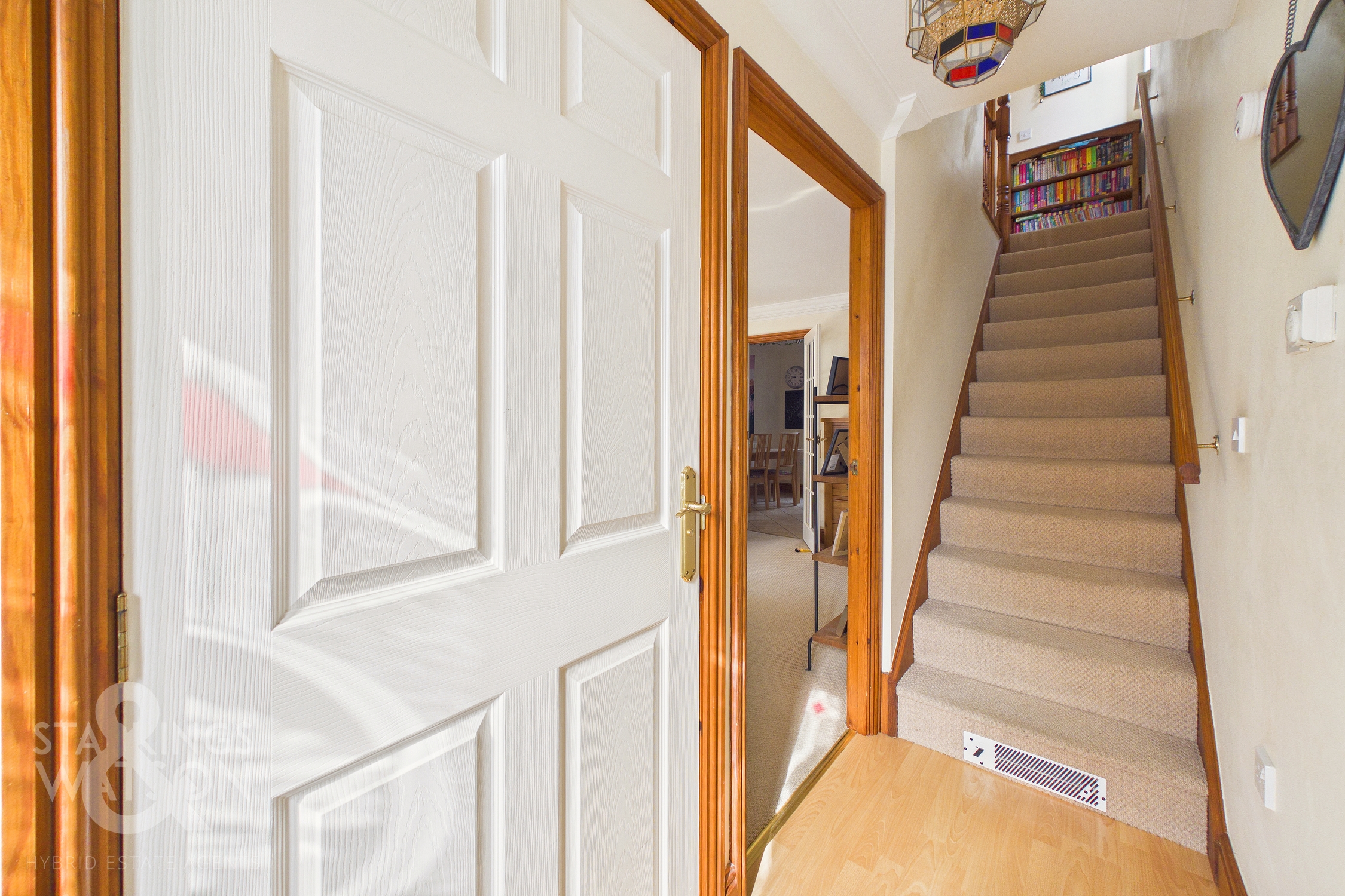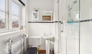 Heading upstairs, the carpeted landing offers a side facing window for natural light and a built-in airing cupboard with loft access hatch above. Doors lead off to the two double bedrooms, both finished with fitted carpet and built-in wardrobes with the main bedroom also including a door to a private ensuite shower room, with a white three piece suite including a walk-in double shower cubicle, tiled splash-backs and heated towel rail. The family bathroom completes the property with a further white three piece suite including wood effect flooring and tiled splash-backs, along with a heated towel rail.