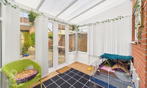 THE GREAT OUTDOORS Heading outside, the rear garden offers a low maintenance private and secluded garden, with brick walling to the side and rear, and timber fencing to the left hand boundary. A large full width patio extends from the conservatory, with an area of shingle where steps lead to the gated rear access. From the gate a communal parking area leads to the private driveway and garage, with the garage accessed via an up and over door to front, with storage above.