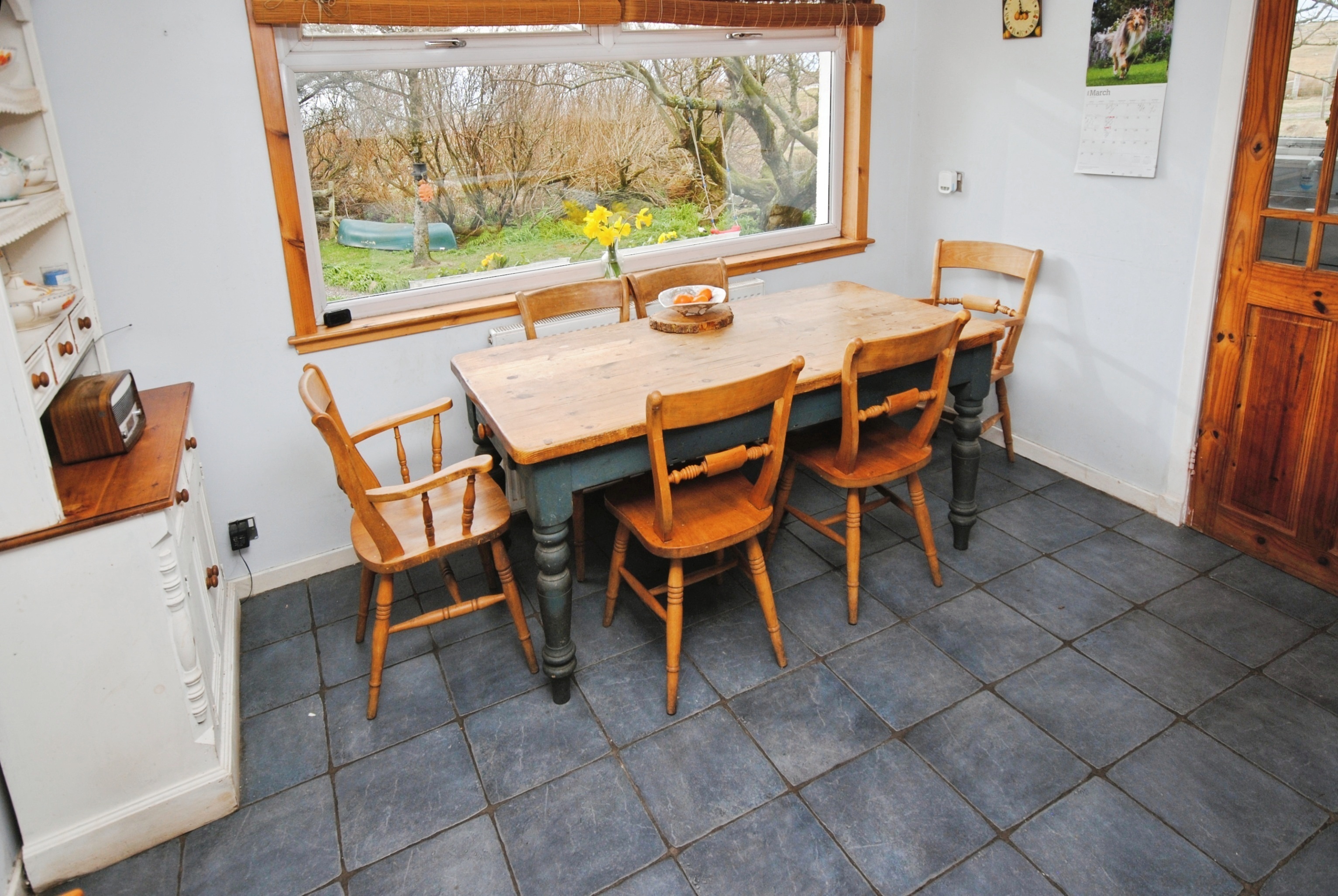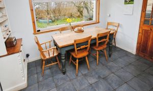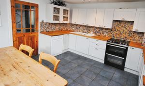 Large kitchen/diner with ample kitchen cupboards and worktops. The dining area has pleasant views over the garden to the sea.