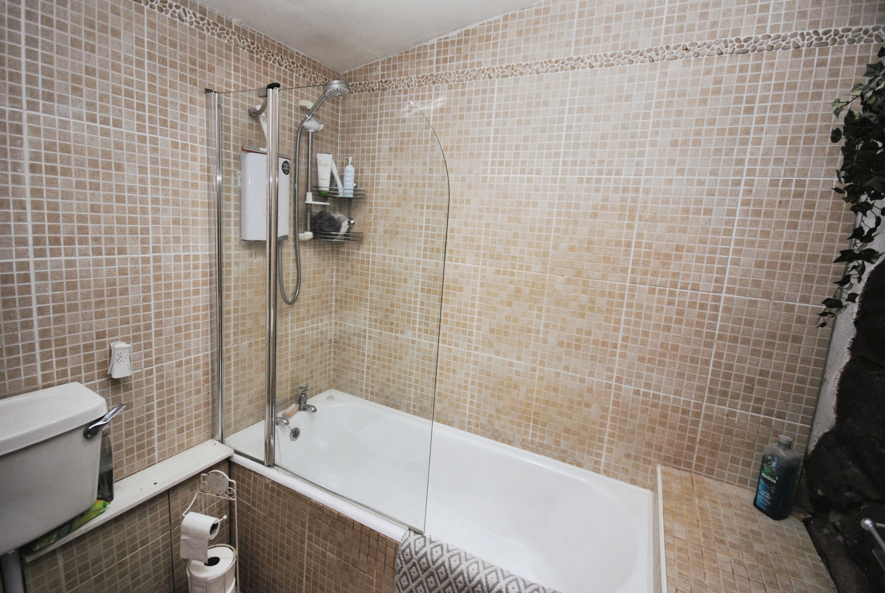 Family bathroom with electric under floor heating. Bath with electric shower over, hand-basin and WC.