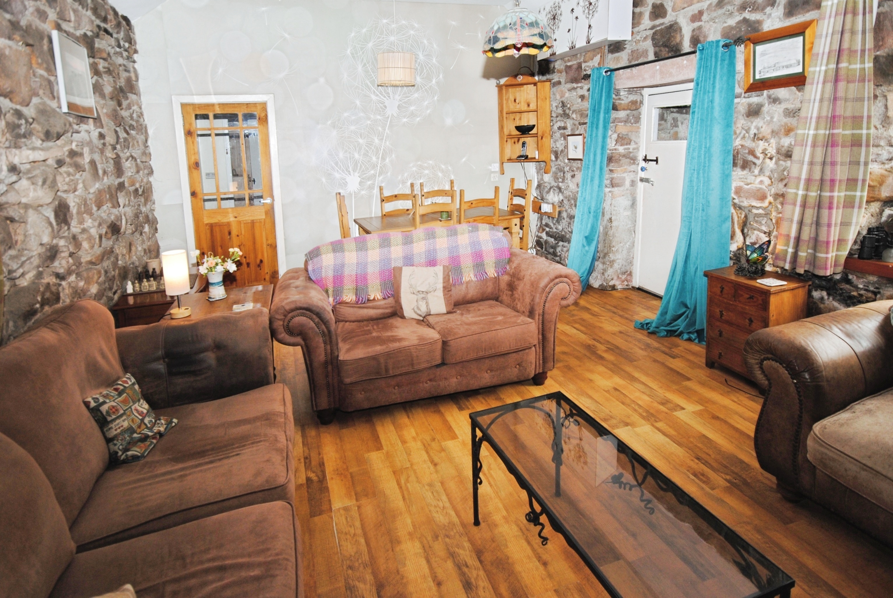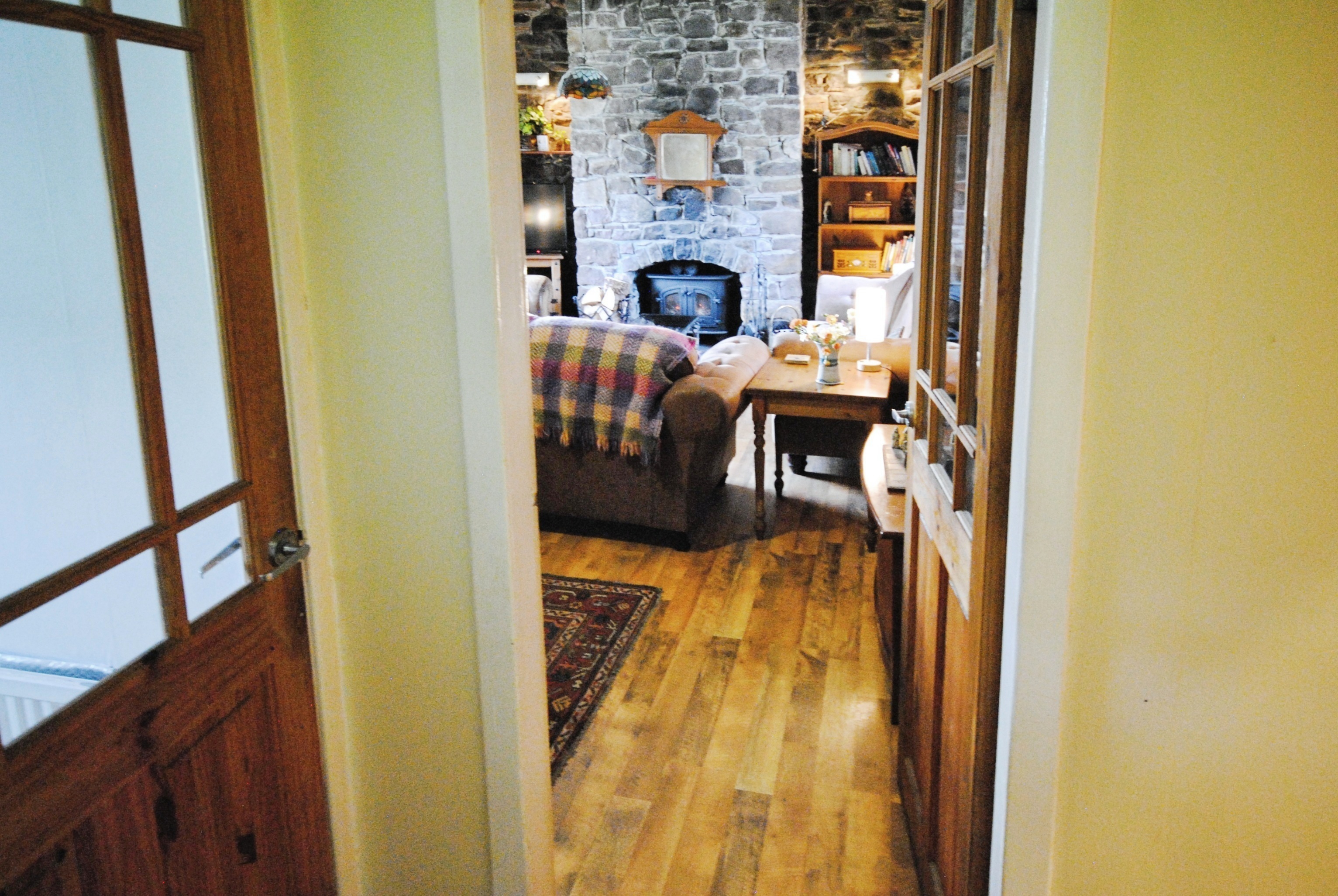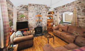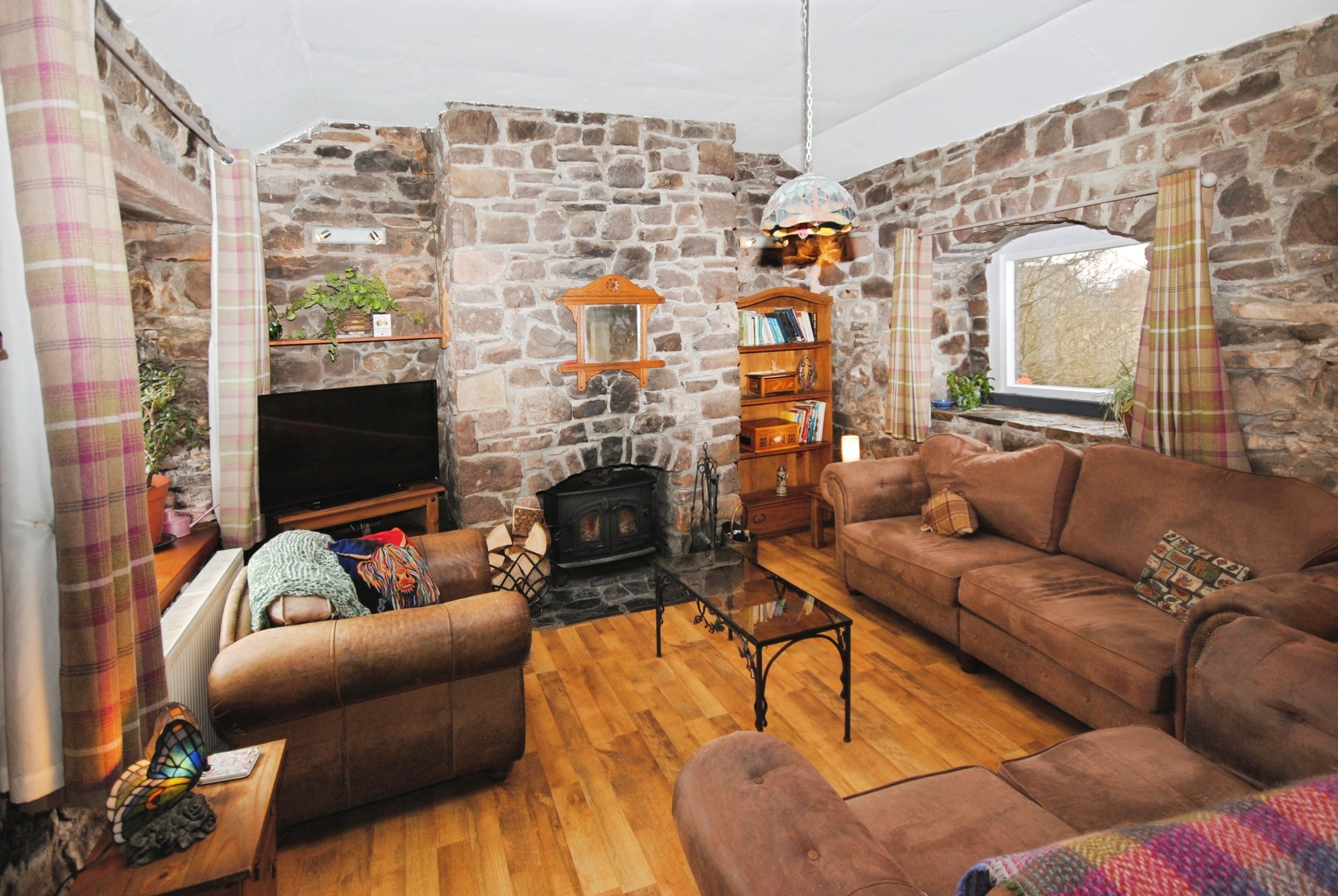 Very spacious, double-aspect living area with atmospheric exposed stone topped off with a cosy log burning stove.