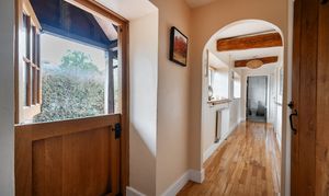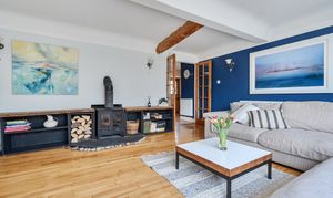 An attractive open porch leads into a welcoming entrance hall that extends along the northern side of the property. From here, glazed double doors open into a peaceful, sun-filled sitting room featuring a wood-burning stove and bi-folding doors that flow seamlessly into a distinctive five-sided conservatory, creating a superb connection between the living space and garden.