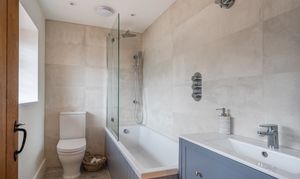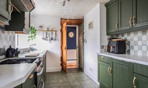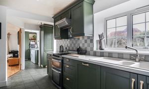 The dual-aspect dining room enjoys south and west-facing views and leads through to the kitchen and adjoining utility room. The kitchen is fitted with a range of classic shaker-style units, providing both character and practicality.