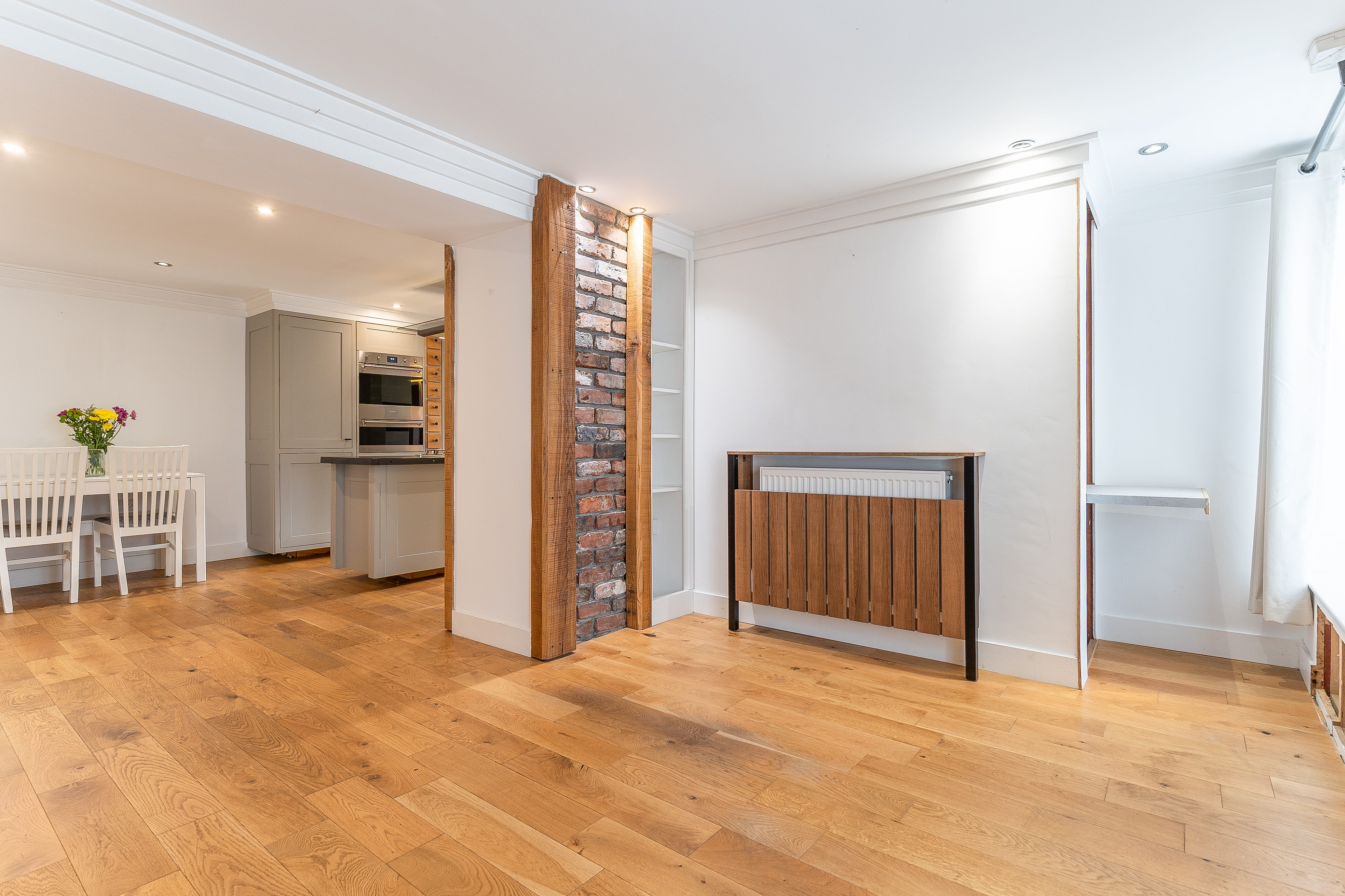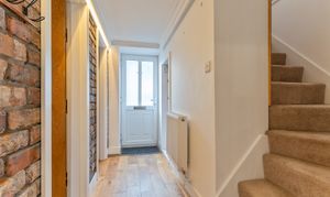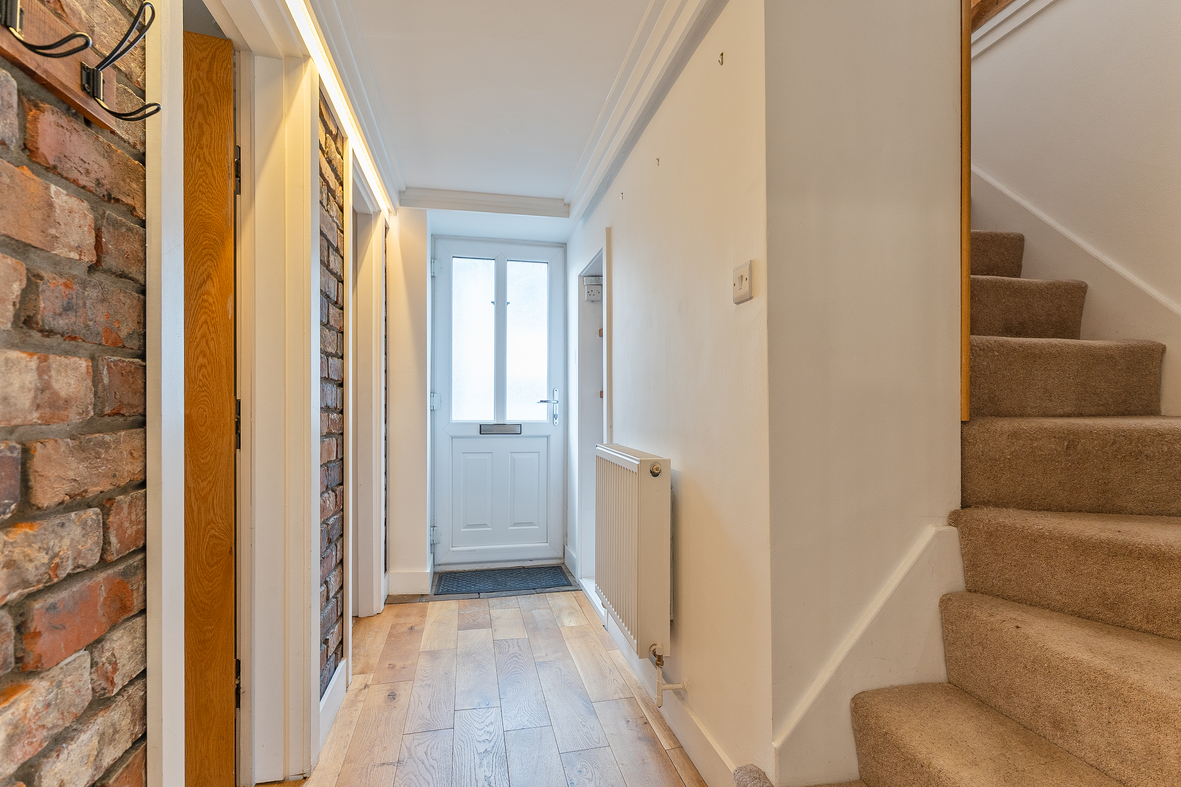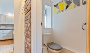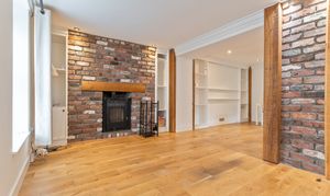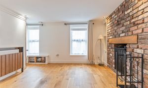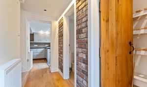 You enter the property through a welcoming hallway, which features a cloakroom and storage cupboard to the right and stairs to the first floor on the left. Continuing ahead, you enter the main living area — a bright and inviting kitchen/diner that opens seamlessly into the living room. The kitchen is well-maintained and thoughtfully designed, offering ample storage and workspace, with space for a dining table and chairs, making it ideal for family meals or entertaining. The living room is equally impressive, decorated in neutral tones and featuring exposed brick details that add character and warmth to the space. Large windows allow plenty of natural light to fill the room, creating a bright, open feel that’s perfect for relaxing or socialising.