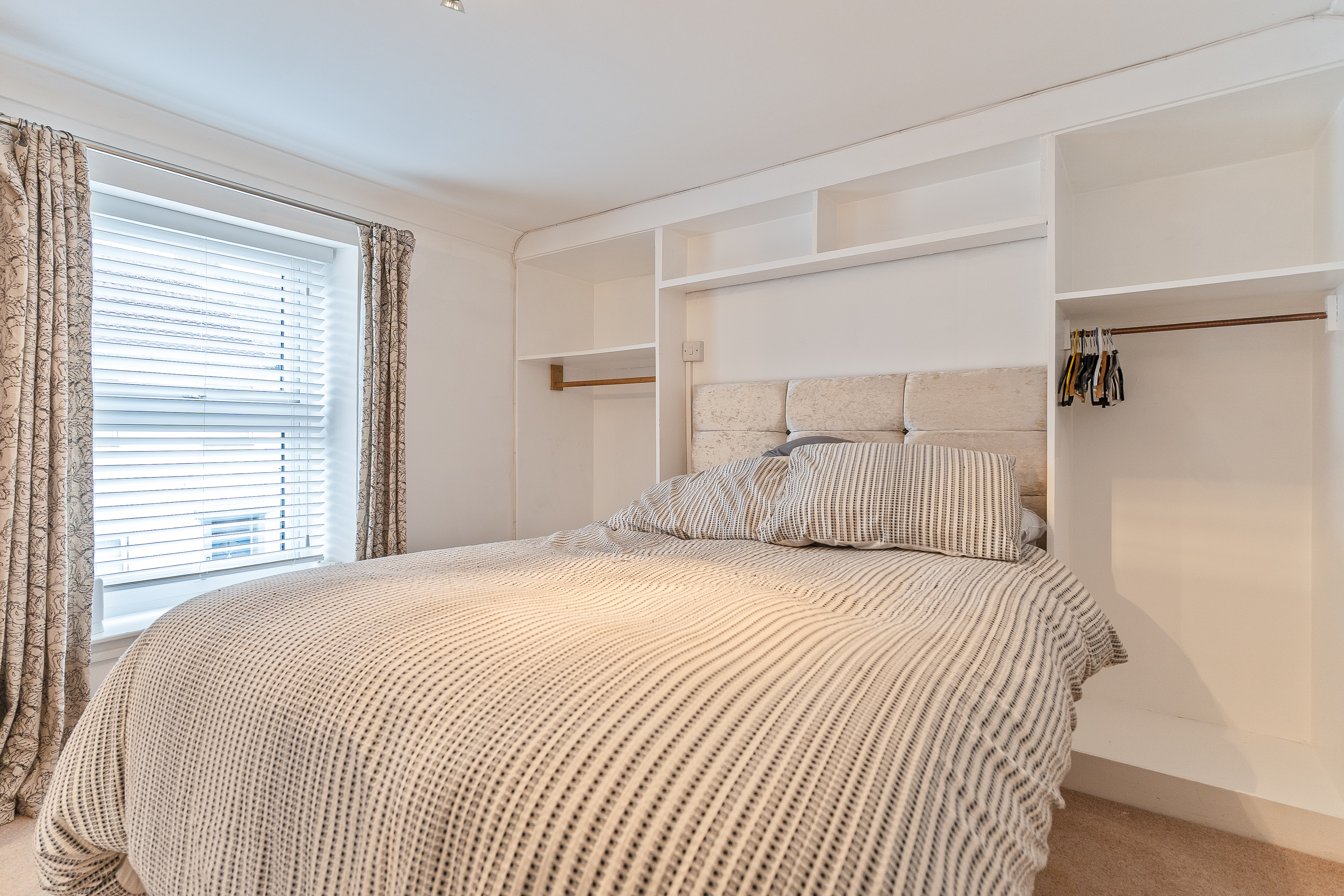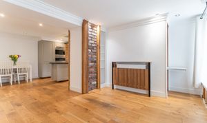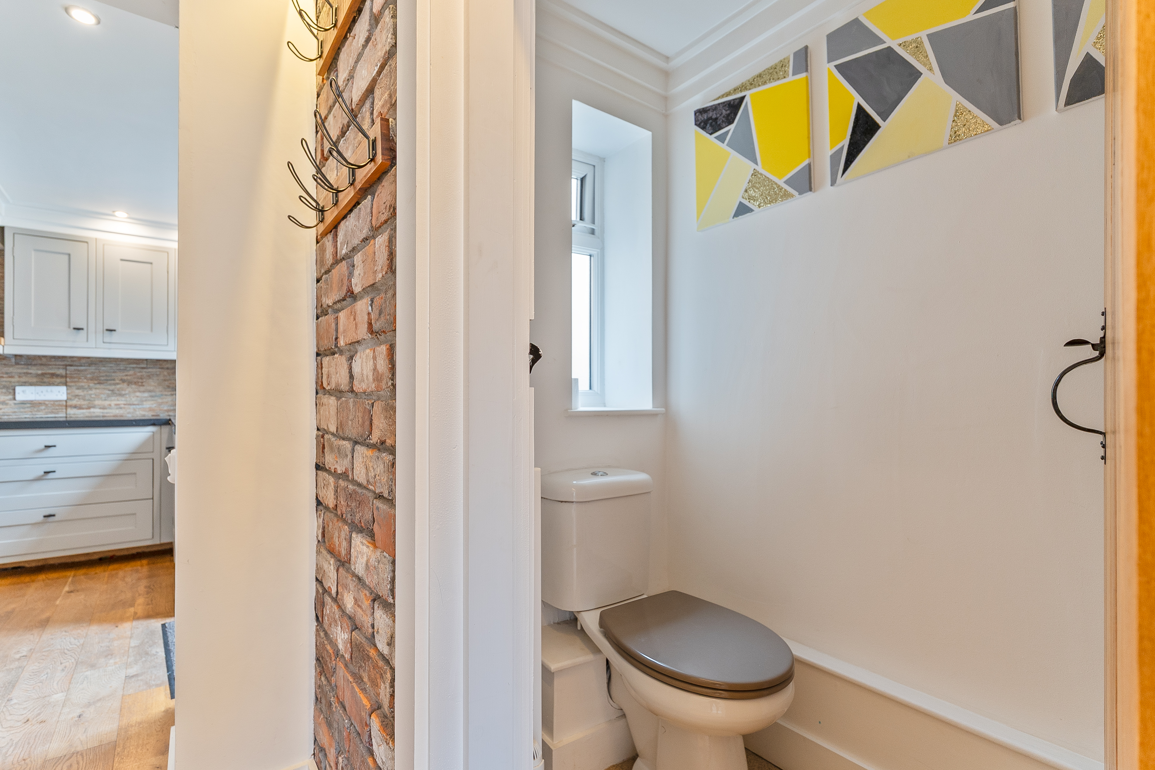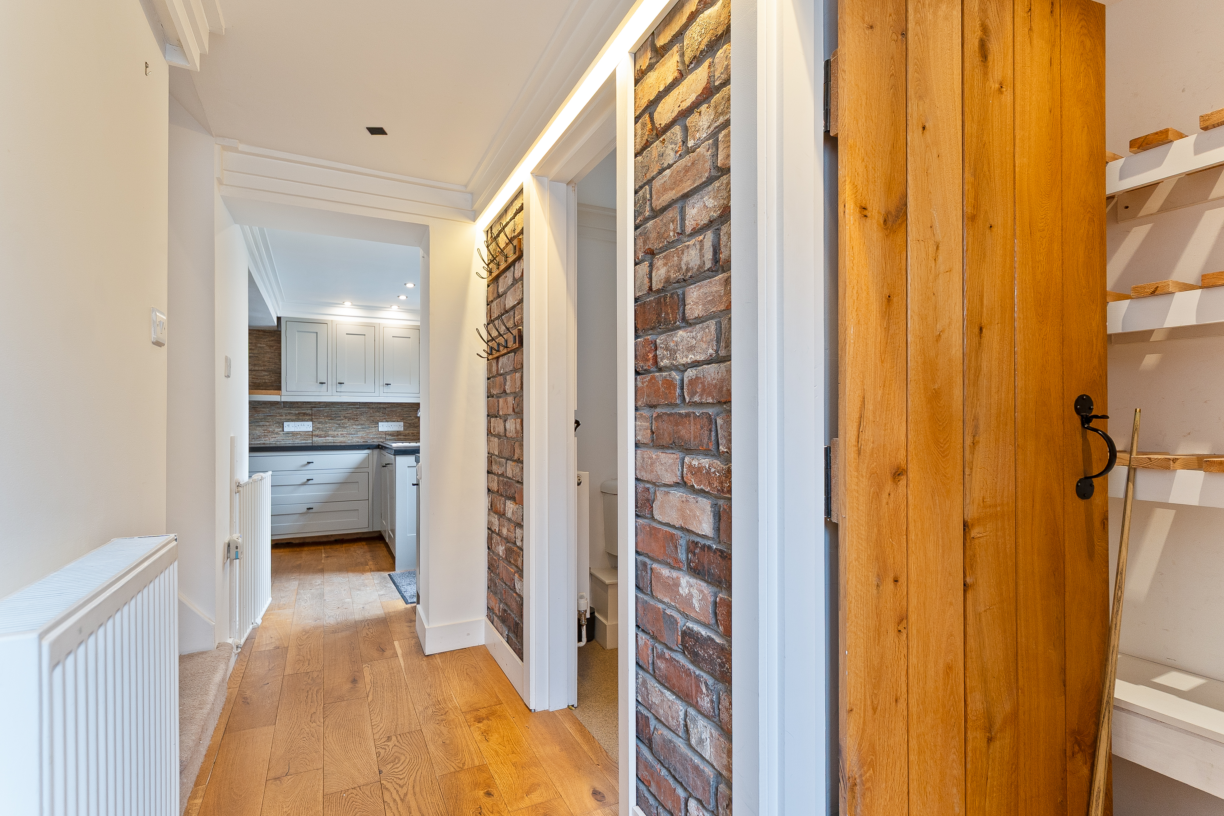 You enter the property through a welcoming hallway, which features a cloakroom and storage cupboard to the right and stairs to the first floor on the left. Continuing ahead, you enter the main living area — a bright and inviting kitchen/diner that opens seamlessly into the living room. The kitchen is well-maintained and thoughtfully designed, offering ample storage and workspace, with space for a dining table and chairs, making it ideal for family meals or entertaining. The living room is equally impressive, decorated in neutral tones and featuring exposed brick details that add character and warmth to the space. Large windows allow plenty of natural light to fill the room, creating a bright, open feel that’s perfect for relaxing or socialising.