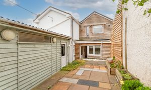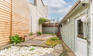 Externally, the property offers excellent outdoor and storage options. To the rear, there is an enclosed garden, featuring a raised patio area ideal for outdoor seating and dining. The garden provides a peaceful space to relax and enjoy during the warmer months. From the garden, there is rear access to the garage, which is currently utilised as a large workshop and utility area, offering versatility for storage, hobbies, or further development potential.