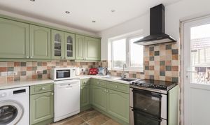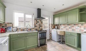 Window to rear, range of wall and base units with laminate worktops over, part tiling to walls, single bowl and drainer sink, space for cooker with hood over, space for fridge and freezer, oil boiler, plumbing for washing machine and dishwasher, radiator, tiled floor and door leading to rear garden.