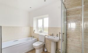 Window to front, low level WC, panelled bath, separate shower cubicle with electric shower over, part tiling to walls, extractor fan, tiled floor, heated towel rail.