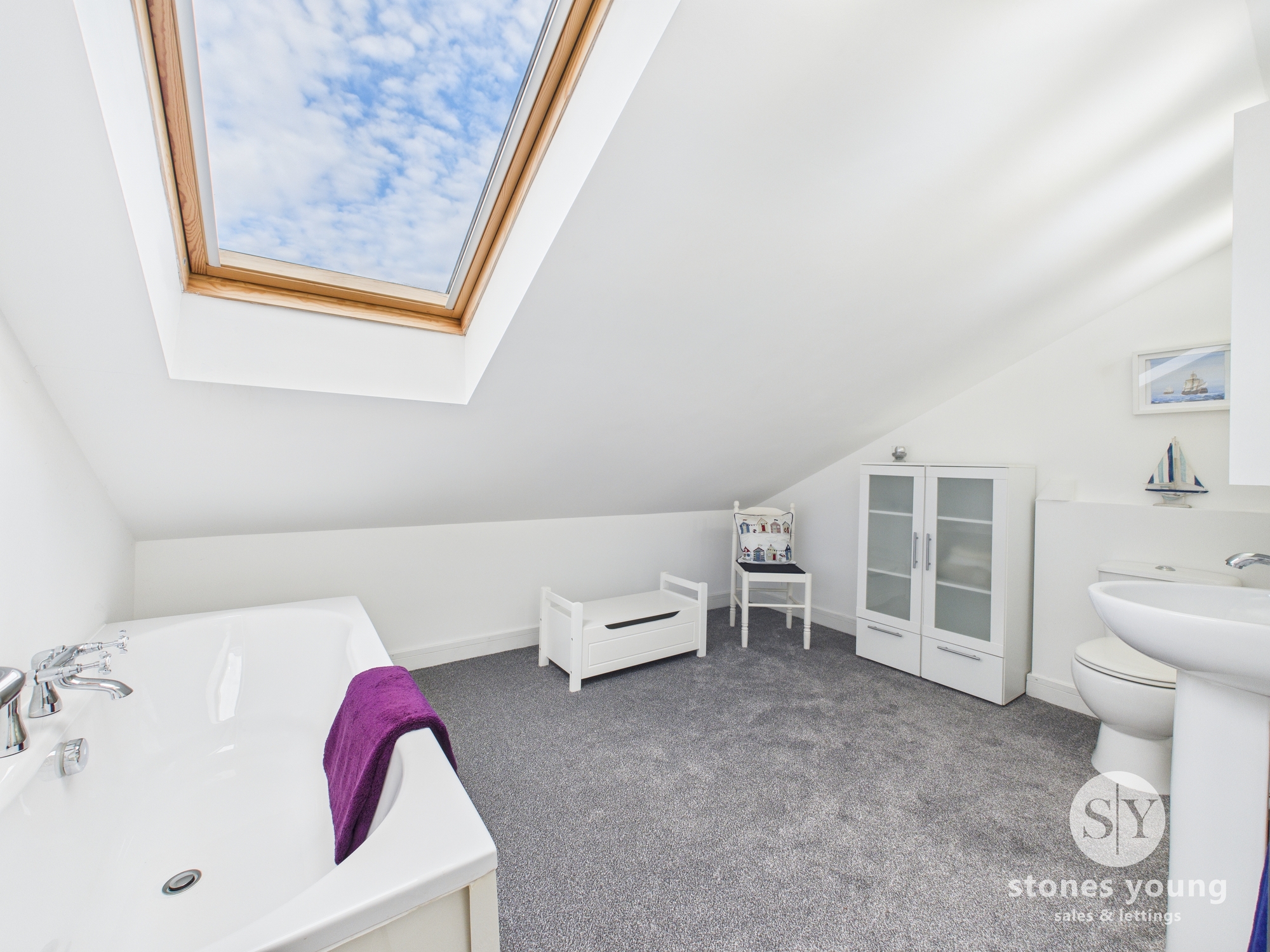 Three piece in white, carpet flooring, velux, heated towel radiator.