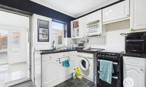 Range of fitted wall and base units with contrasting work surfaces, stainless steel sink and drainer, space for electric oven and fridge, plumbed for washing machine, tiled splashbacks, vinyl flooring. uPVC double glazed window and door.