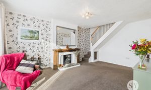 Carpet flooring, decorative fire with stone hearth and wood surround, stairs to first floor, uPVC double glazed window, panel radiator.