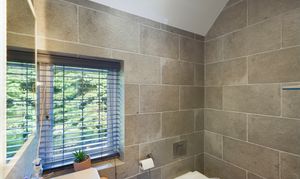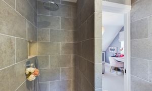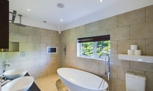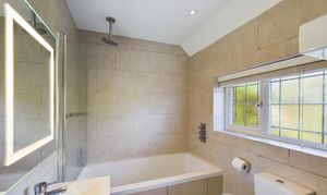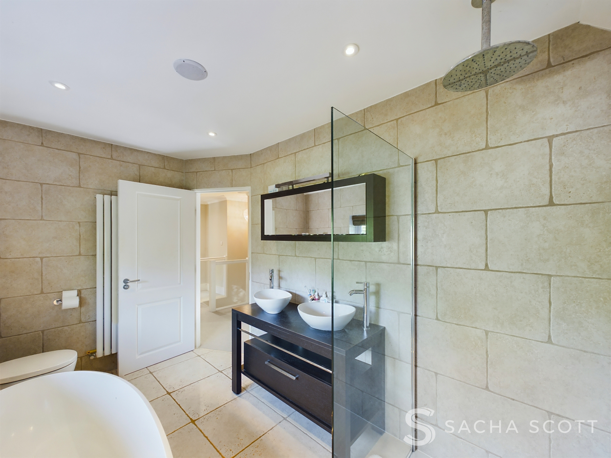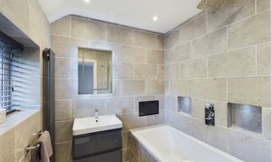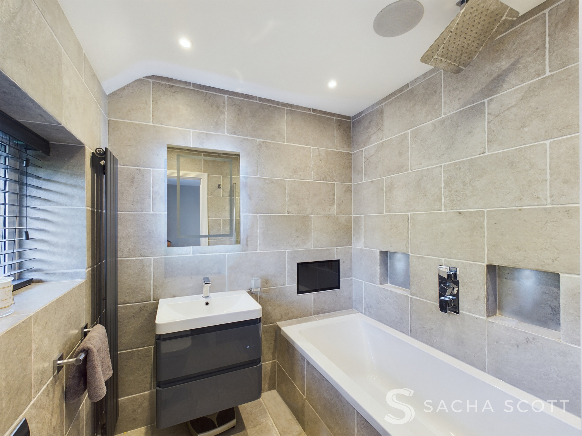 Fully tiled and immaculately presented throughout, the en-suite bathroom benefits from underfloor heating, built in speaker, TV, a vanity sink, WC, shower over bath with screen and a modern radiator.