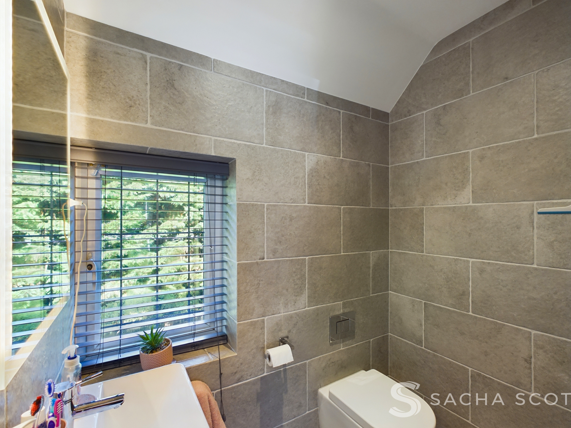 Located off of the main entrance hall, the guest WC is neutrally presented and benefits from a vanity sink, WC and a heated towel rail.