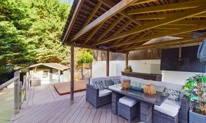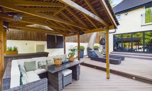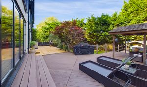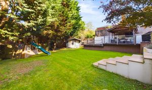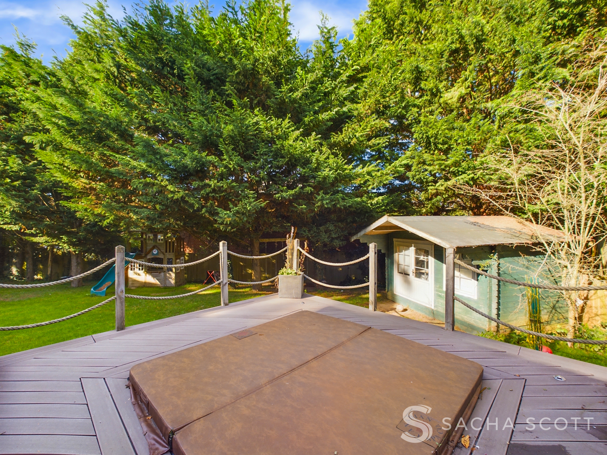 North facing 70ft x 85ft garden with large patio area for entertaining and barbecues, large composite decking area comprising of sunbathing area, external dining area with bar and heaters, and a hot tub area surrounded by clever rope and toughened glass balustrades, the decking area benefits from lighting and electrical sockets. Next to the decking area you have landscaped retaining wall plant beds with further lighting illuminating the plants and steps with more sockets available. The large lawn area is accessible via the decking area as well as the grand central steps leading down from the rear patio area. The lawned area also consists of up lights to illuminate the trees at night, a swing area for the children, a large shed, side access to the front driveway, access to the basement and storage area under the decking.